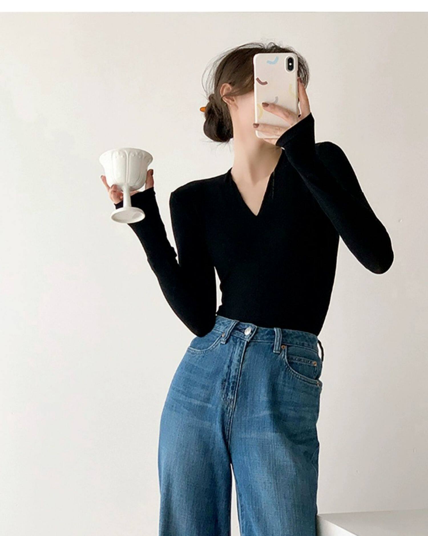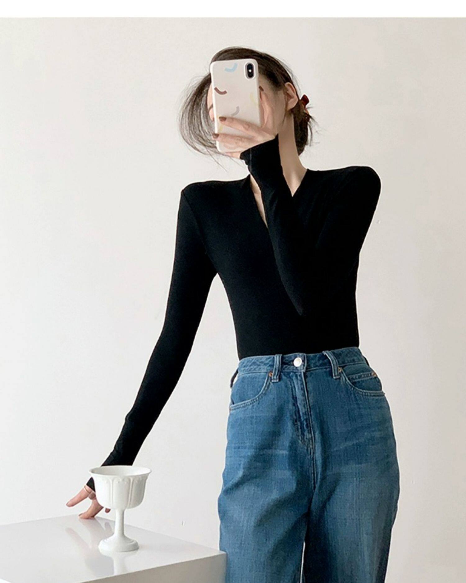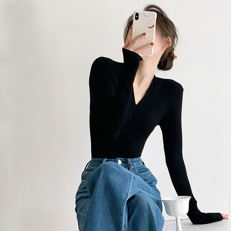 Черный базовый приятный телу осенний свитер, трикотажный лонгслив, V-образный вырез, облегающий крой, яркий броский стиль