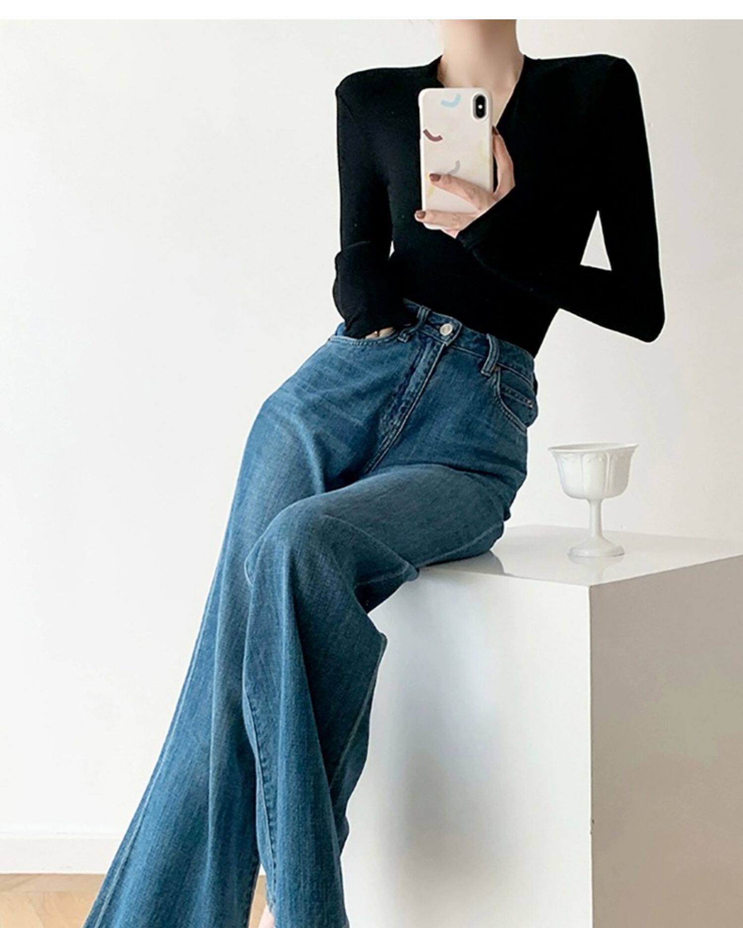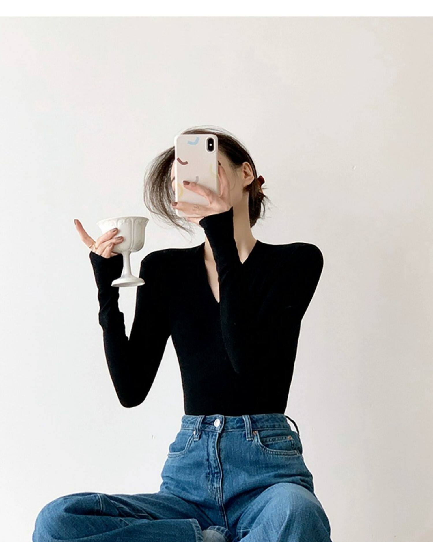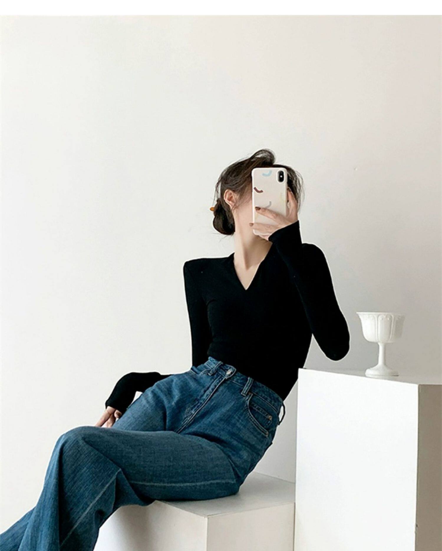 Черный базовый приятный телу осенний свитер, трикотажный лонгслив, V-образный вырез, облегающий крой, яркий броский стиль
