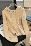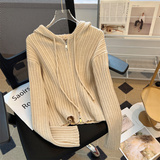 Трикотажный демисезонный короткий свитер с капюшоном, кардиган, лонгслив, облегающий крой