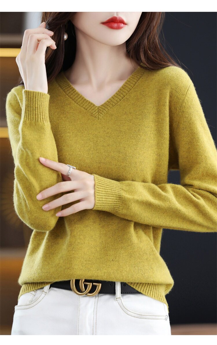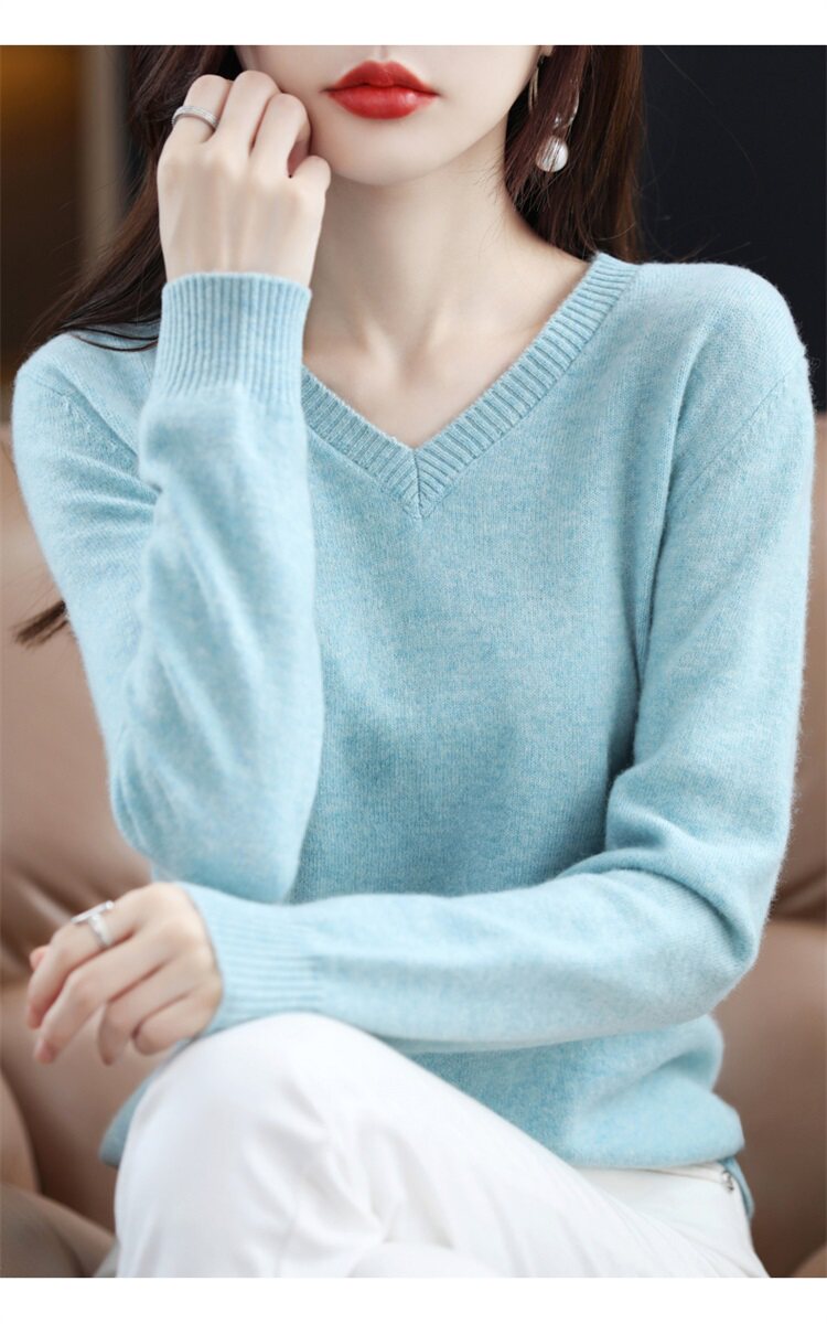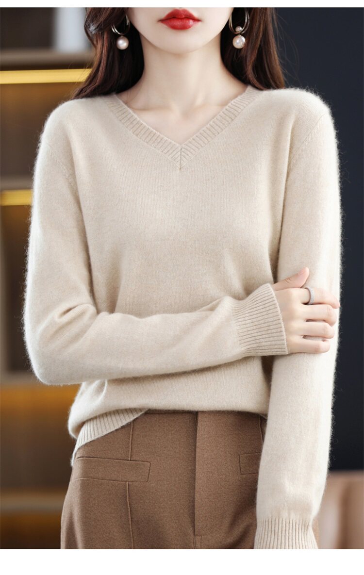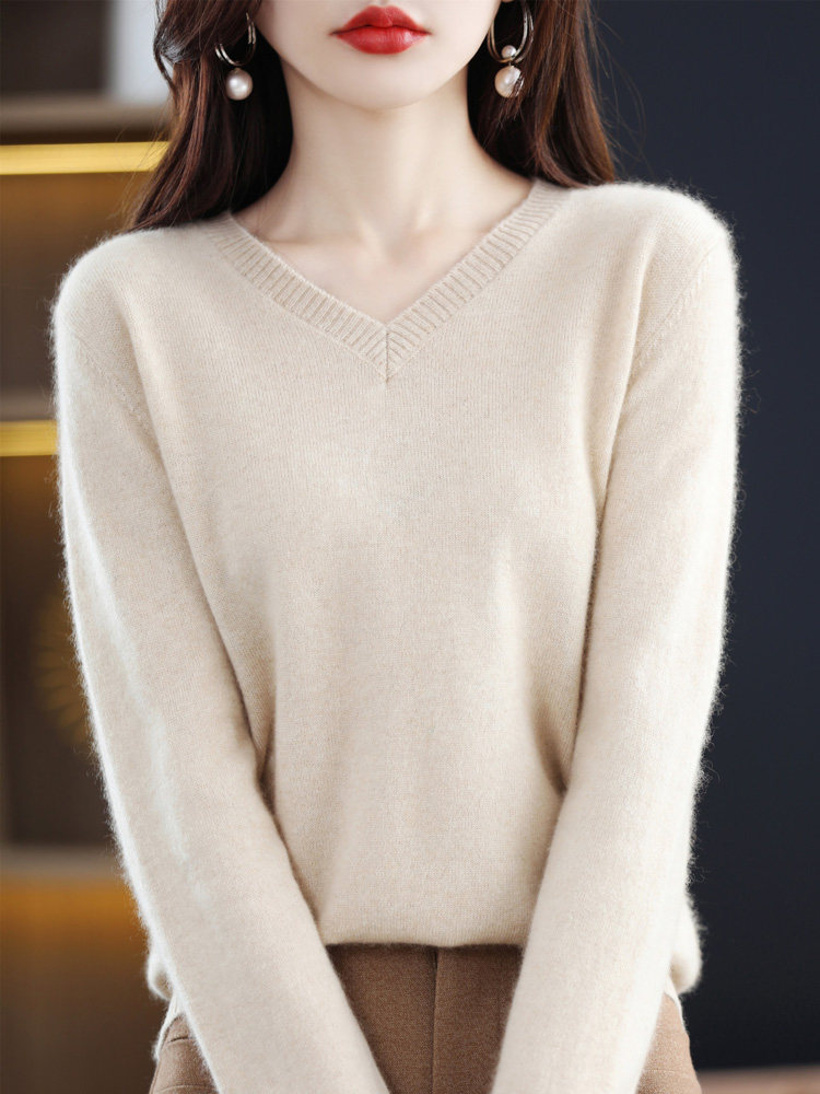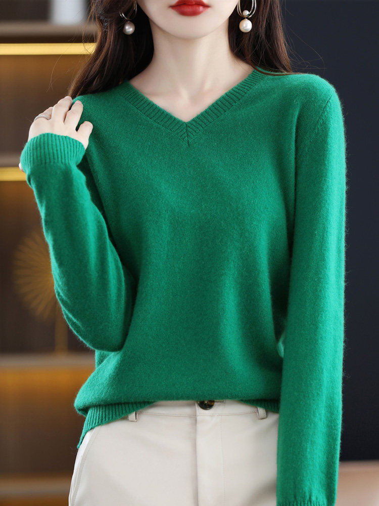 Шерстяной свитер, трикотажный осенний лонгслив, V-образный вырез, оверсайз, свободный крой