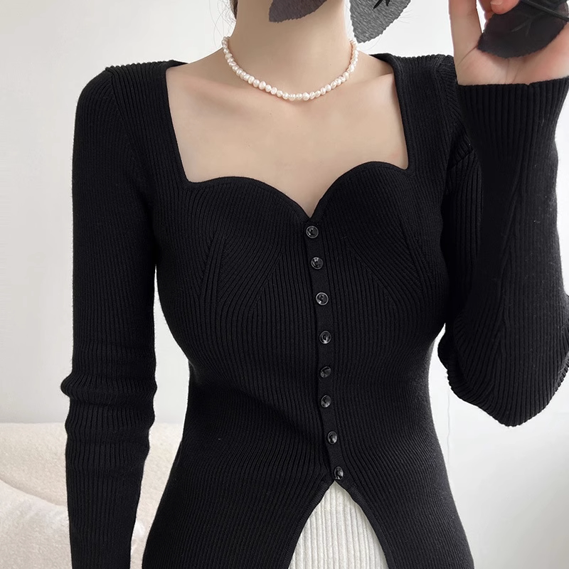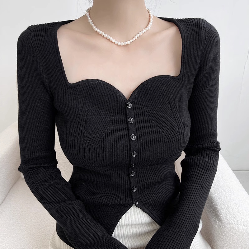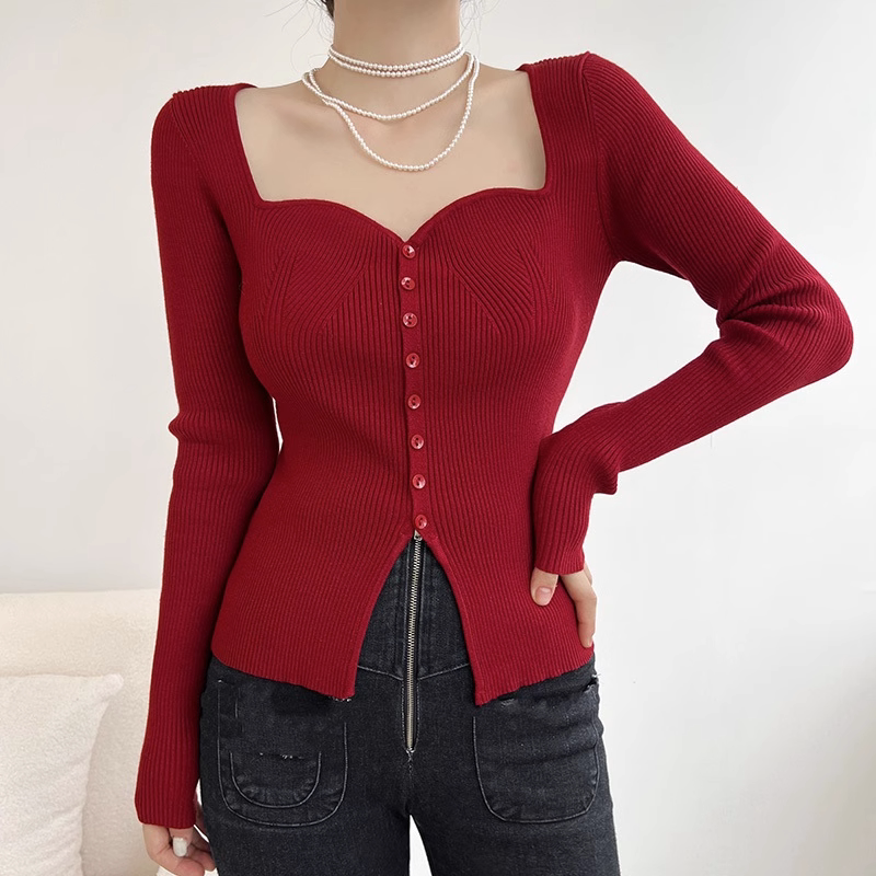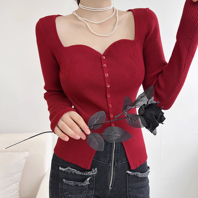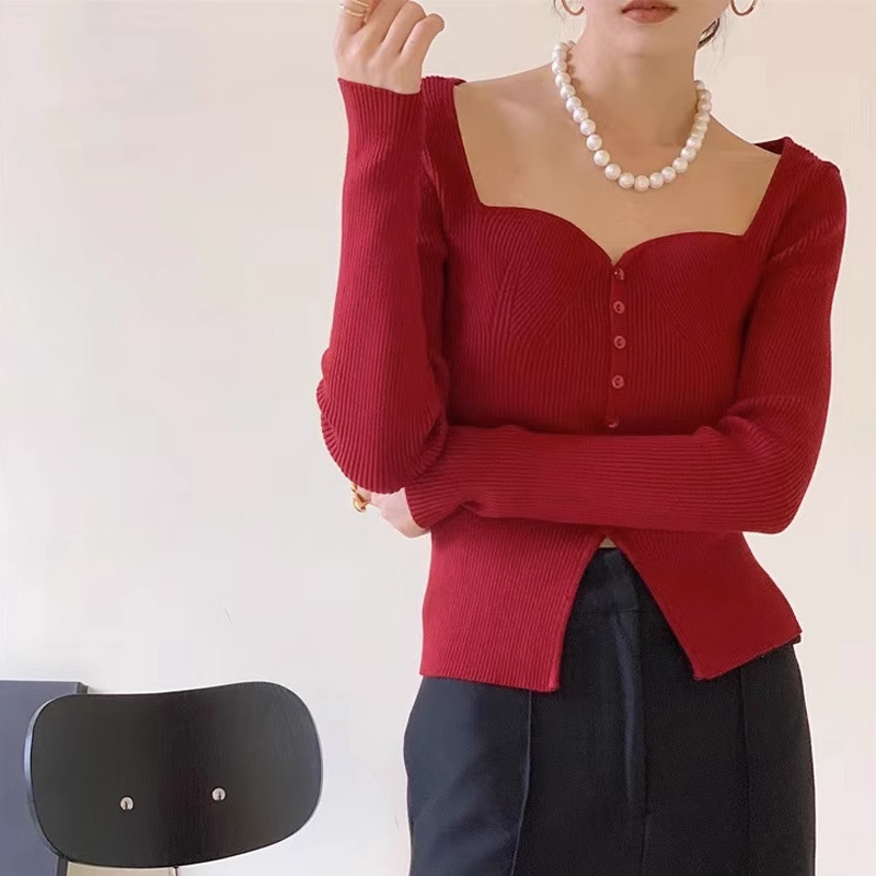 Бордовый базовый приятный телу демисезонный трикотажный свитер, в западном стиле, изысканный стиль, французский стиль, квадратный вырез