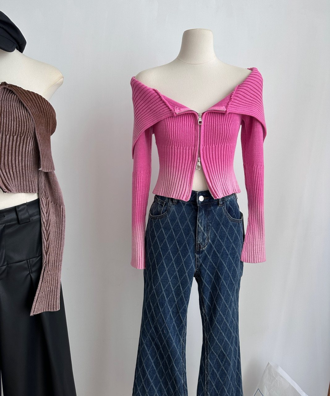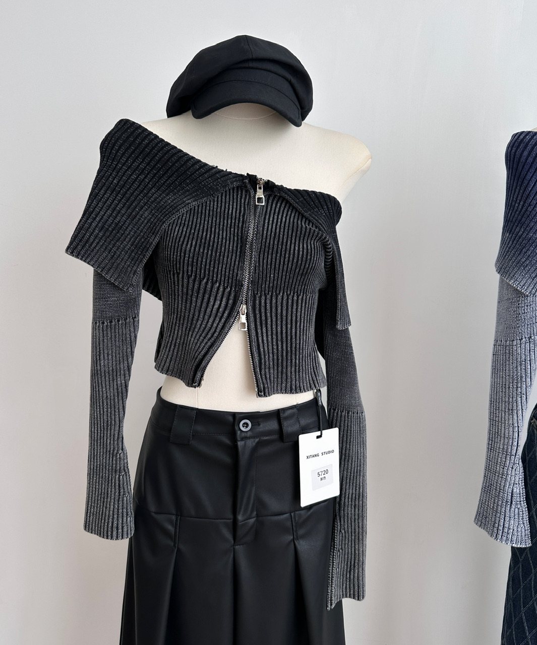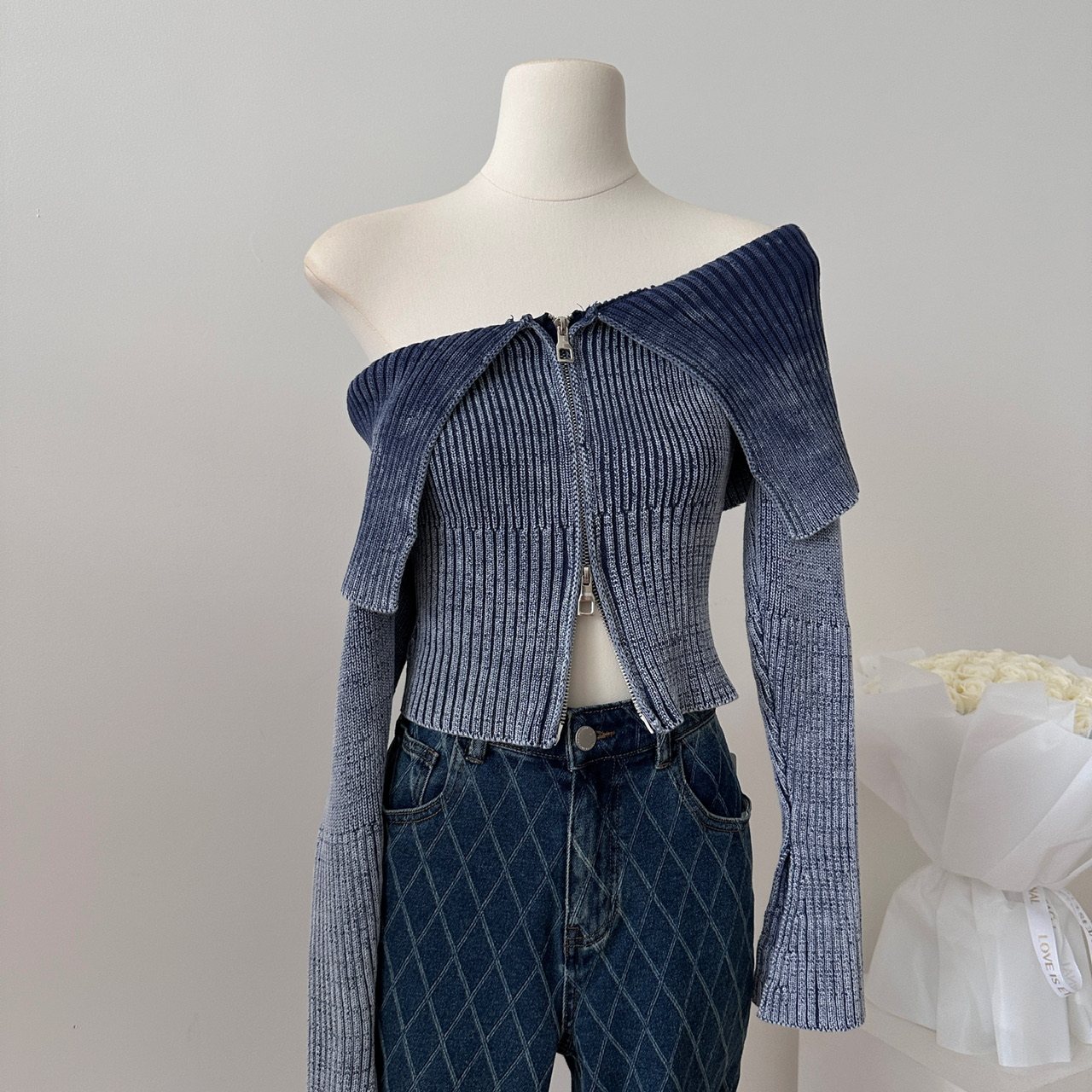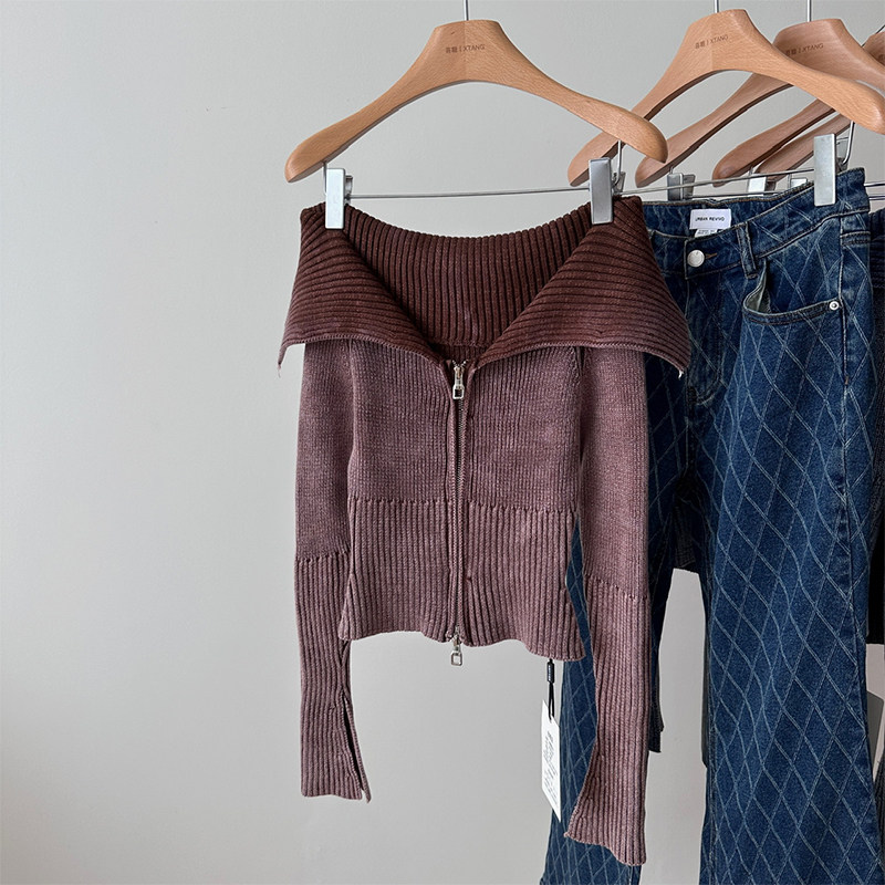 Ретро трикотажный осенний дизайнерский свитер, сексуальный кардиган с молнией, открытые плечи, облегающий крой, тренд сезона, яркий броский стиль
