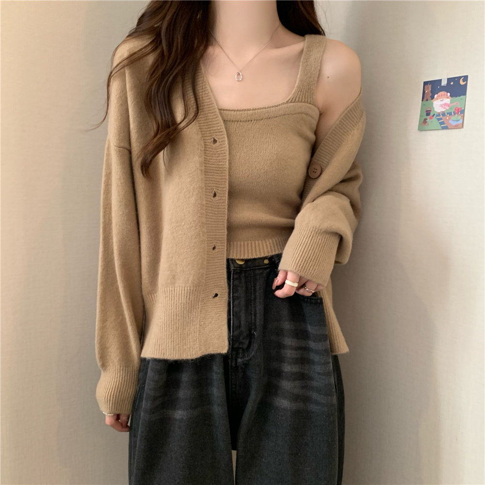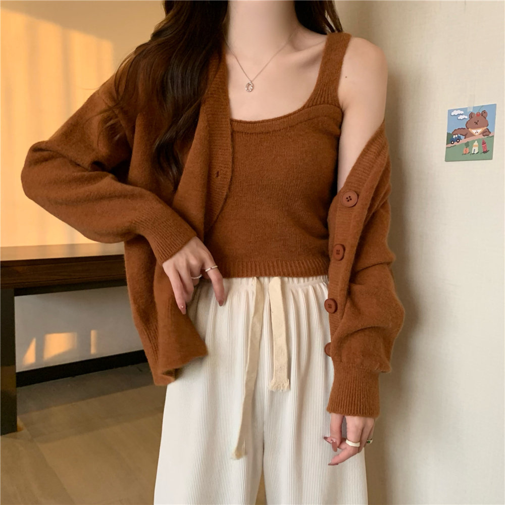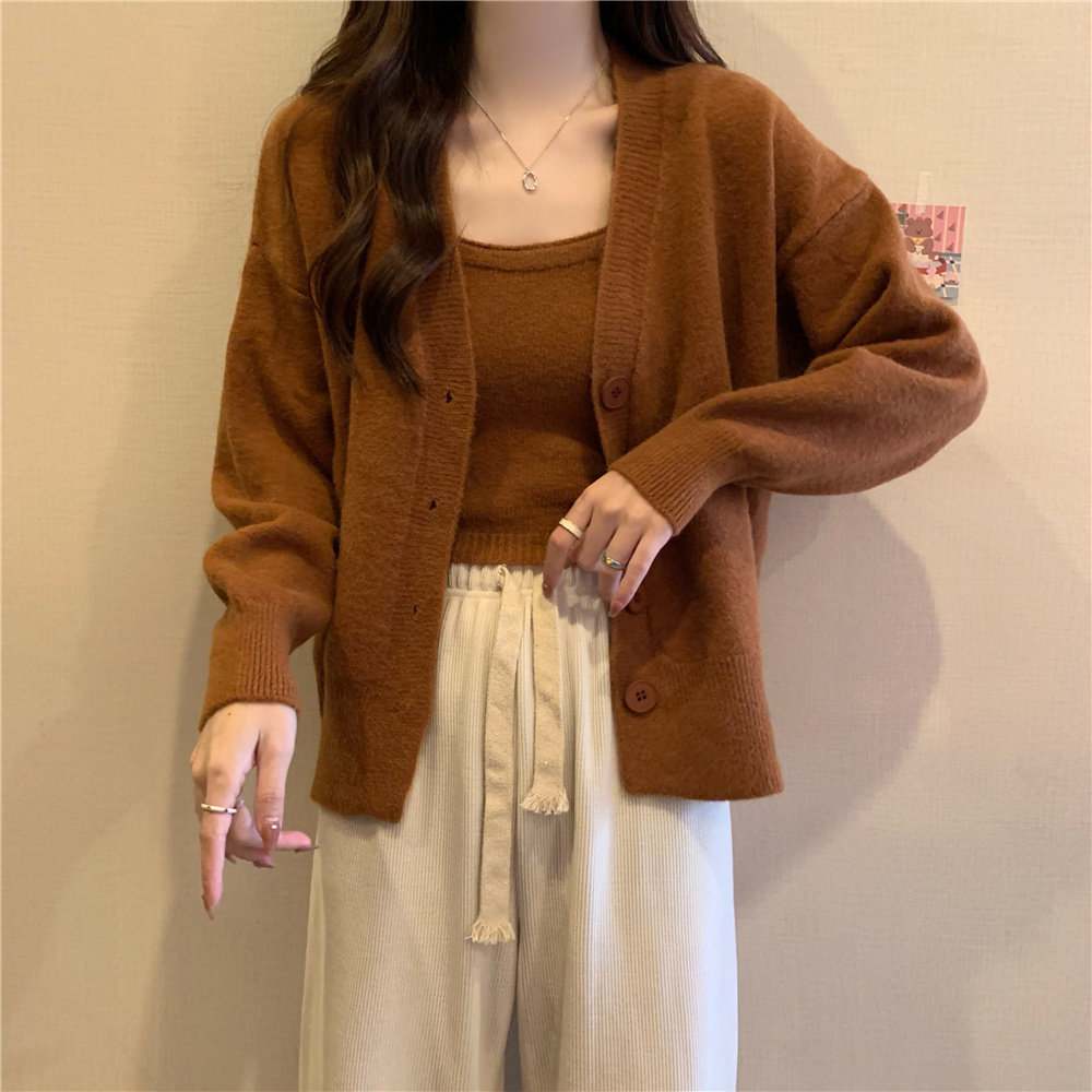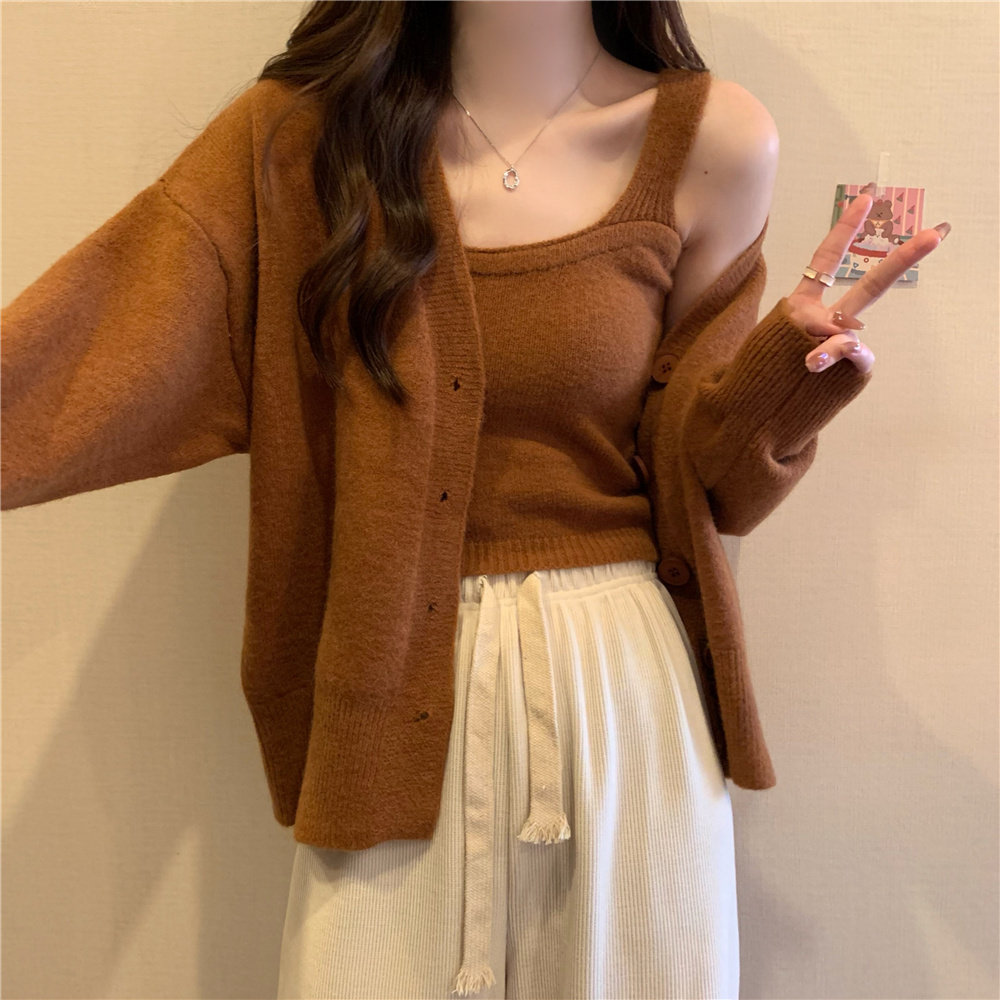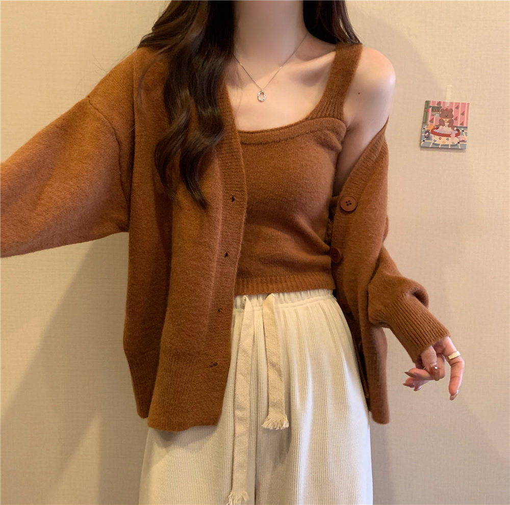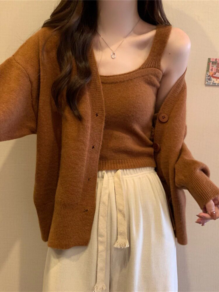Коричневый трикотажный осенний кардиган, свитер, куртка, комплект, с лямками