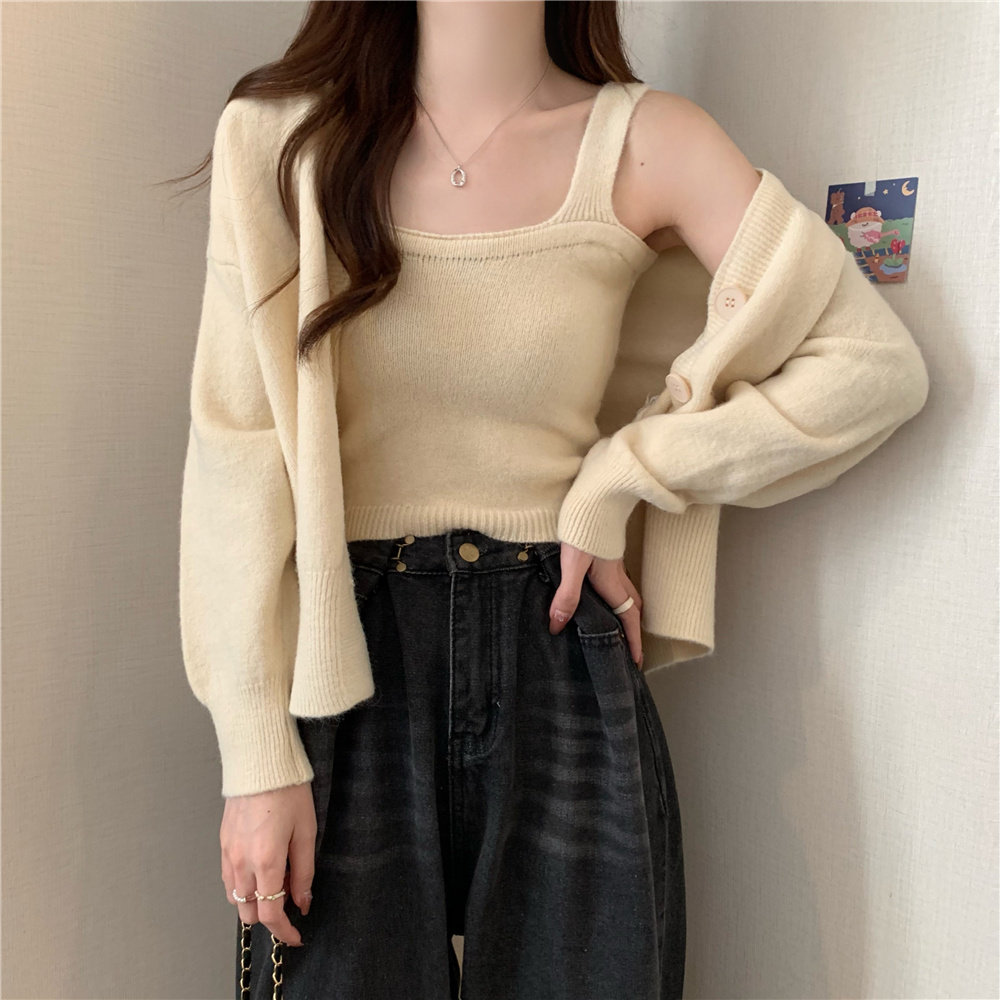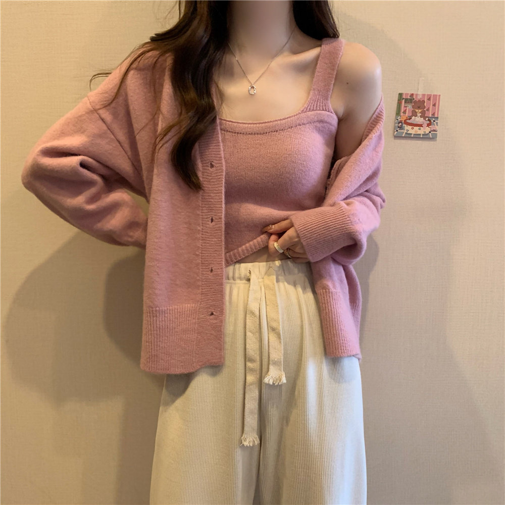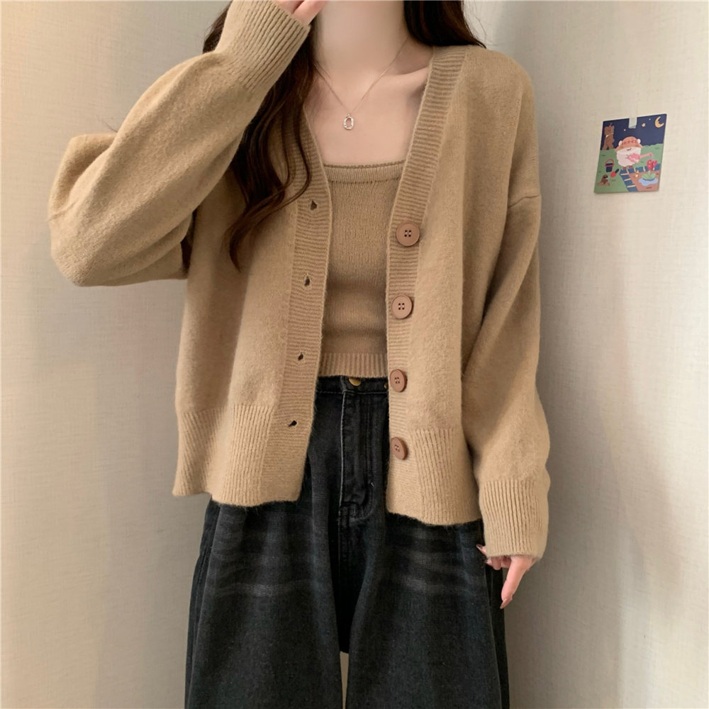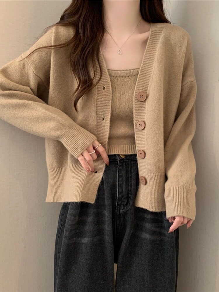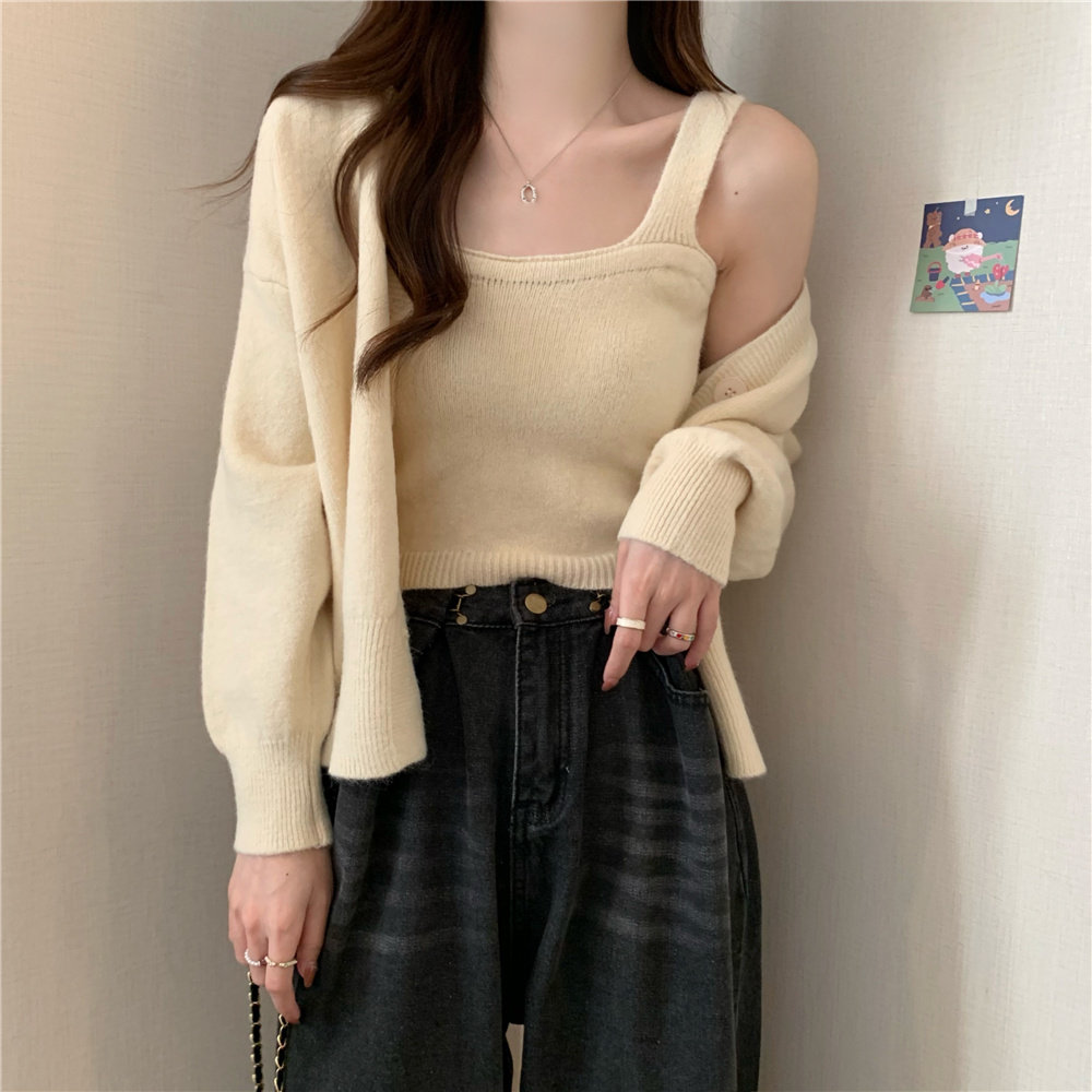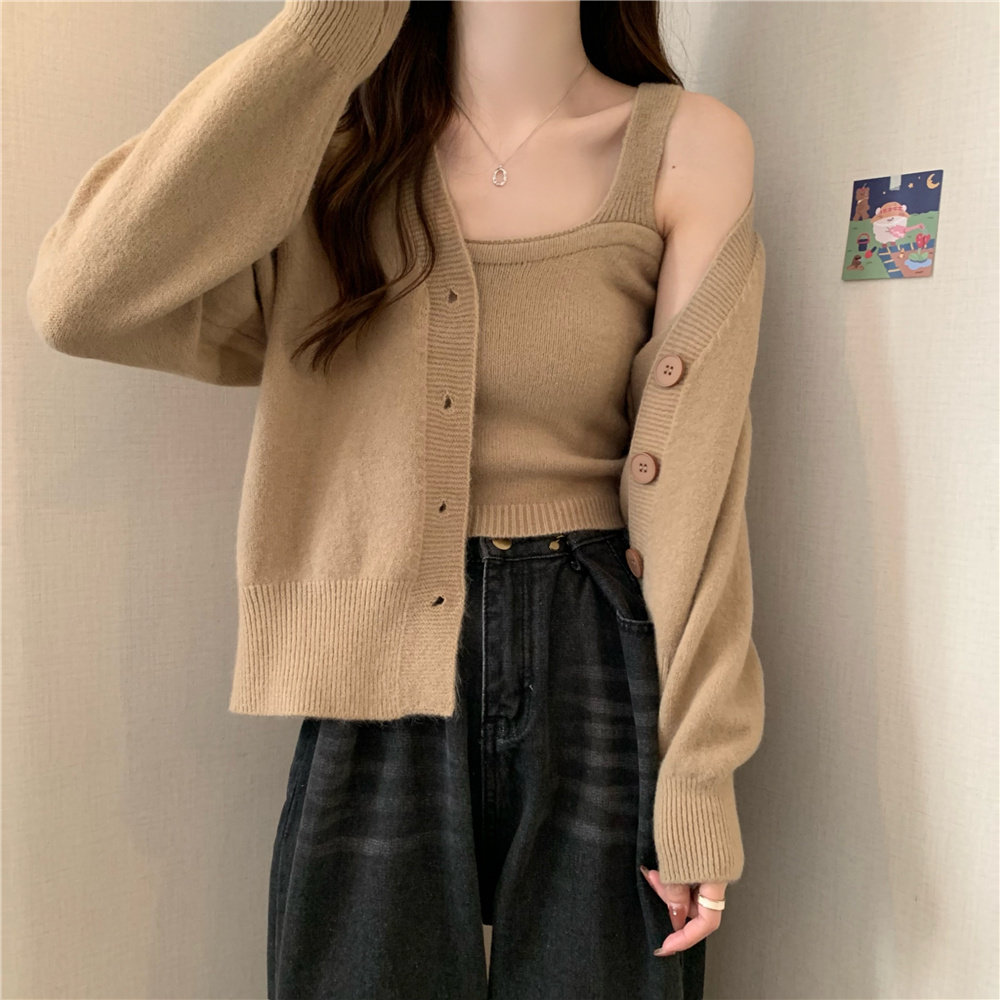 Коричневый трикотажный осенний кардиган, свитер, куртка, комплект, с лямками