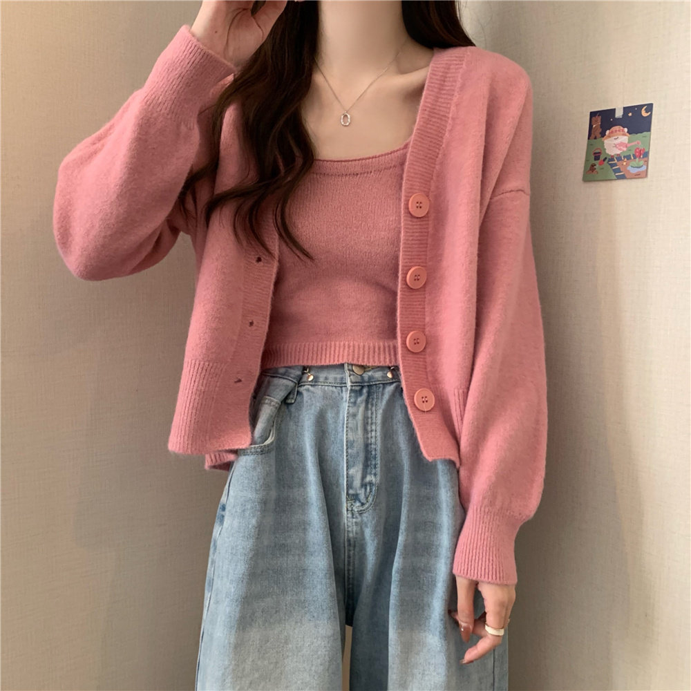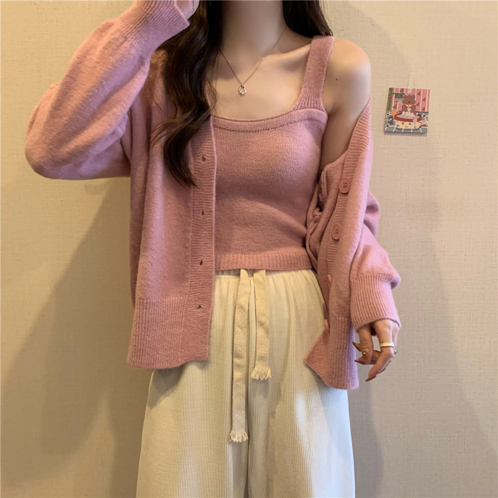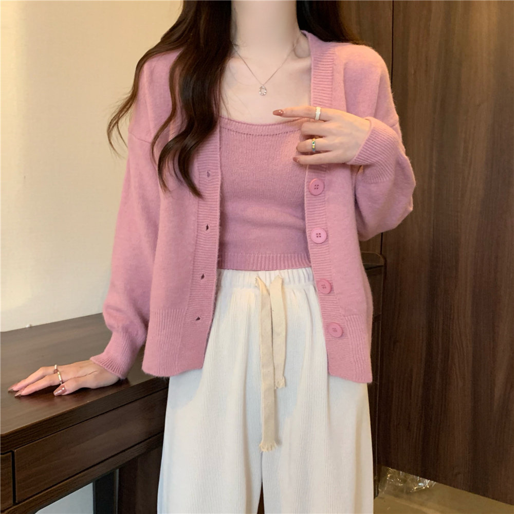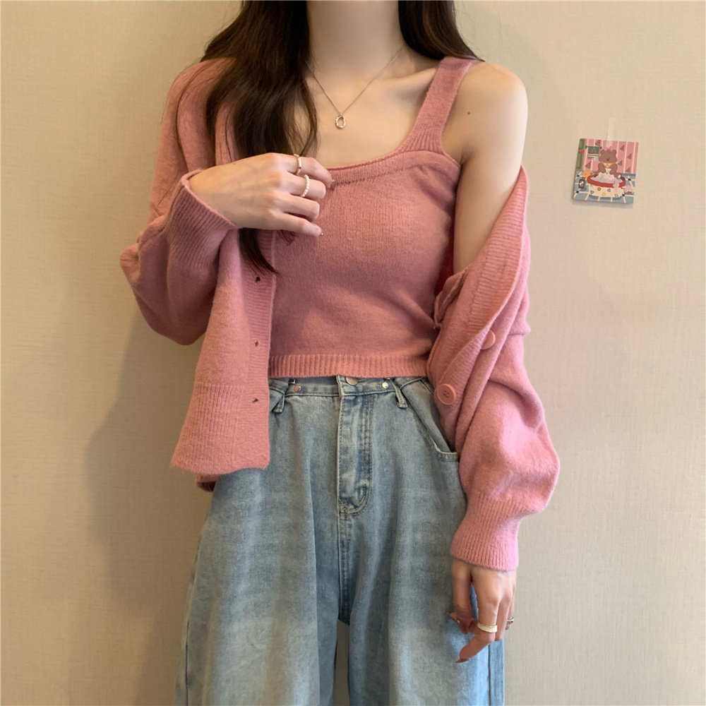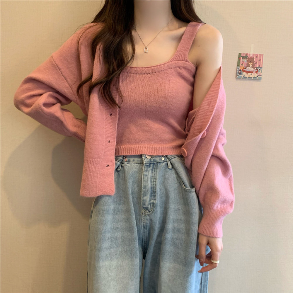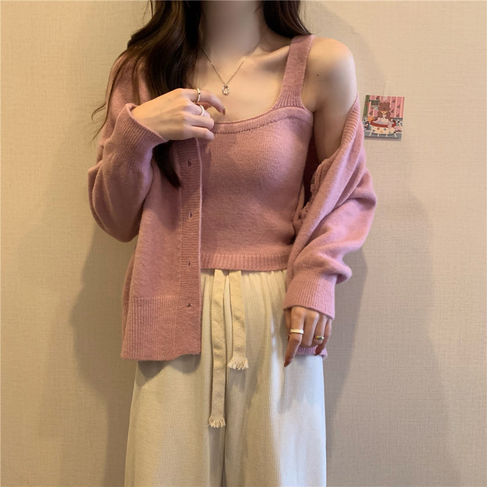 Коричневый трикотажный осенний кардиган, свитер, куртка, комплект, с лямками