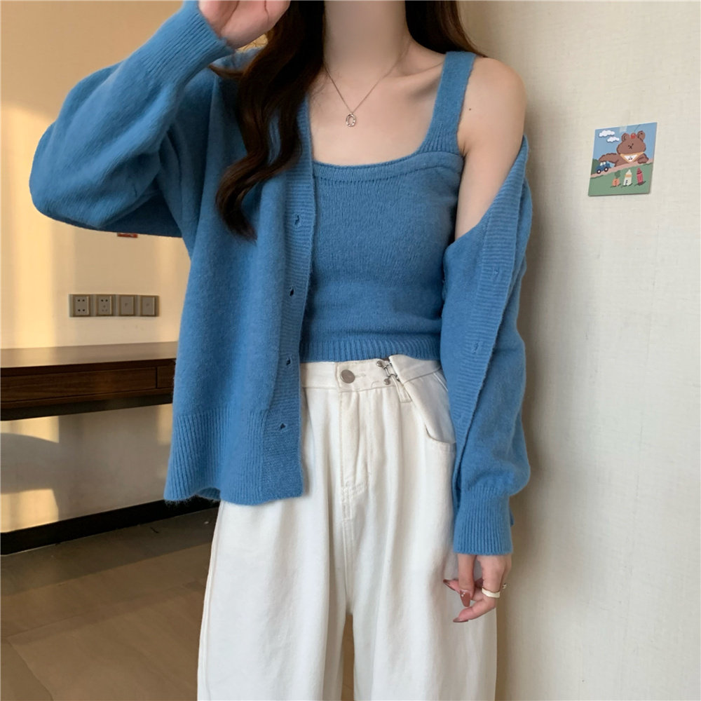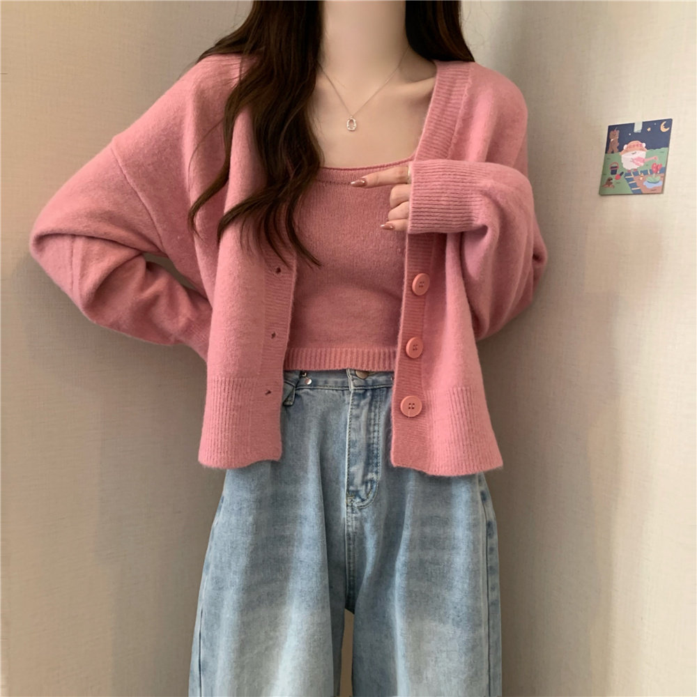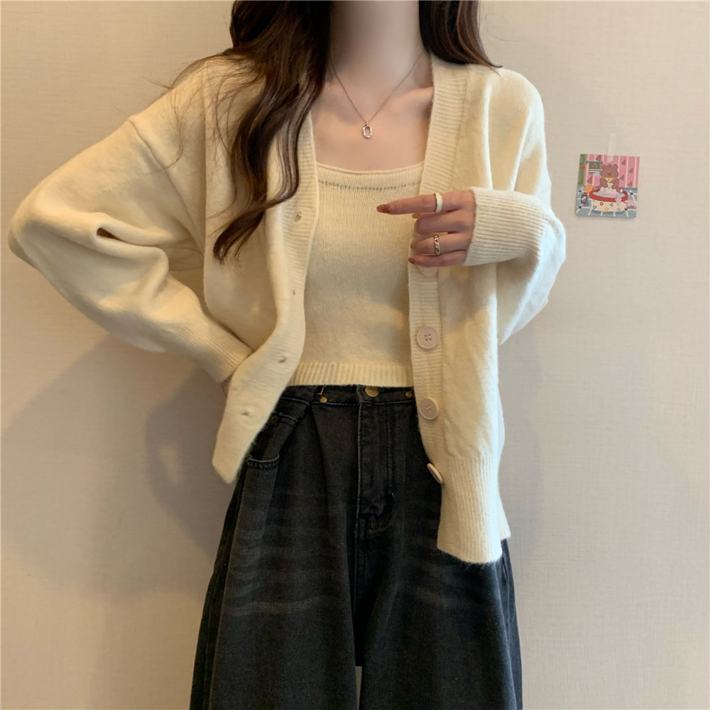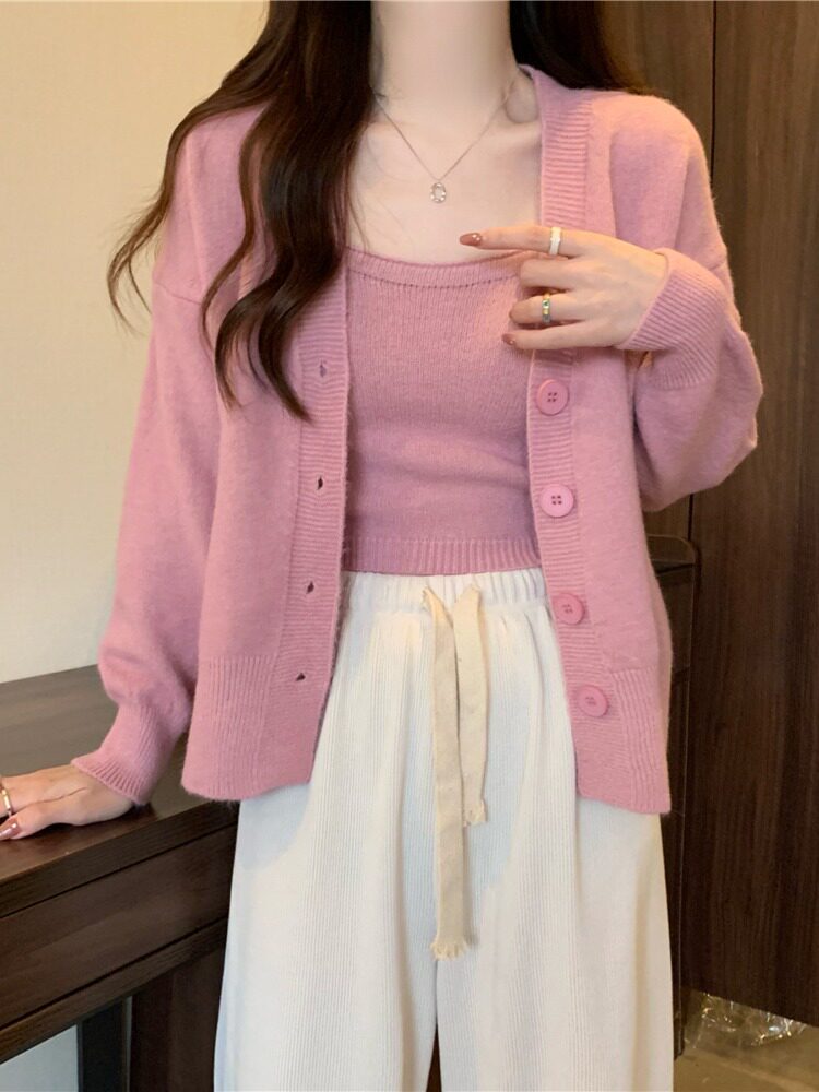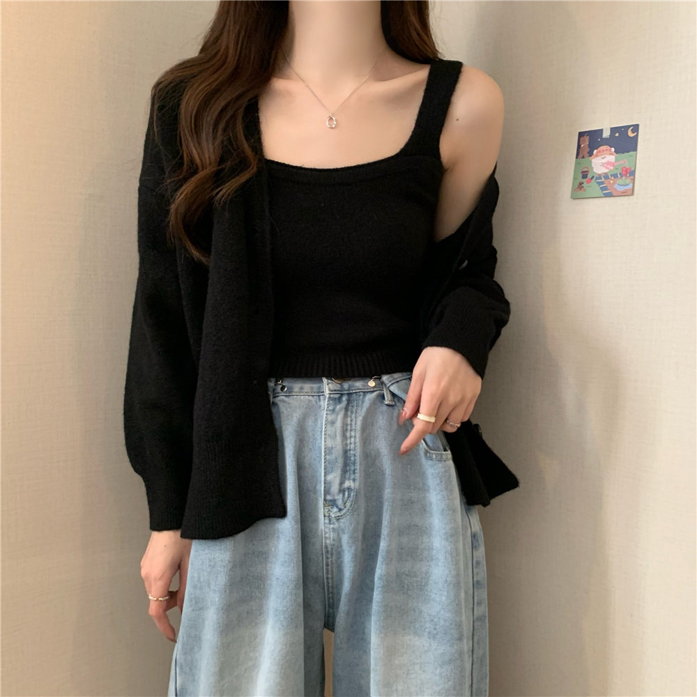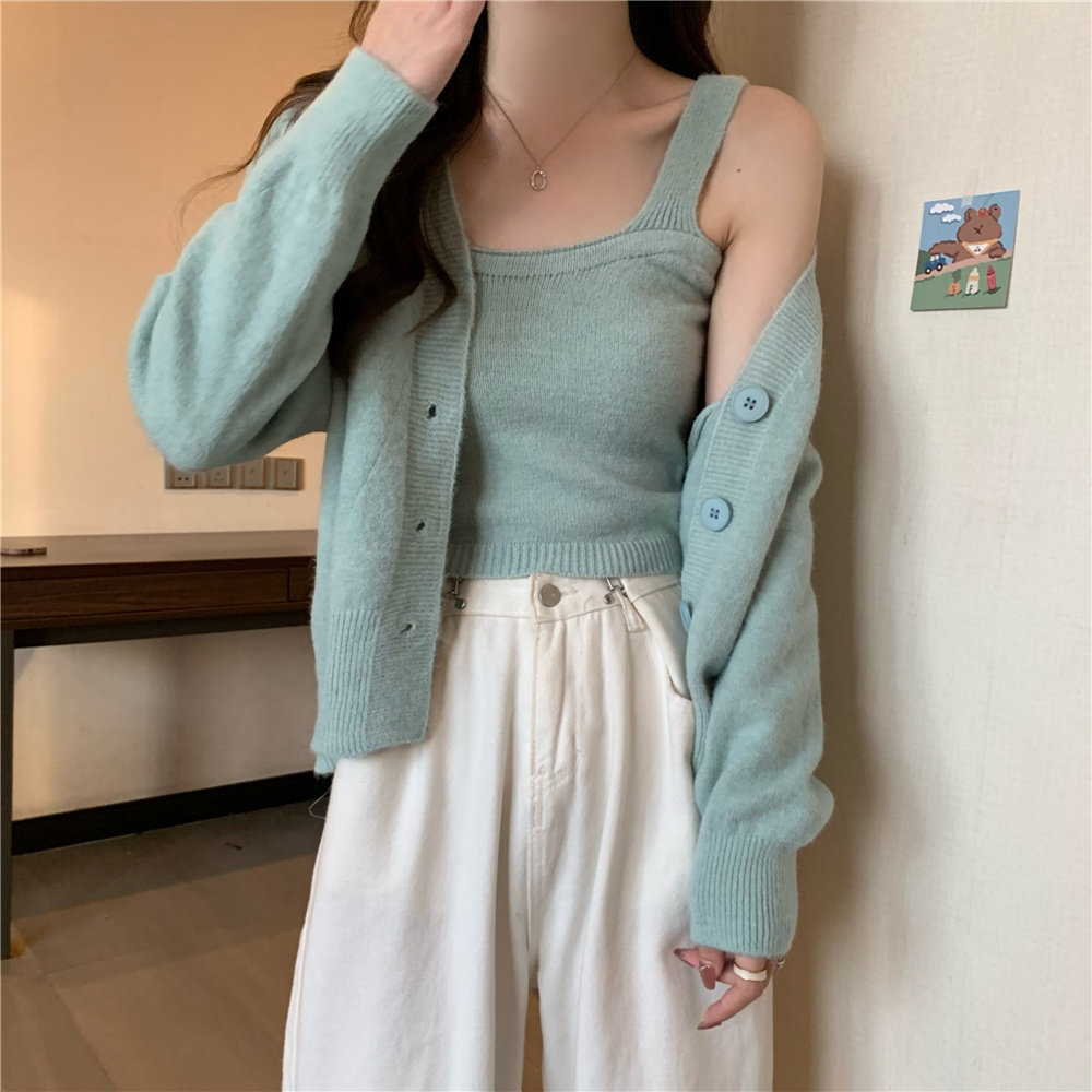 Коричневый трикотажный осенний кардиган, свитер, куртка, комплект, с лямками