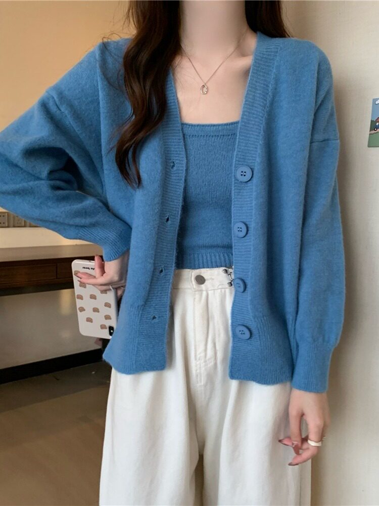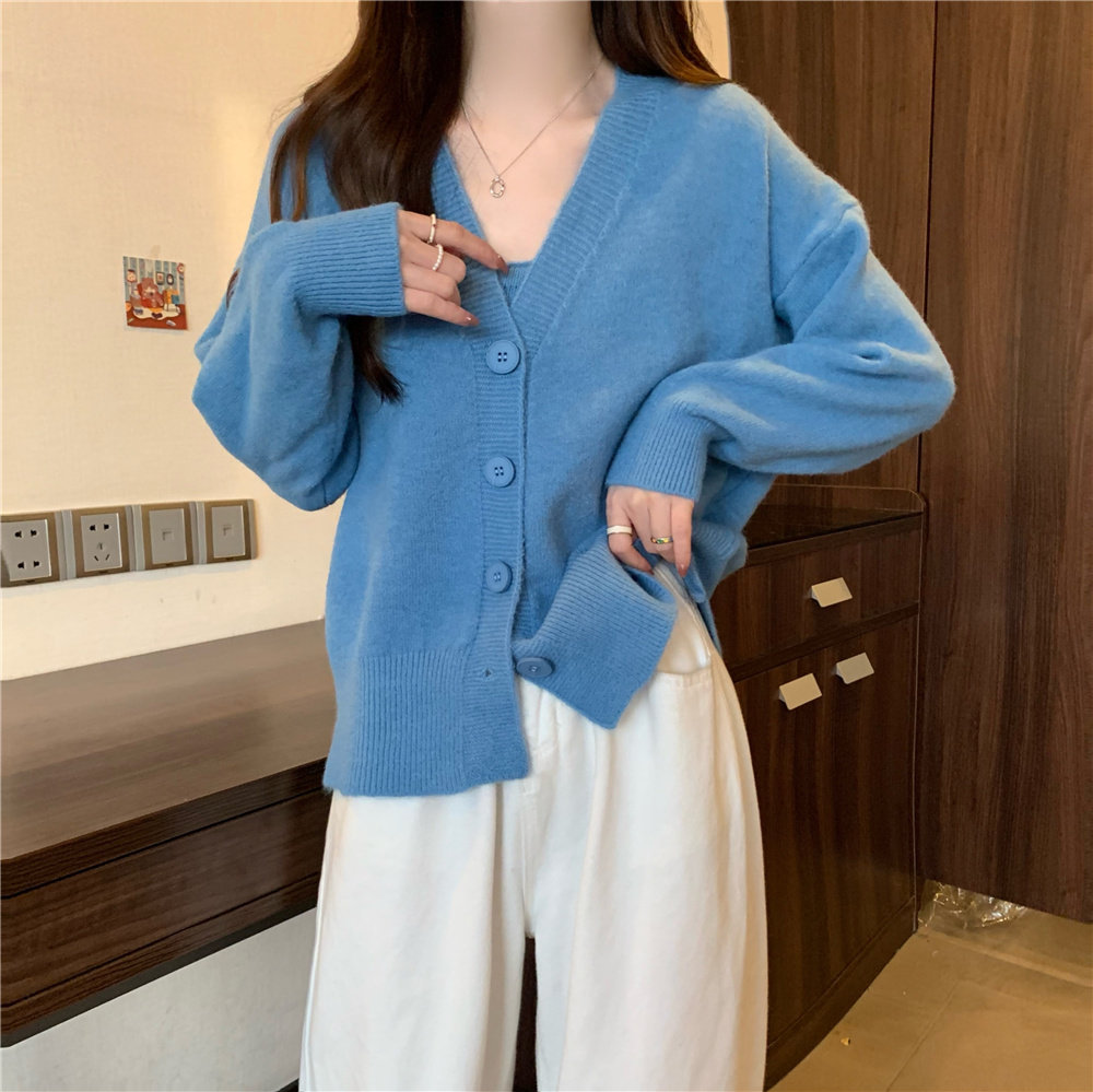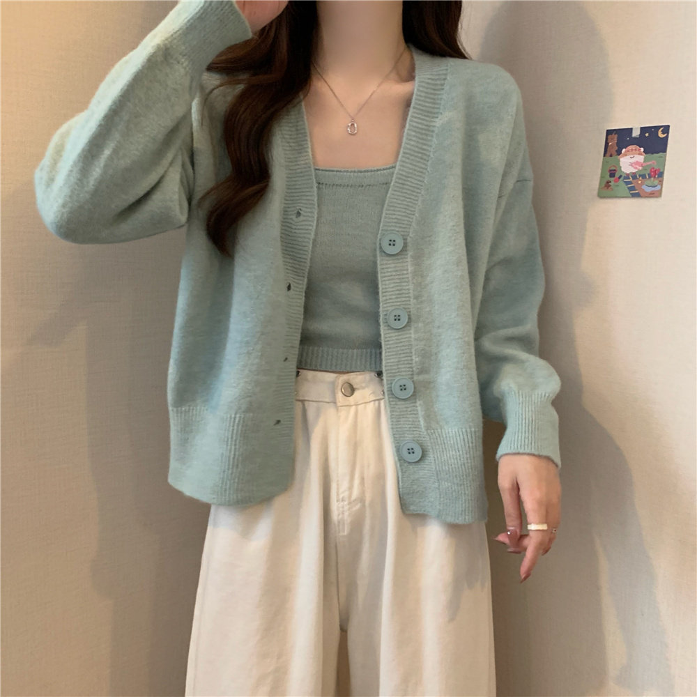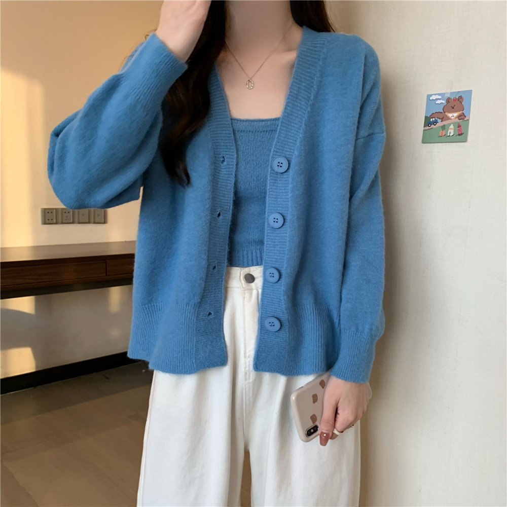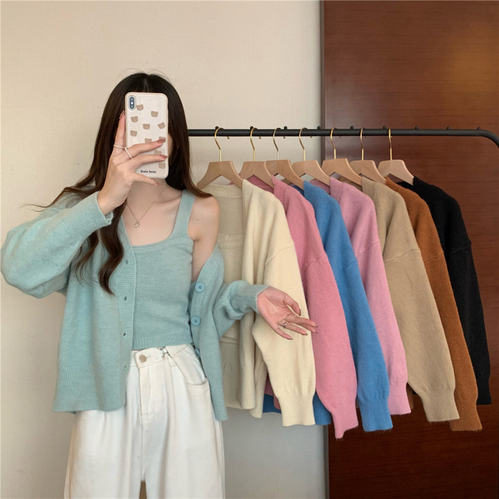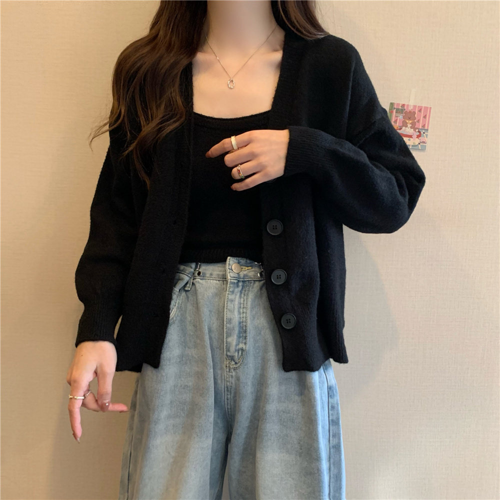 Коричневый трикотажный осенний кардиган, свитер, куртка, комплект, с лямками