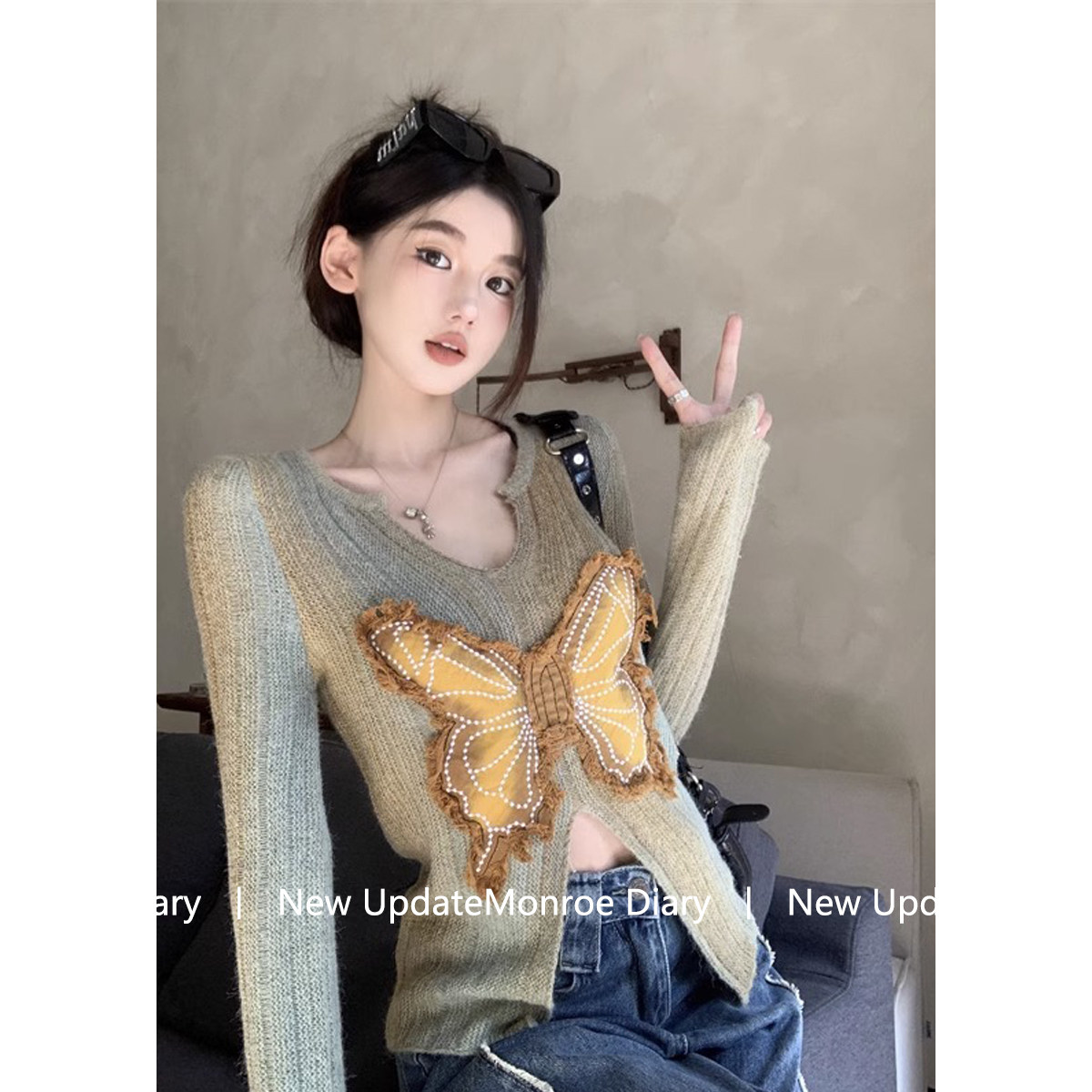 Зеленый трикотажный лонгслив, весенний дизайнерский базовый свитер, V-образный вырез, тренд сезона