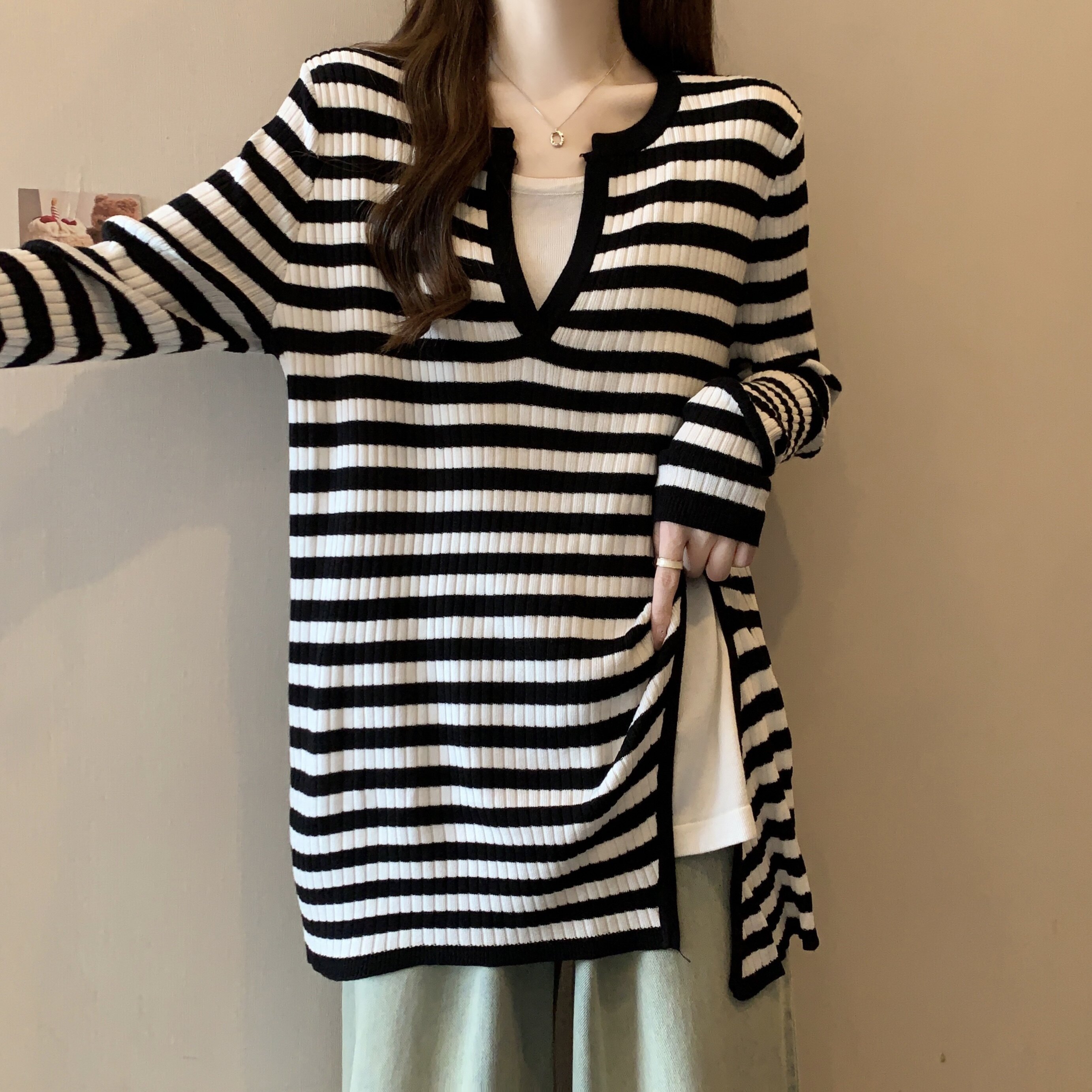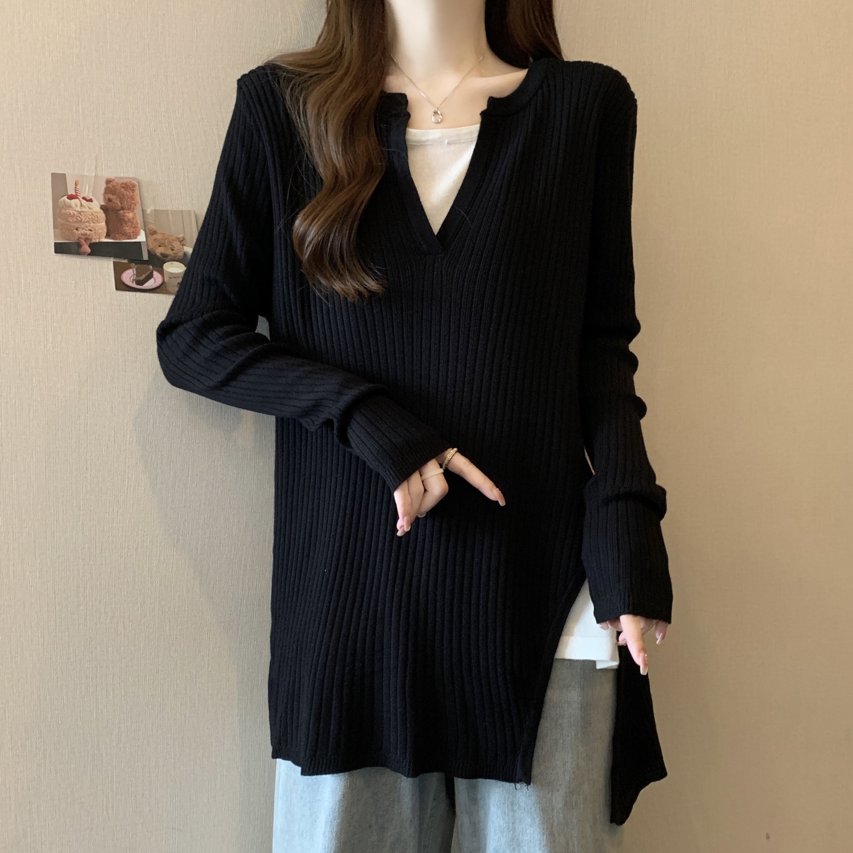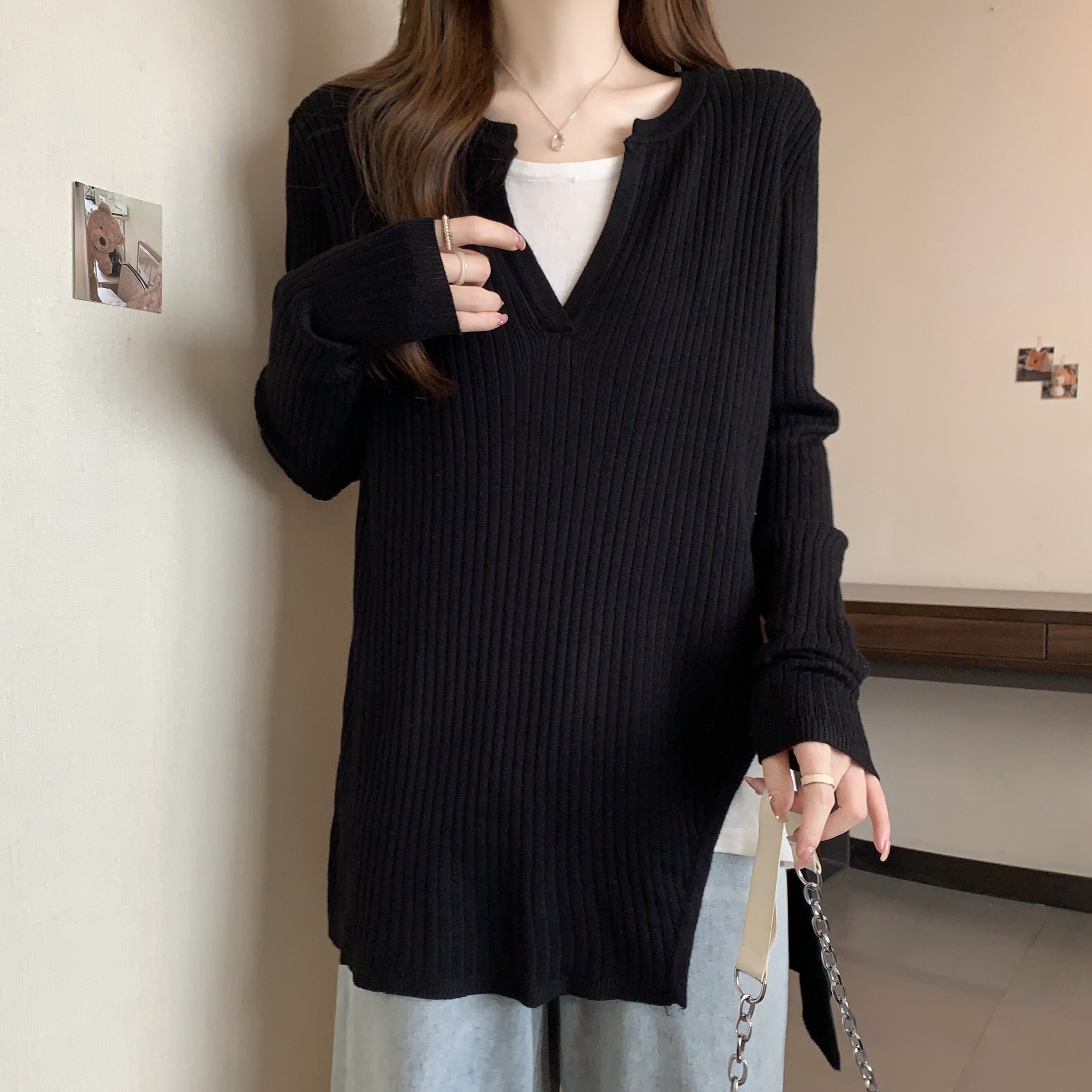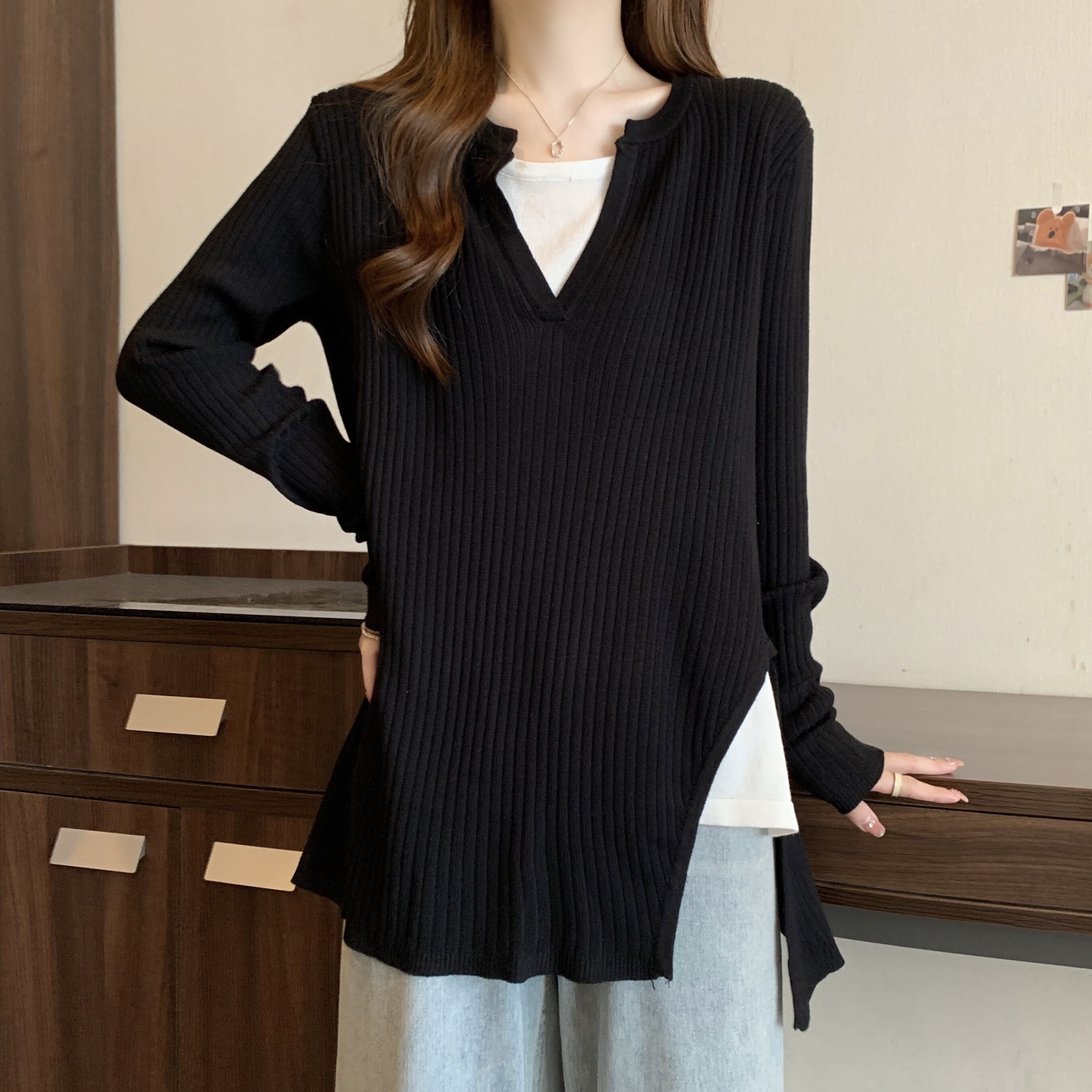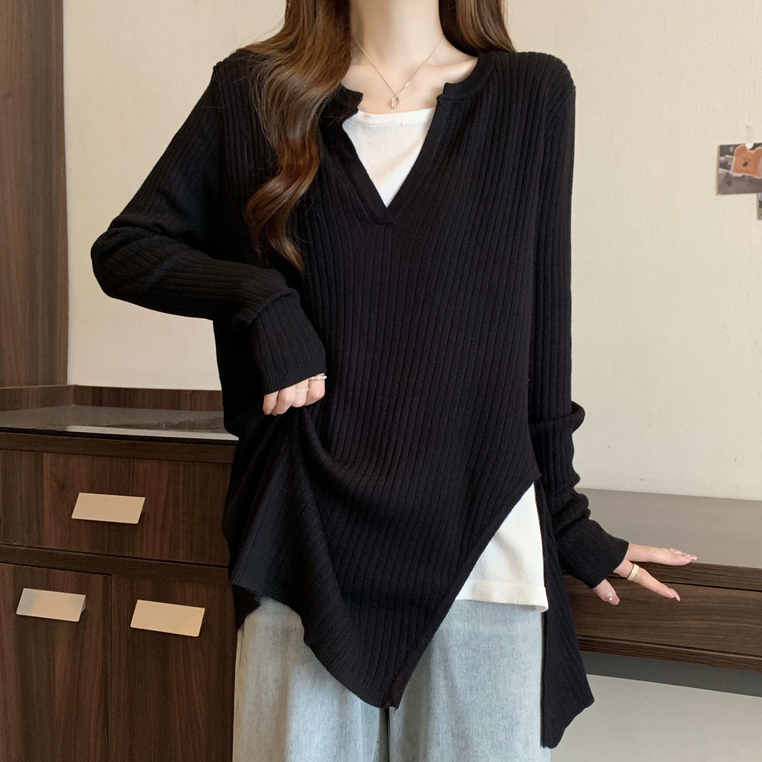 Базовый демисезонный свитер, дизайнерский трикотажный комплект, большой размер, подходит для полных девушек, оверсайз, свободный крой, V-образный вырез