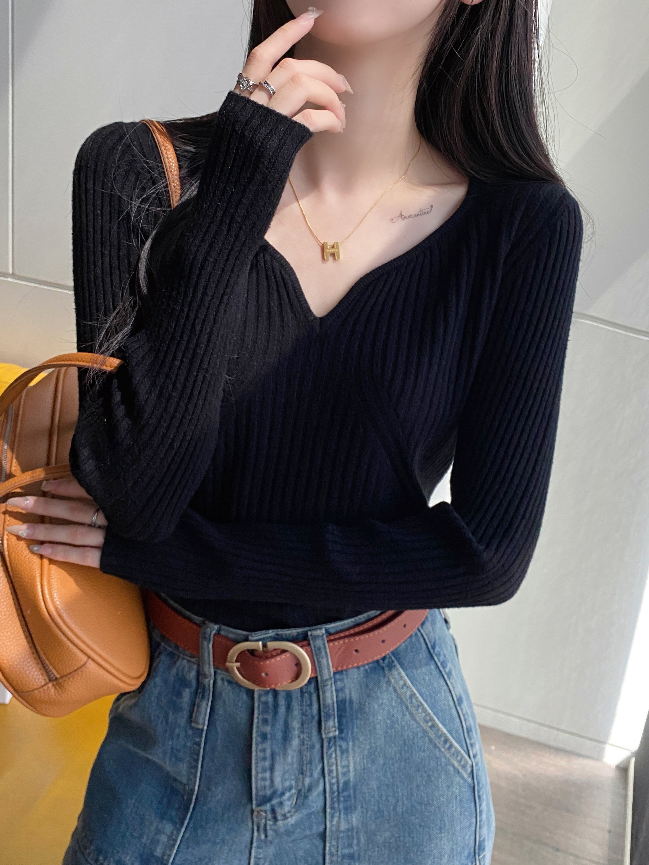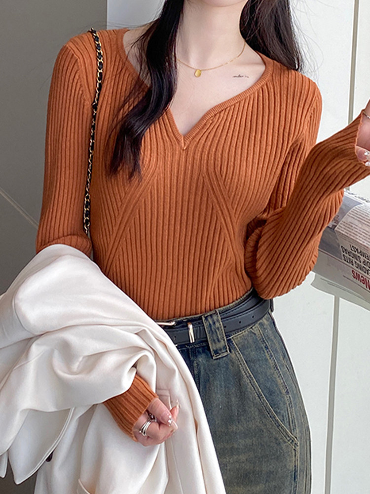 Демисезонная трикотажная модная рубашка, дизайнерский свитер, лонгслив, городской стиль, V-образный вырез, облегающий крой