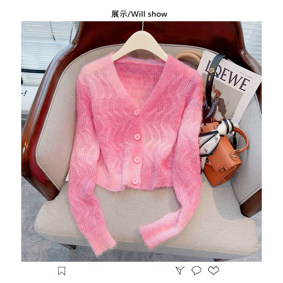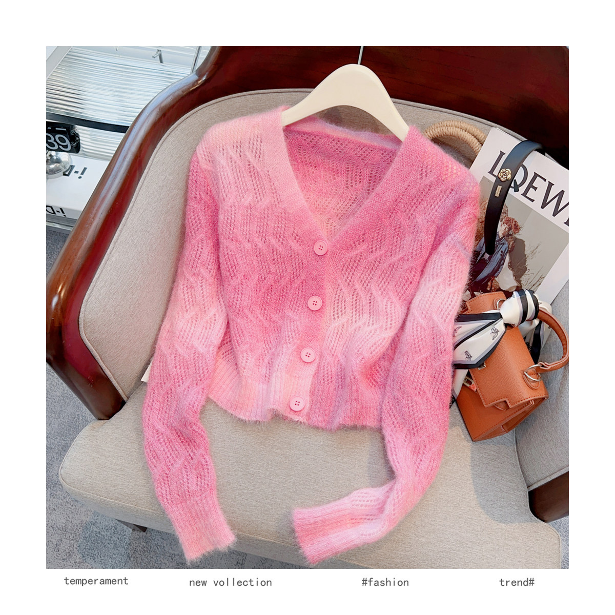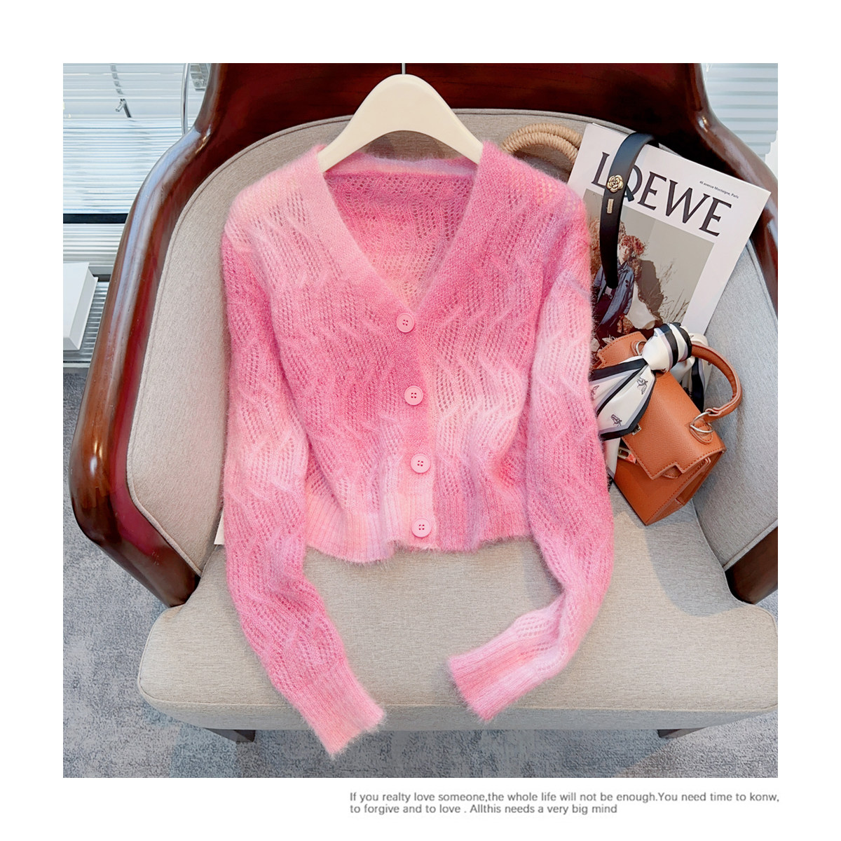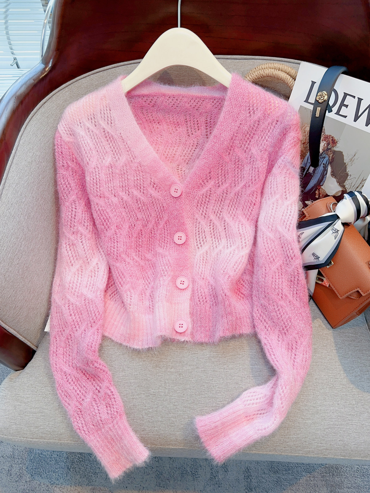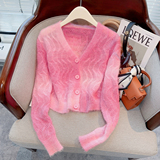 Розовый тонкий трикотажный демисезонный свитер, короткий кардиган, в западном стиле, свободный крой