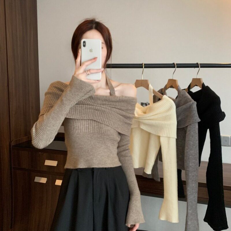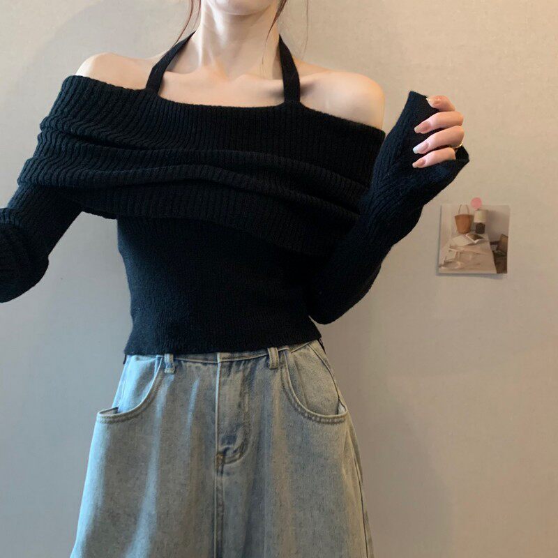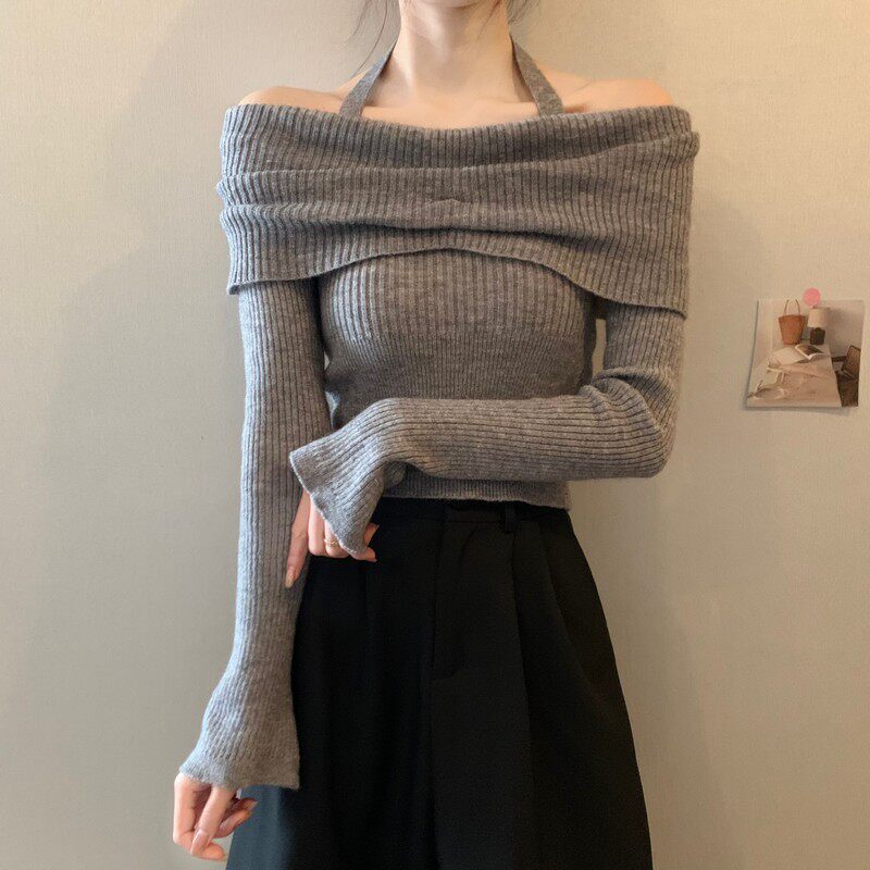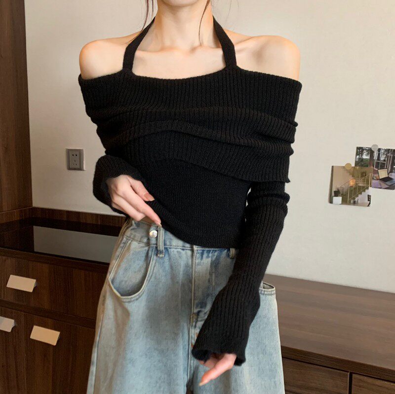 Базовый приятный телу демисезонный свитер, трикотажный лонгслив, открытые плечи, изысканный стиль