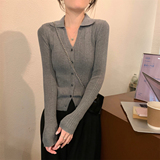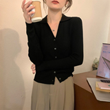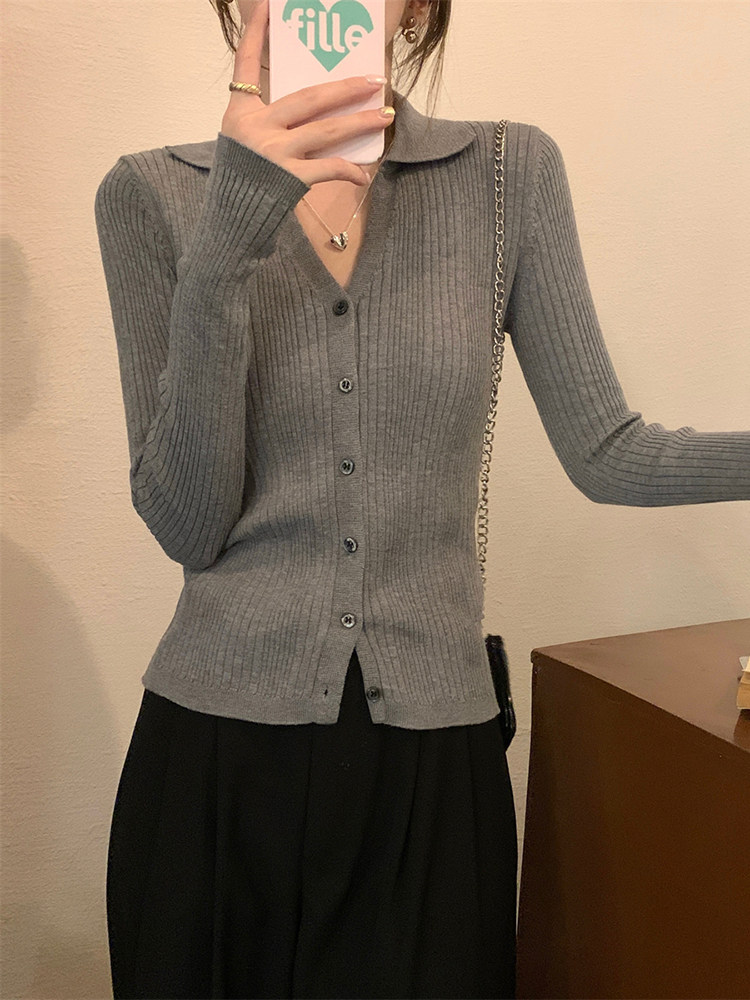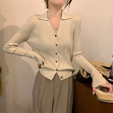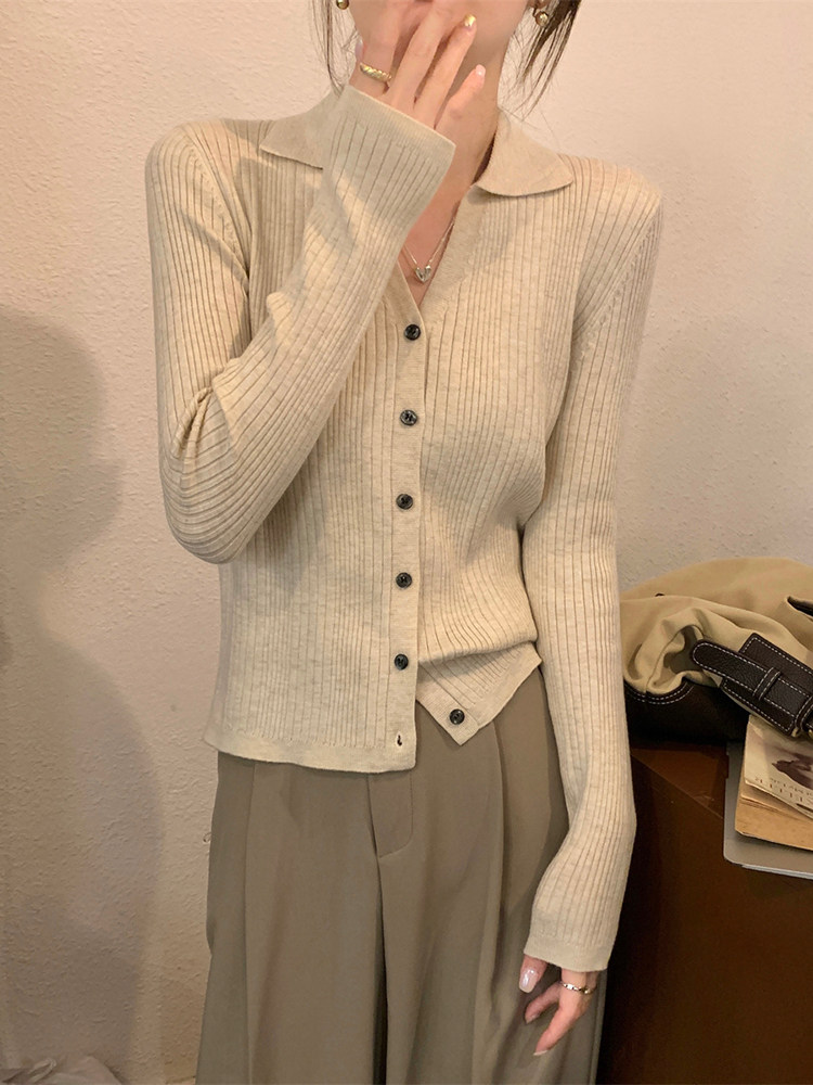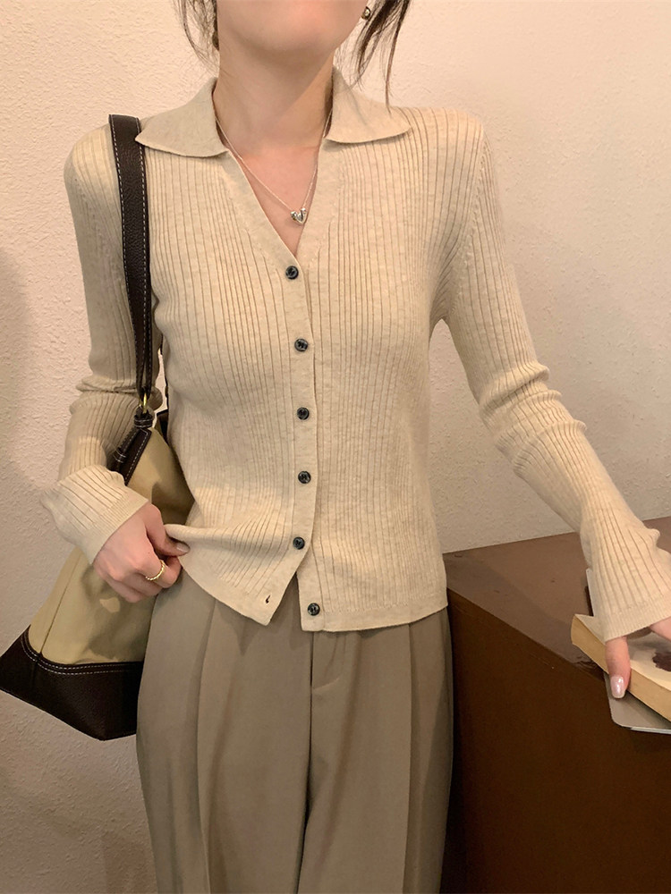 Абрикосовый трикотажный осенний кардиган, базовый приятный телу лонгслив, воротник поло, V-образный вырез