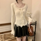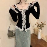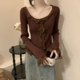 Коричневый базовый приятный телу кружевной трикотажный шифоновый свитер, квадратный вырез