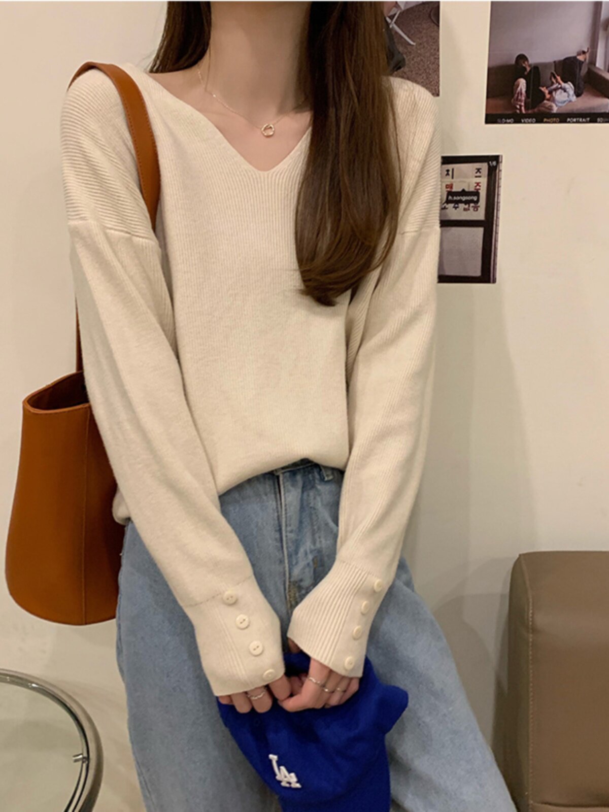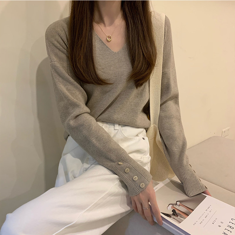Трикотажный весенний свитер, осенний базовый приятный телу лонгслив, V-образный вырез, большой размер