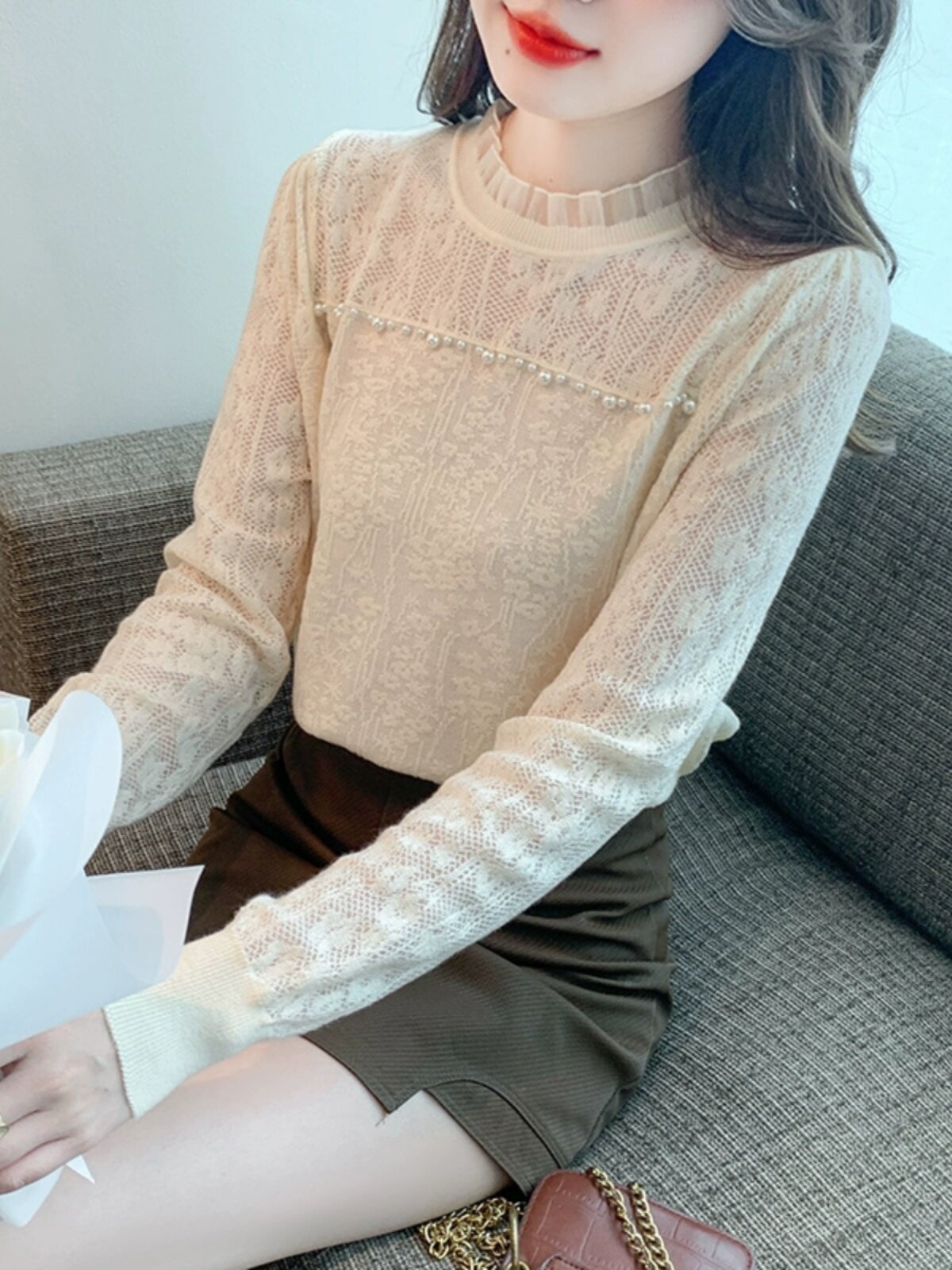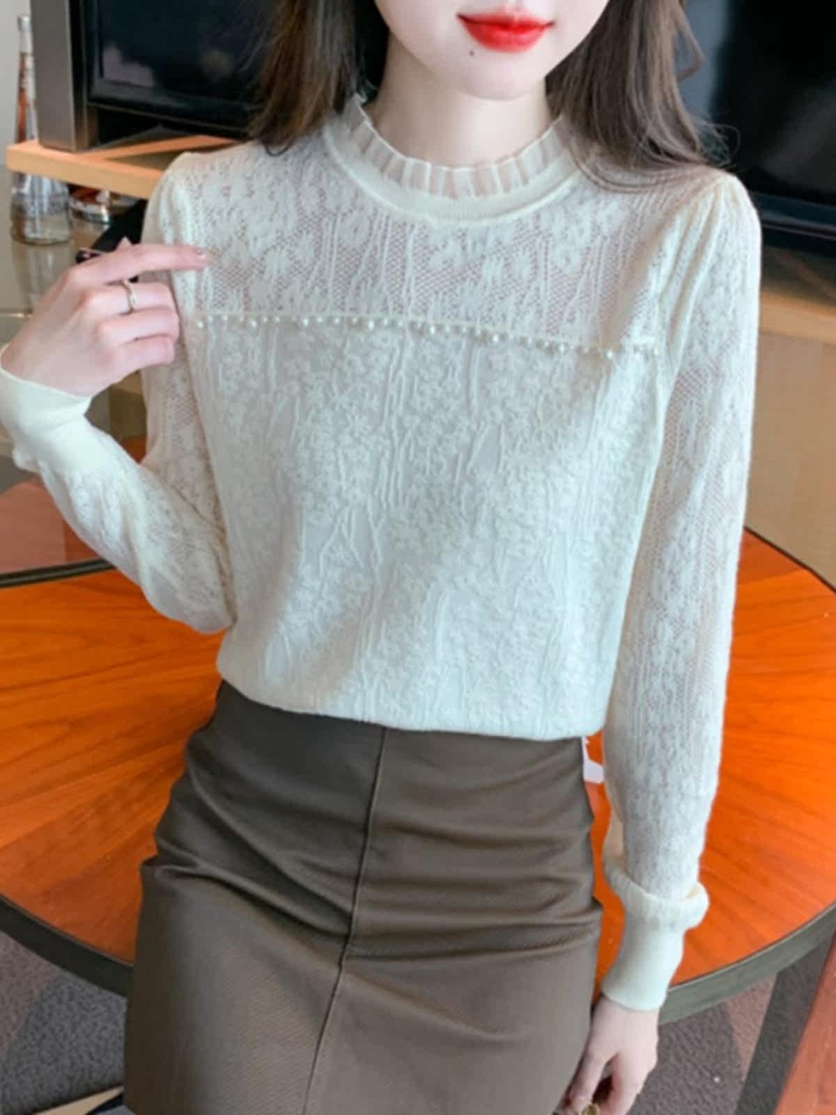 Кружевной шелковый приятный телу демисезонный дизайнерский приталенный трикотажный свитер, высокий воротник, тренд сезона, в западном стиле