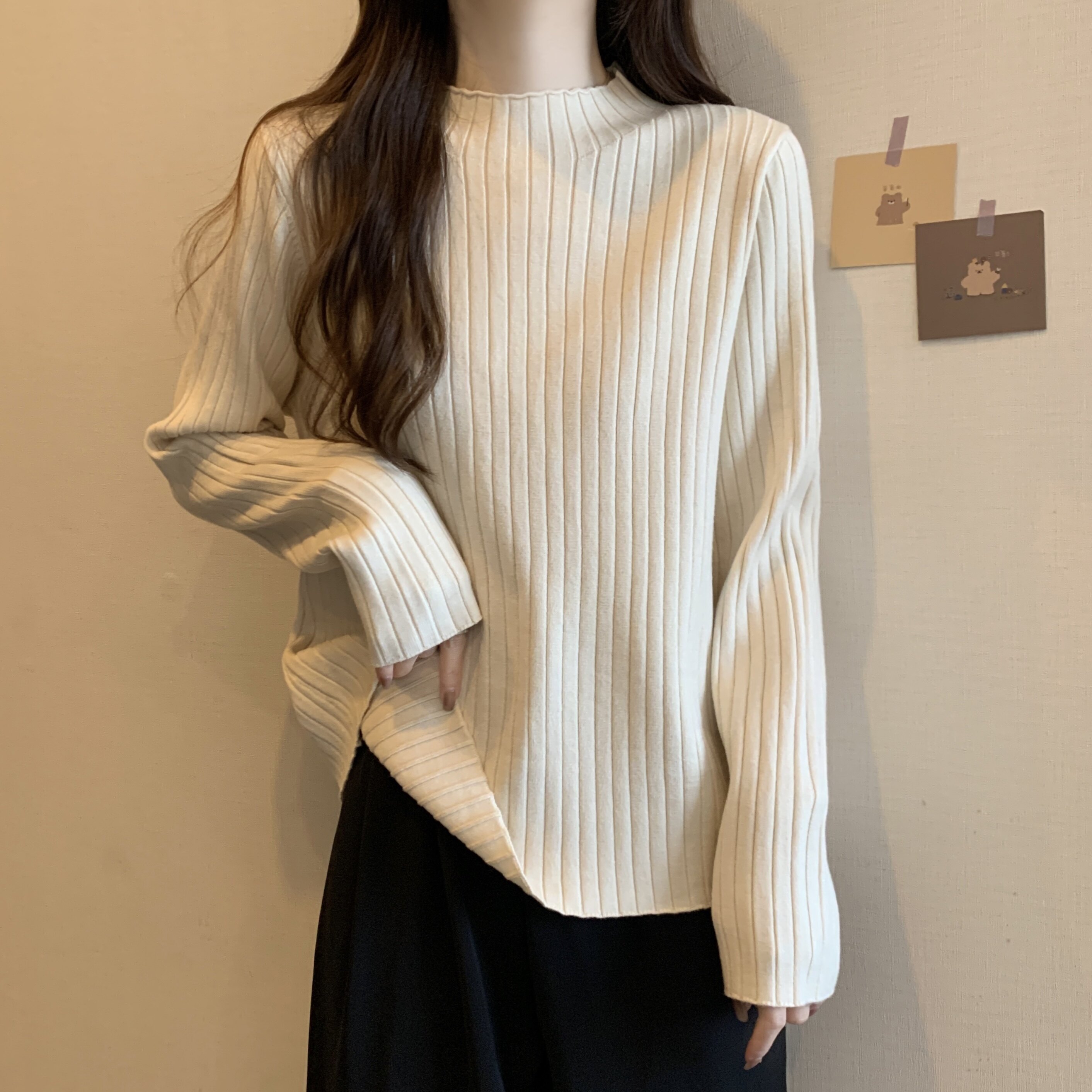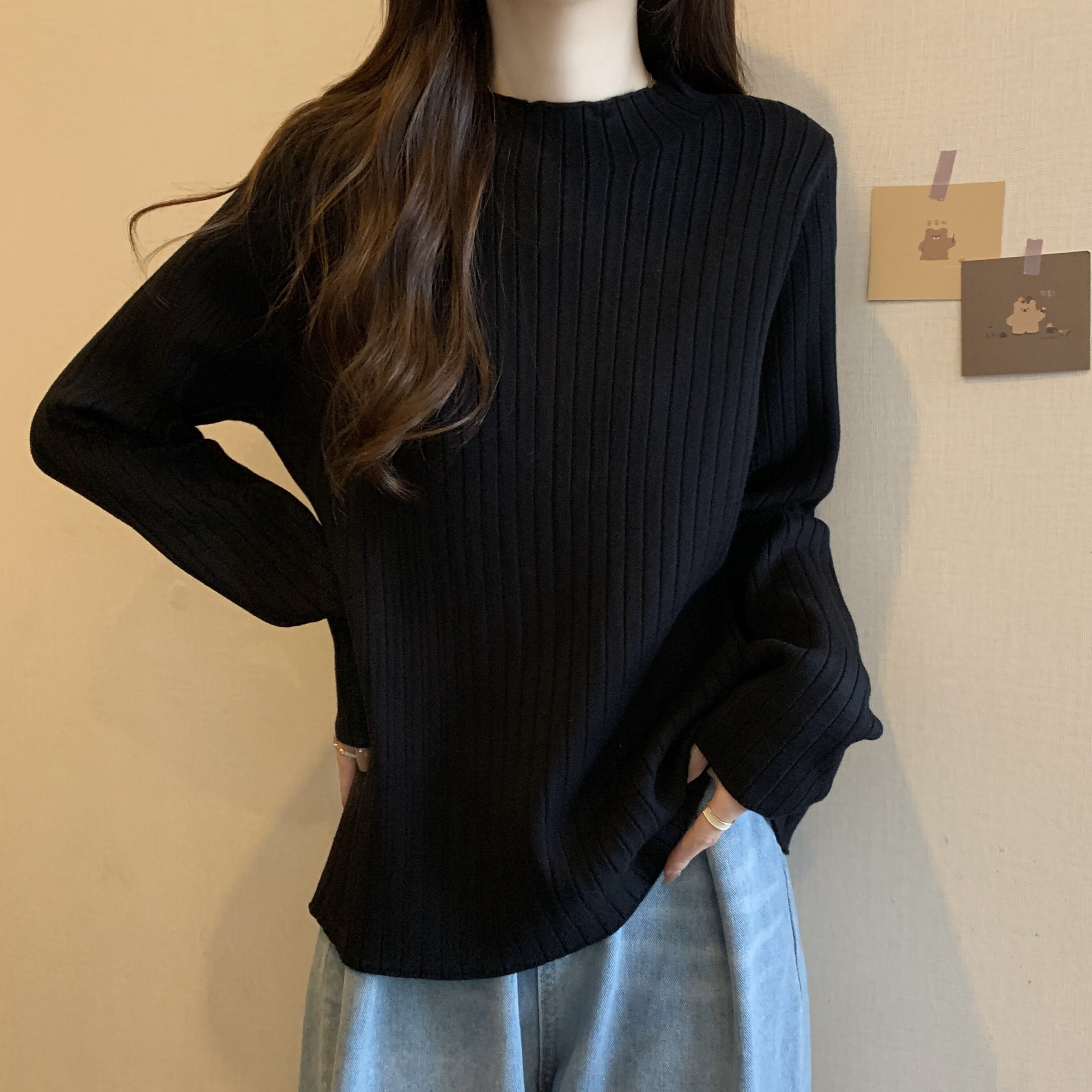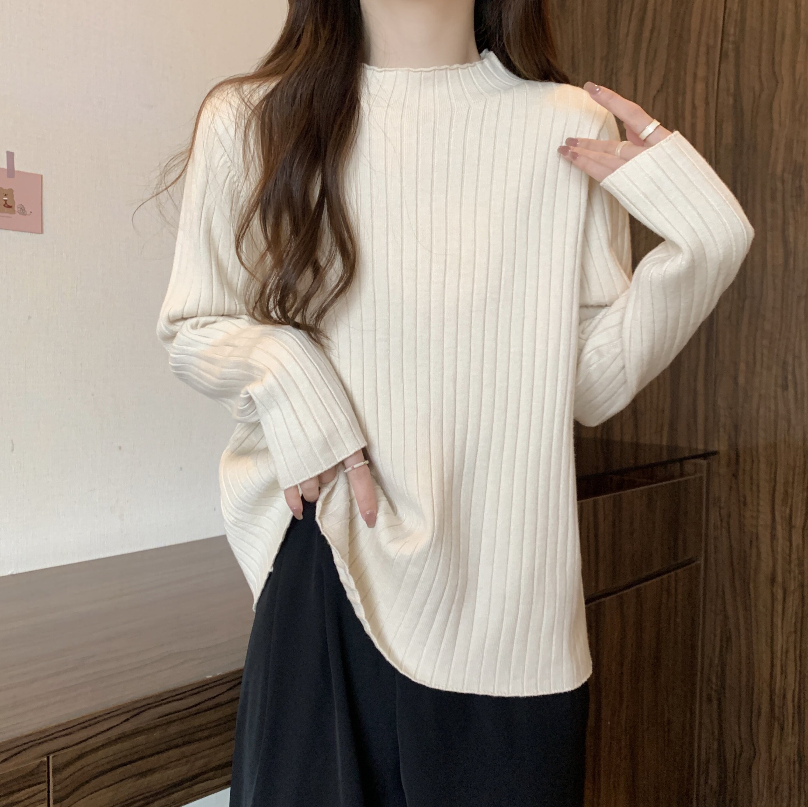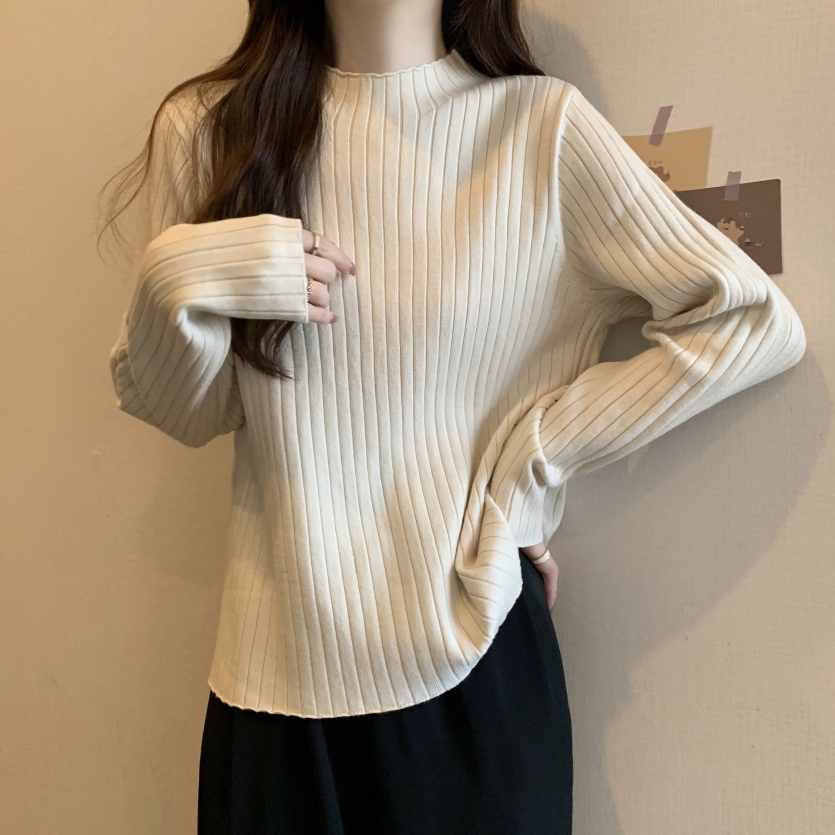 Трикотажный осенний базовый приятный телу свитер, высокий воротник, большой размер