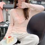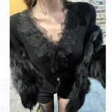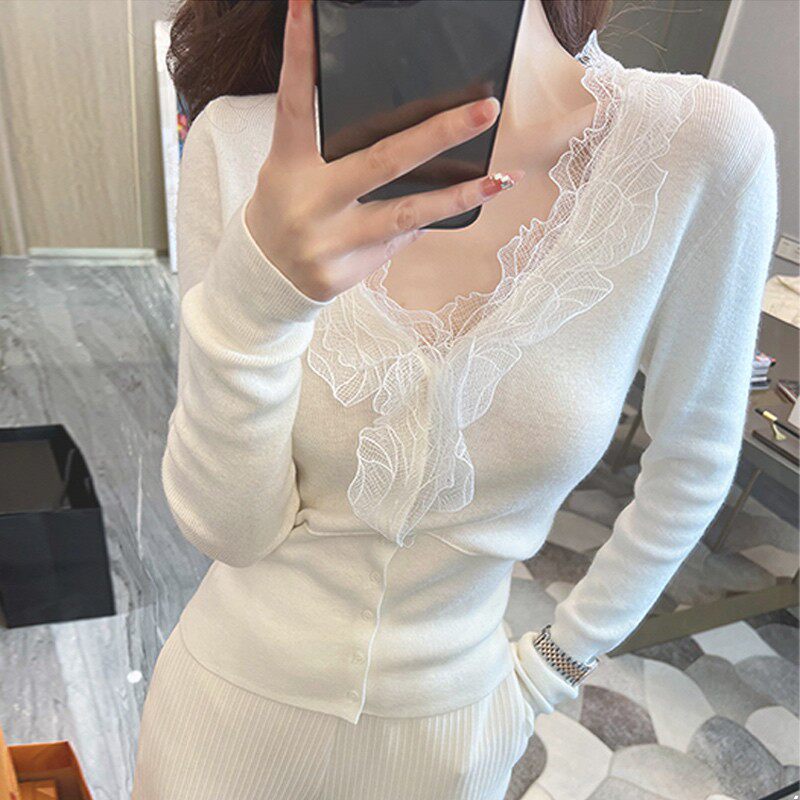 Белый шерстяной трикотажный демисезонный дизайнерский кружевной базовый свитер, тренд сезона, в западном стиле, V-образный вырез