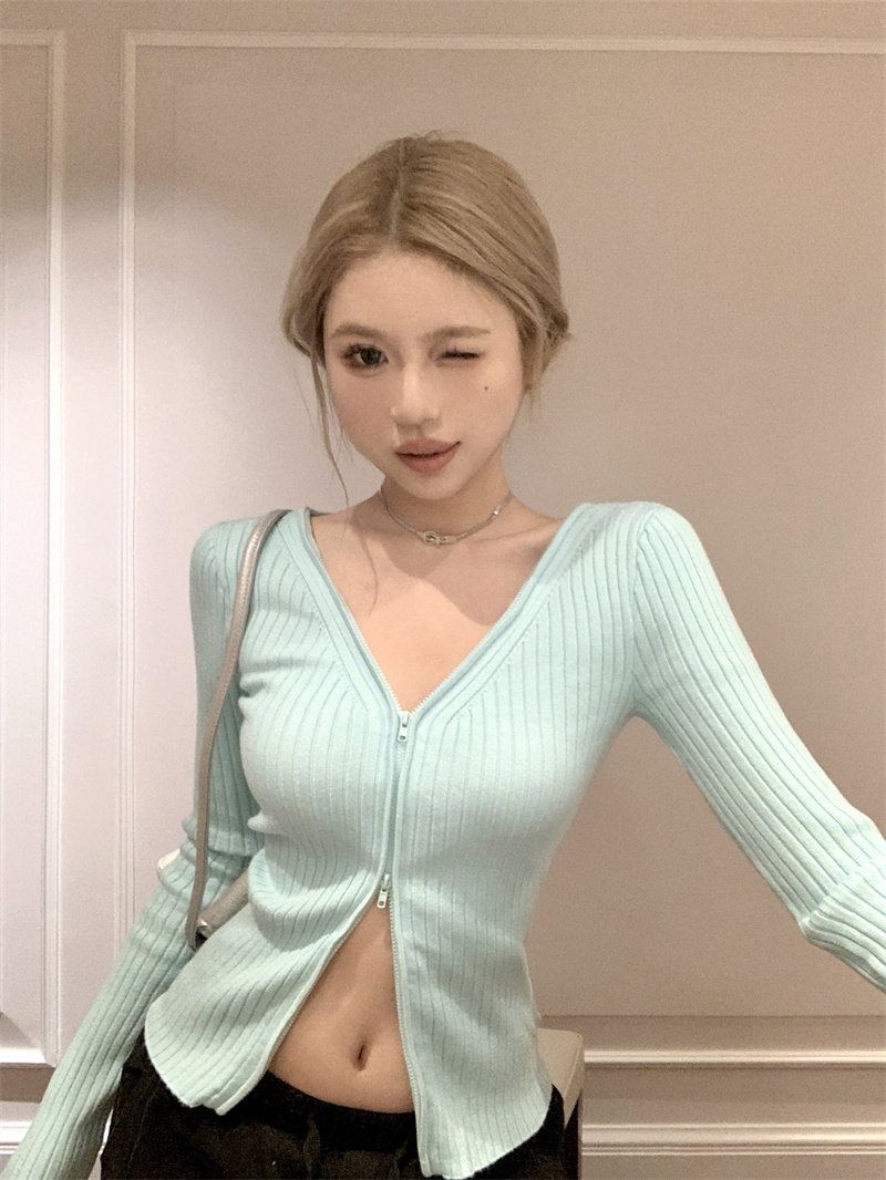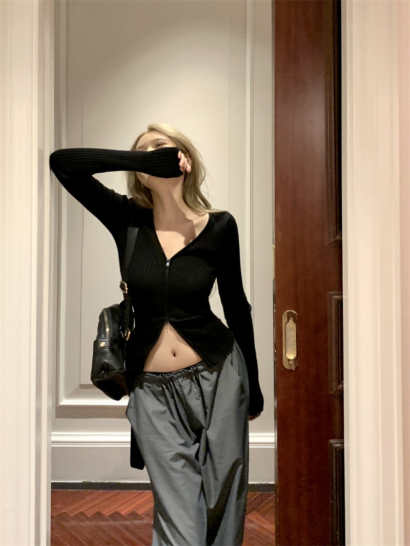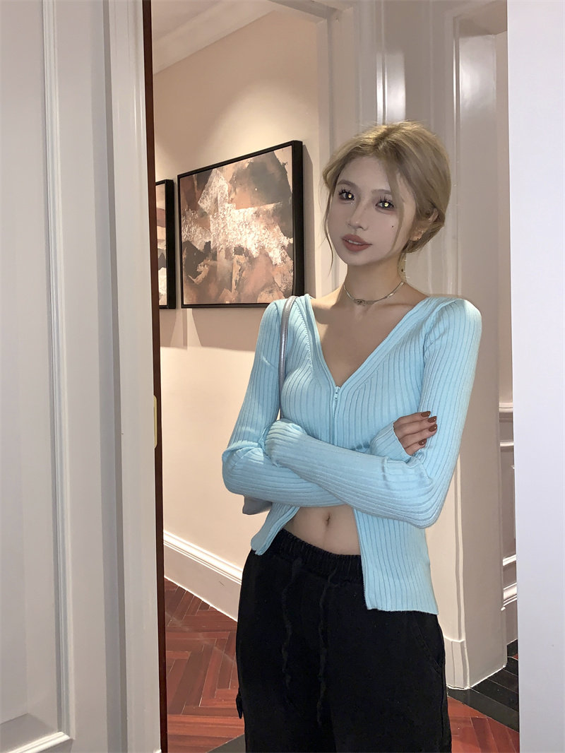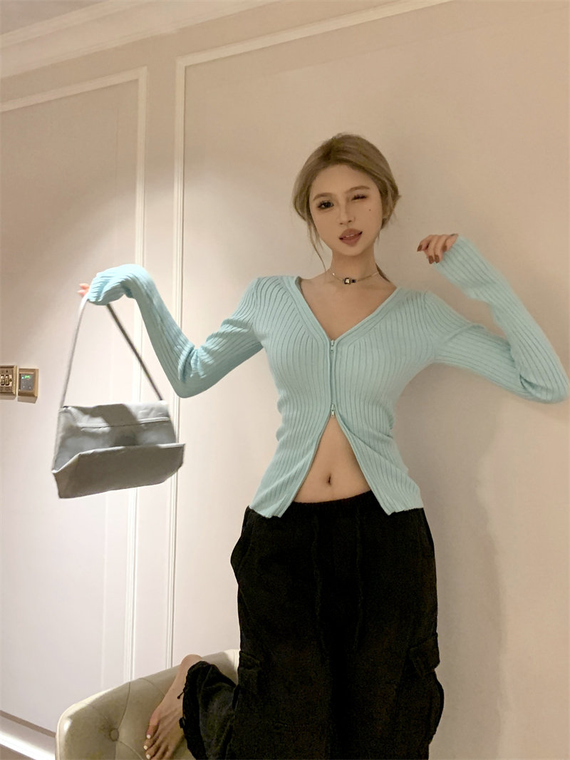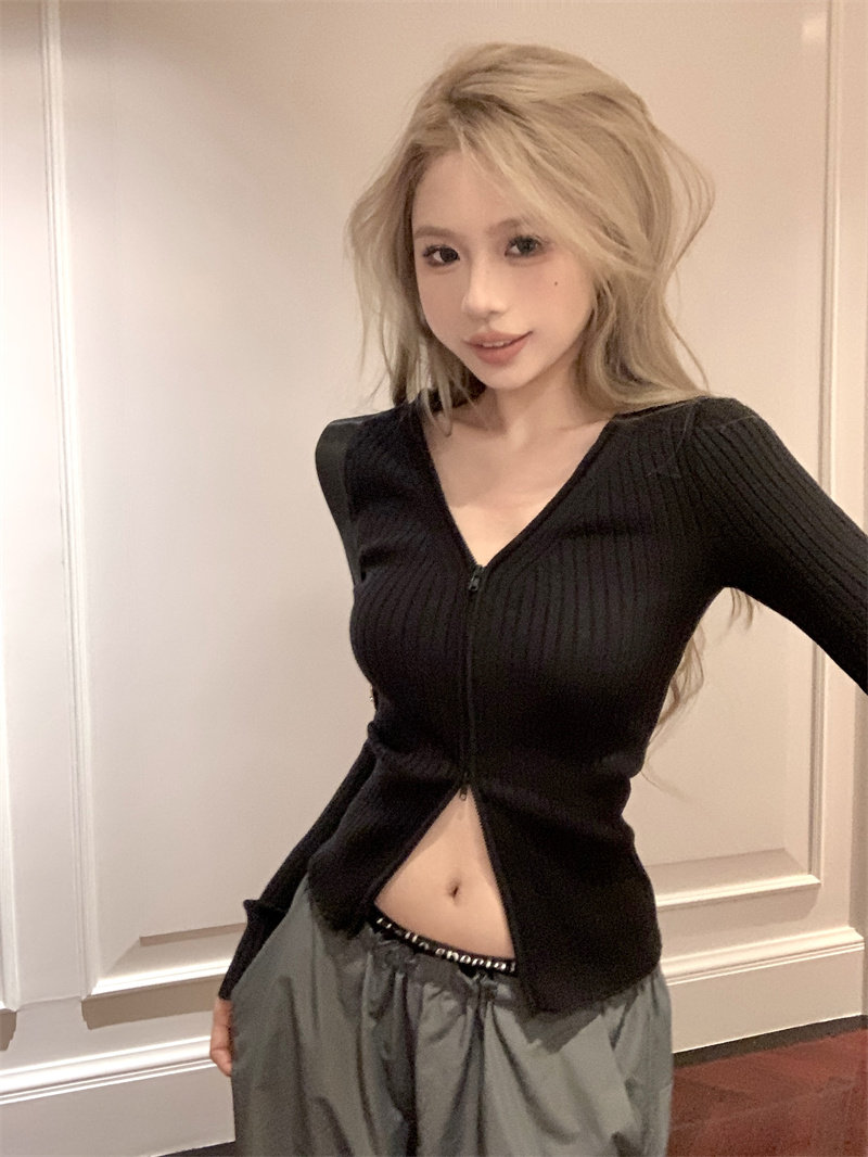 Трикотажный лонгслив, осенний свитер, кардиган с молнией, базовая приятная телу куртка, V-образный вырез, облегающий крой