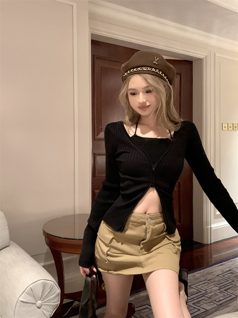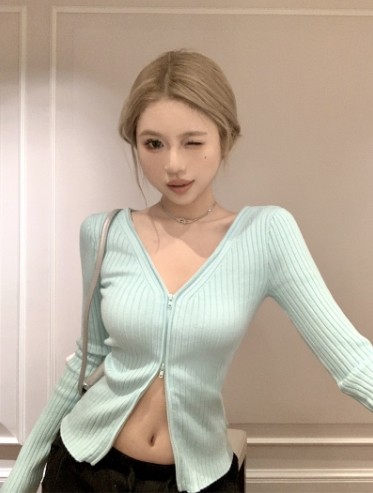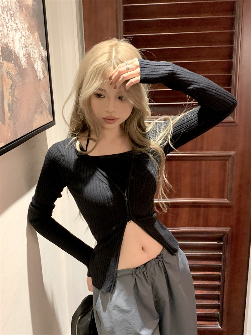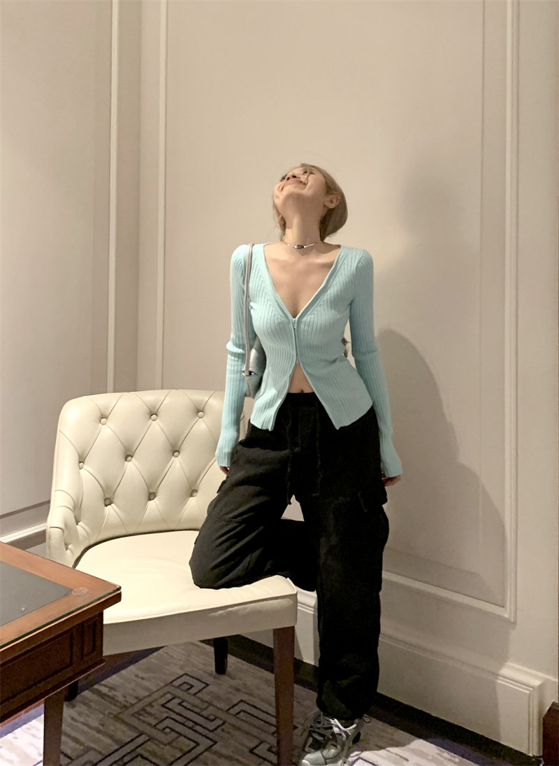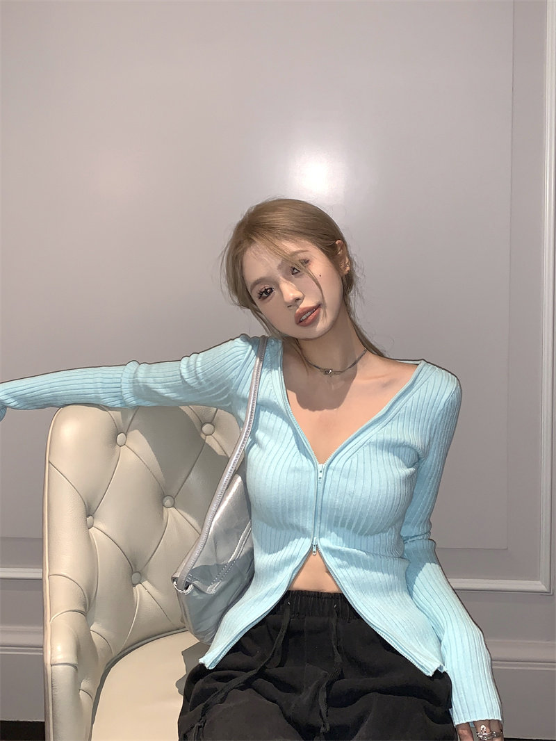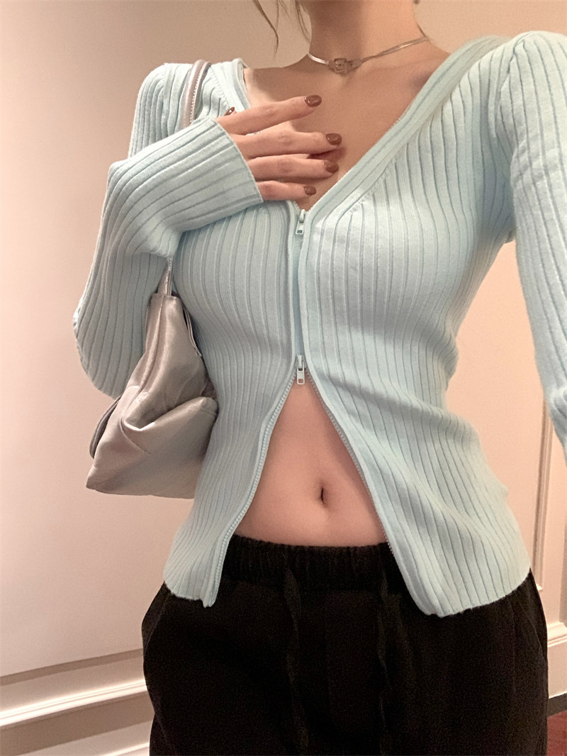Трикотажный лонгслив, осенний свитер, кардиган с молнией, базовая приятная телу куртка, V-образный вырез, облегающий крой