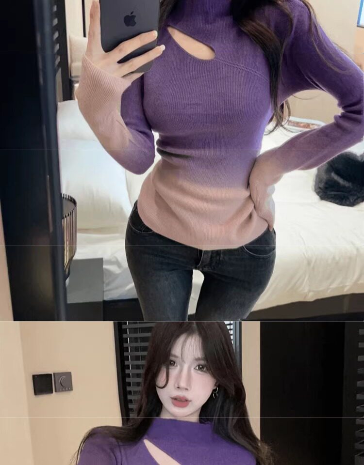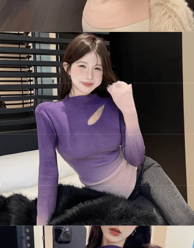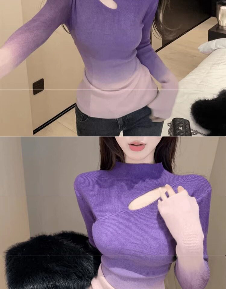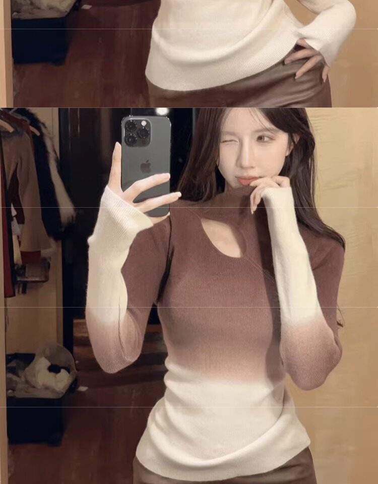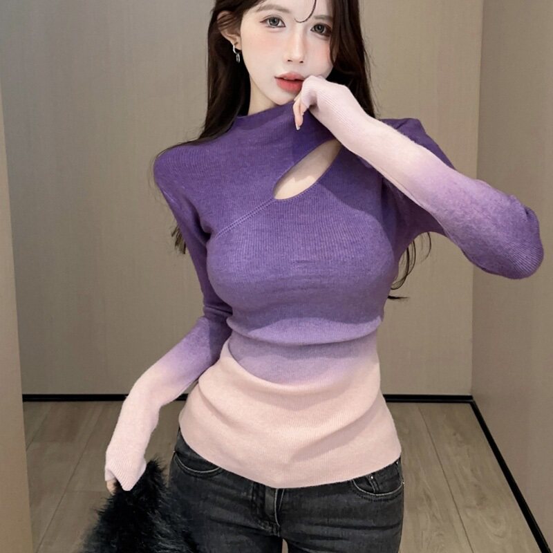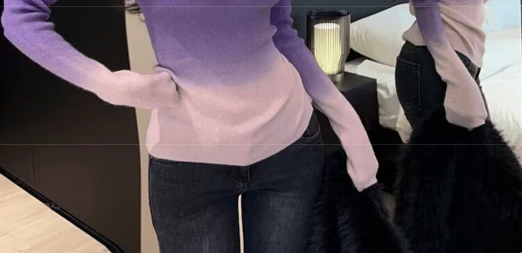 Цветной демисезонный трикотажный базовый приятный телу свитер, градиент, высокий воротник, изысканный стиль