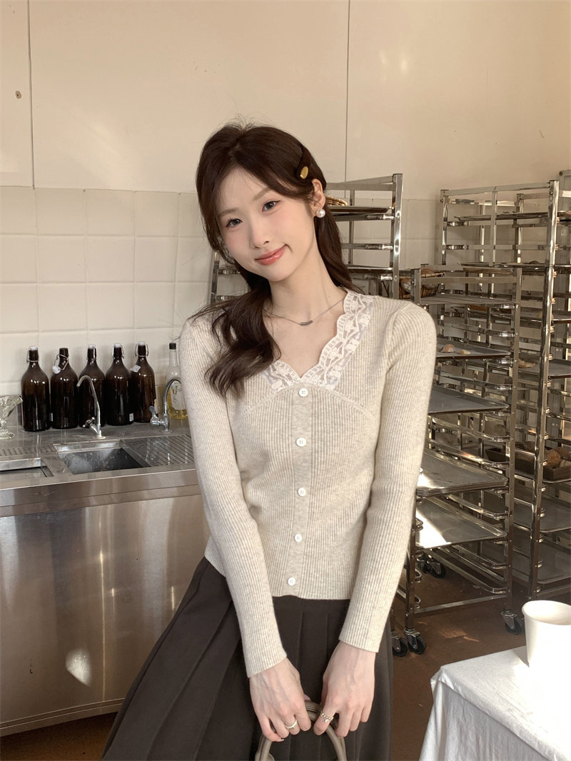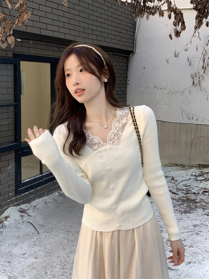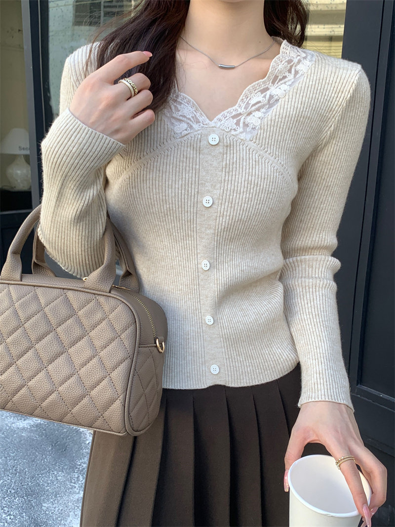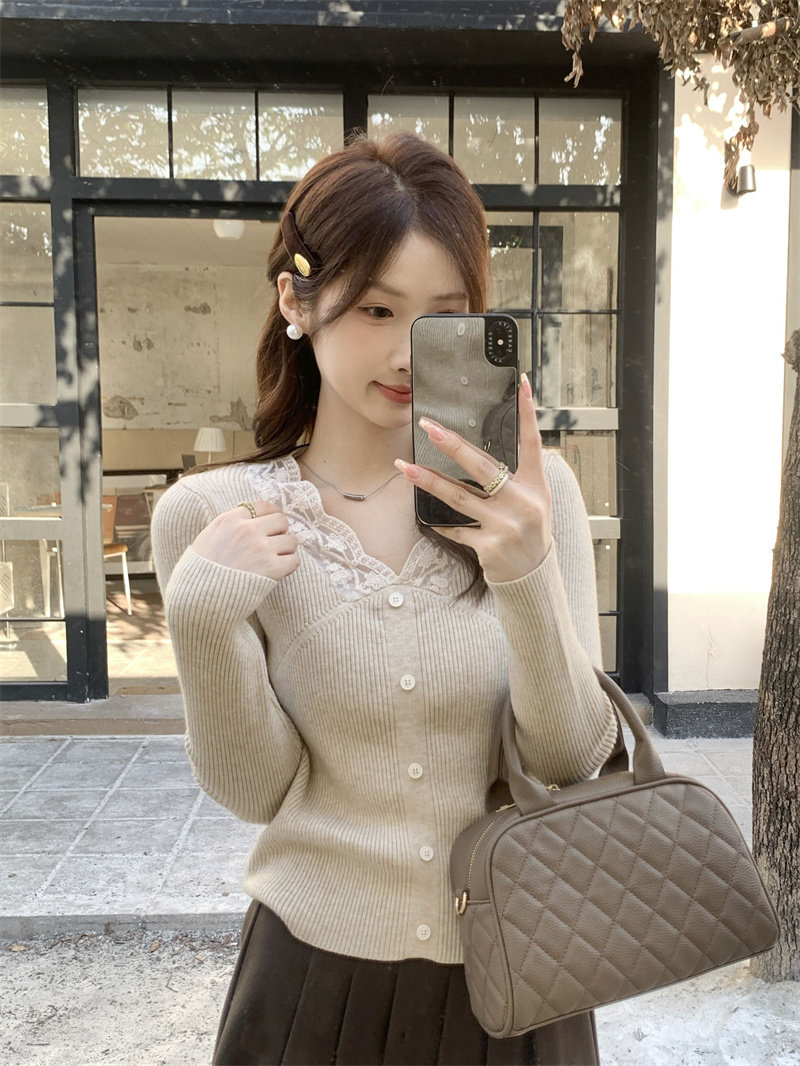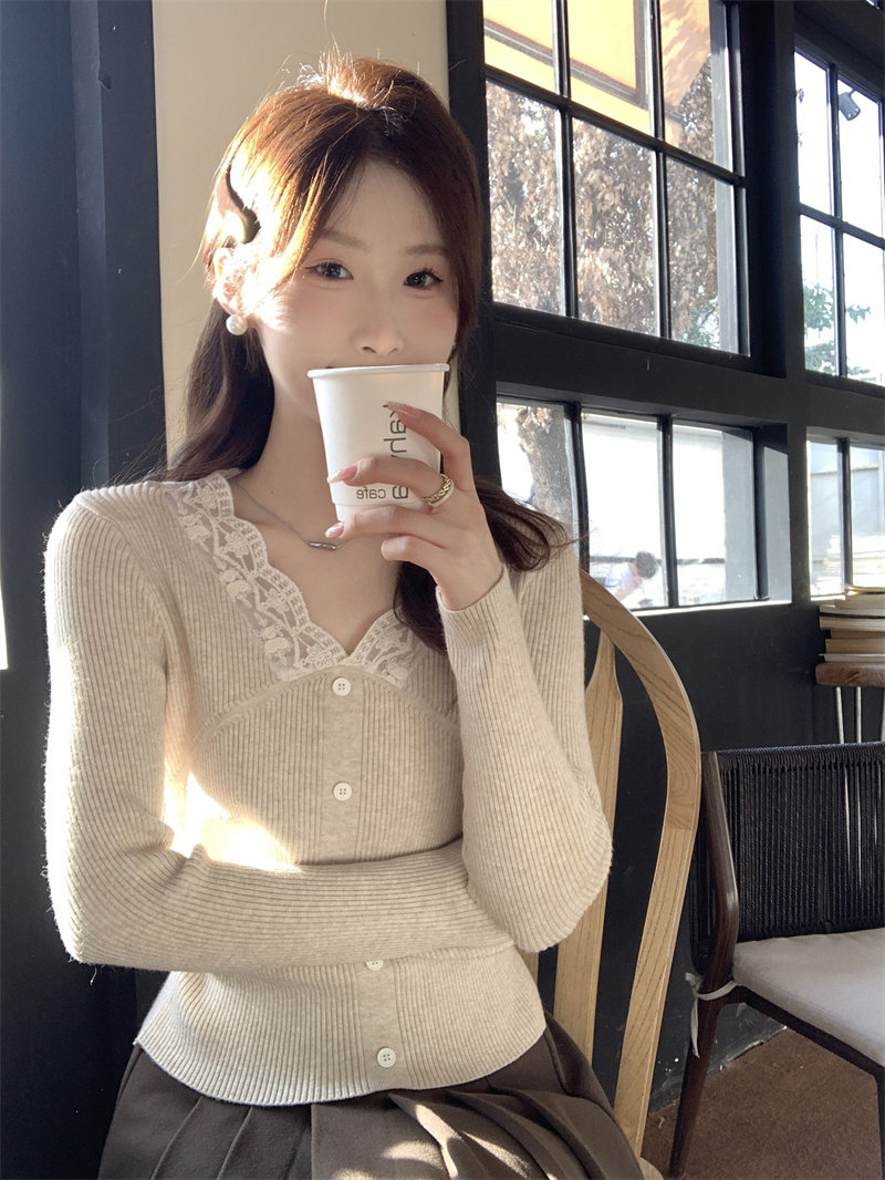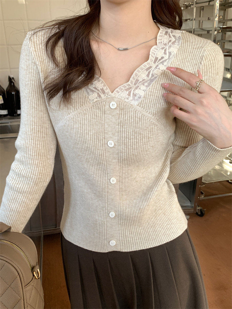 Французский нежный стиль кружев V-образной рубашку для женщин 2024 Новый весна и осенний тонкий подход Slim Внутренний верх