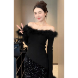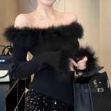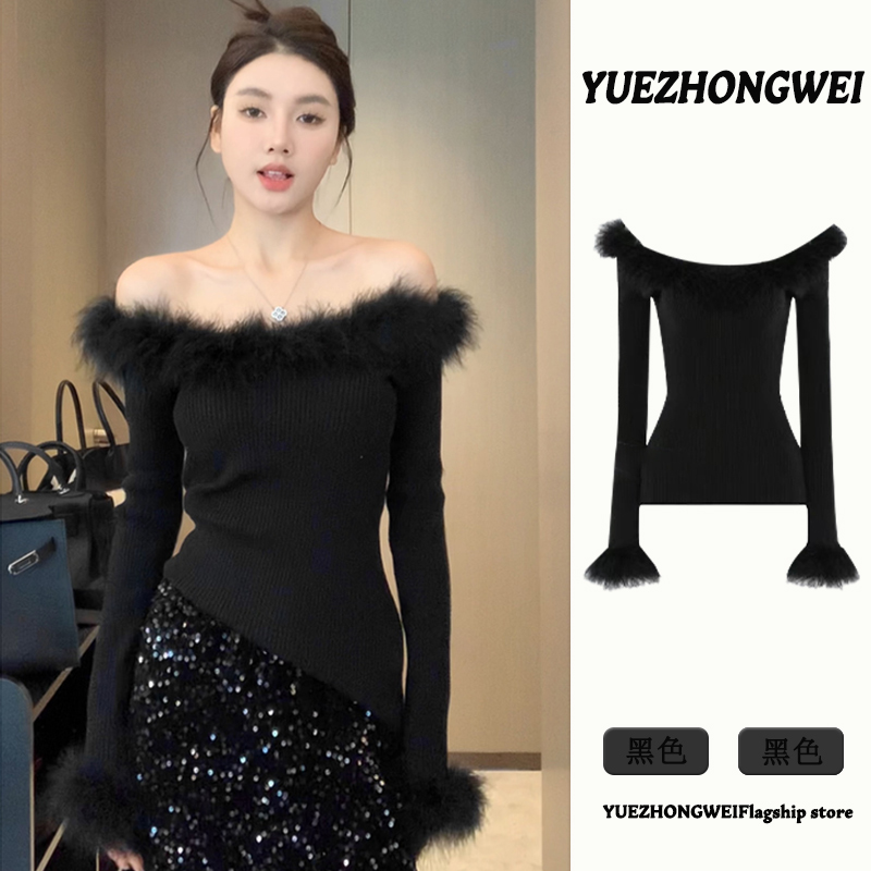 Зимний черный трикотажный демисезонный свитер с узкими плечами, открытые плечи