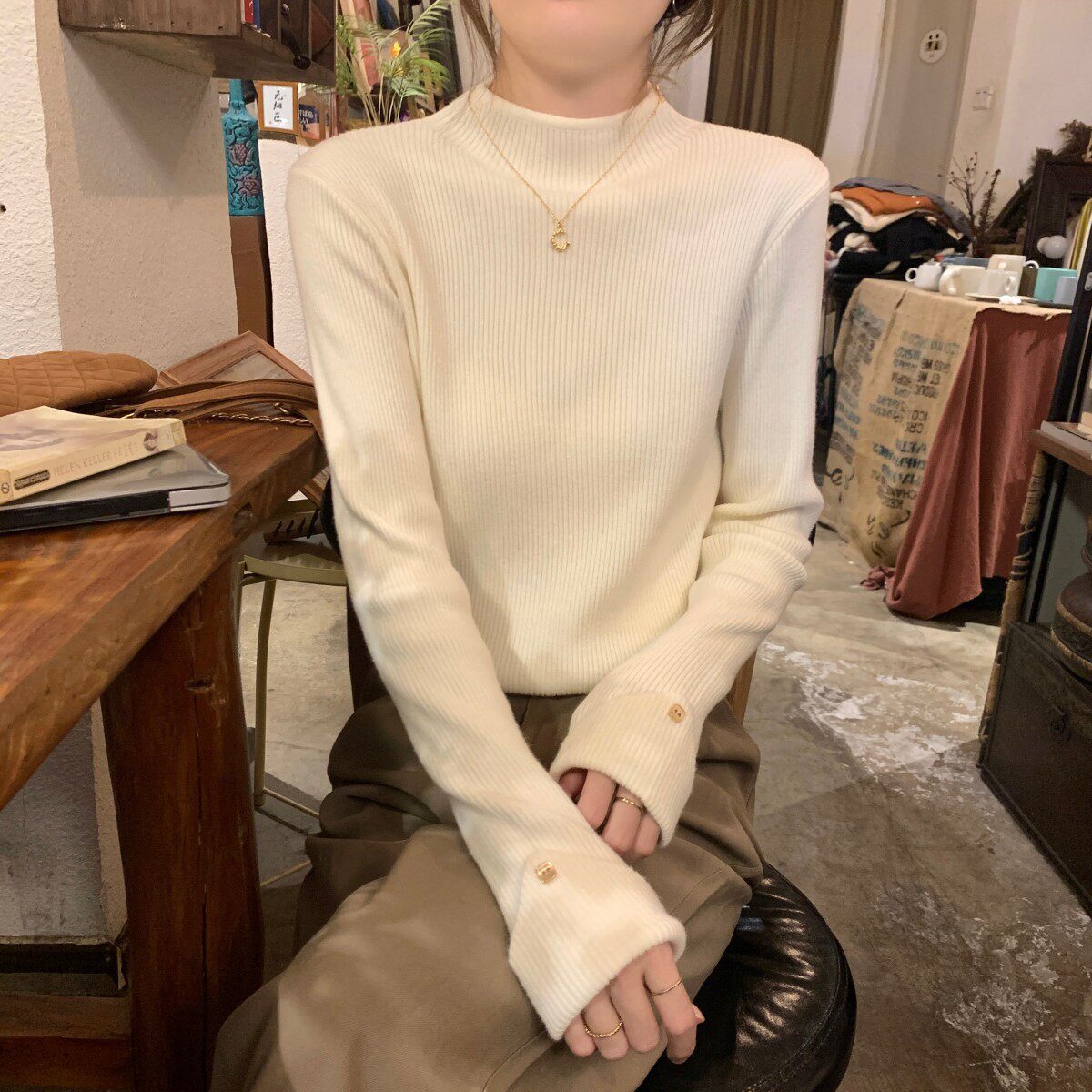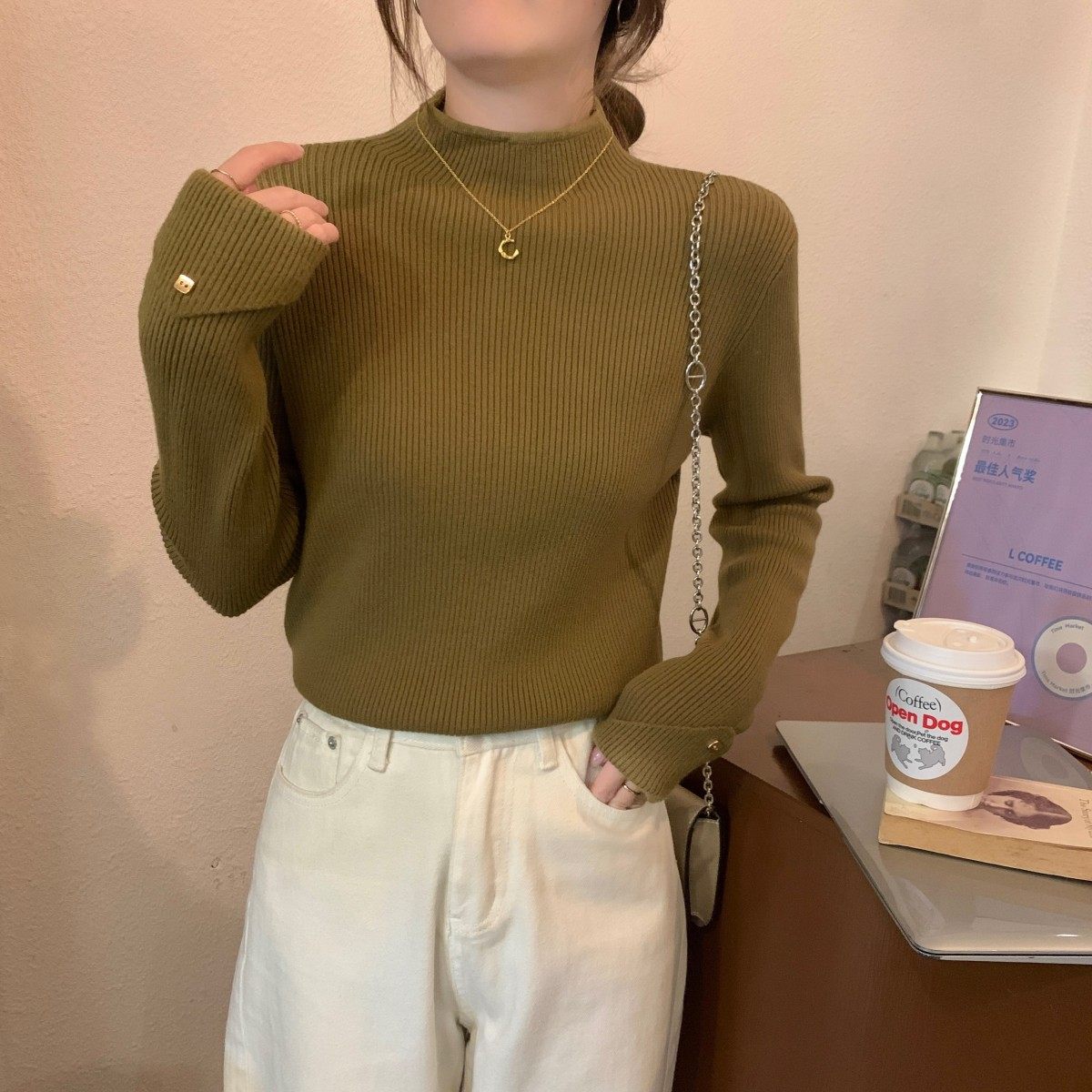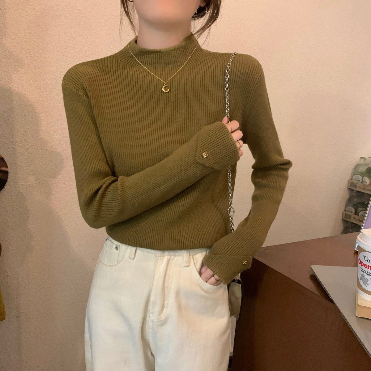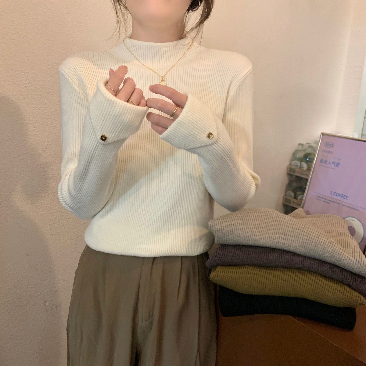 Весенний демисезонный цветной базовый приятный телу трикотажный свитер, высокий воротник, в западном стиле, облегающий крой