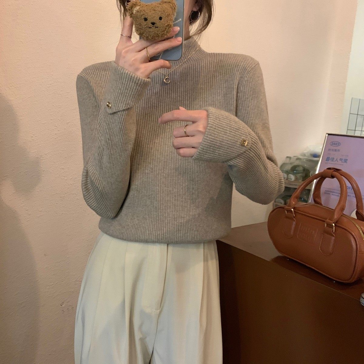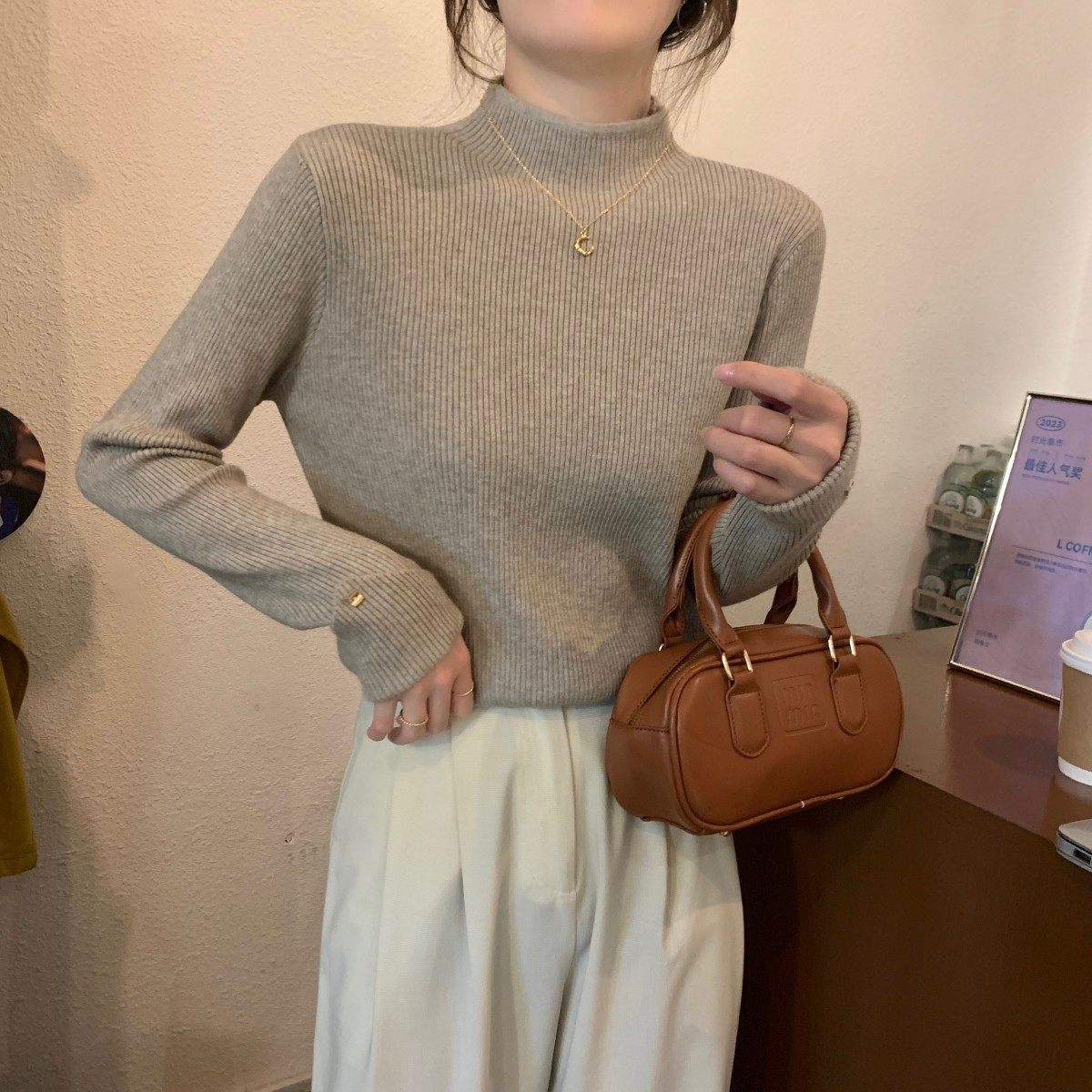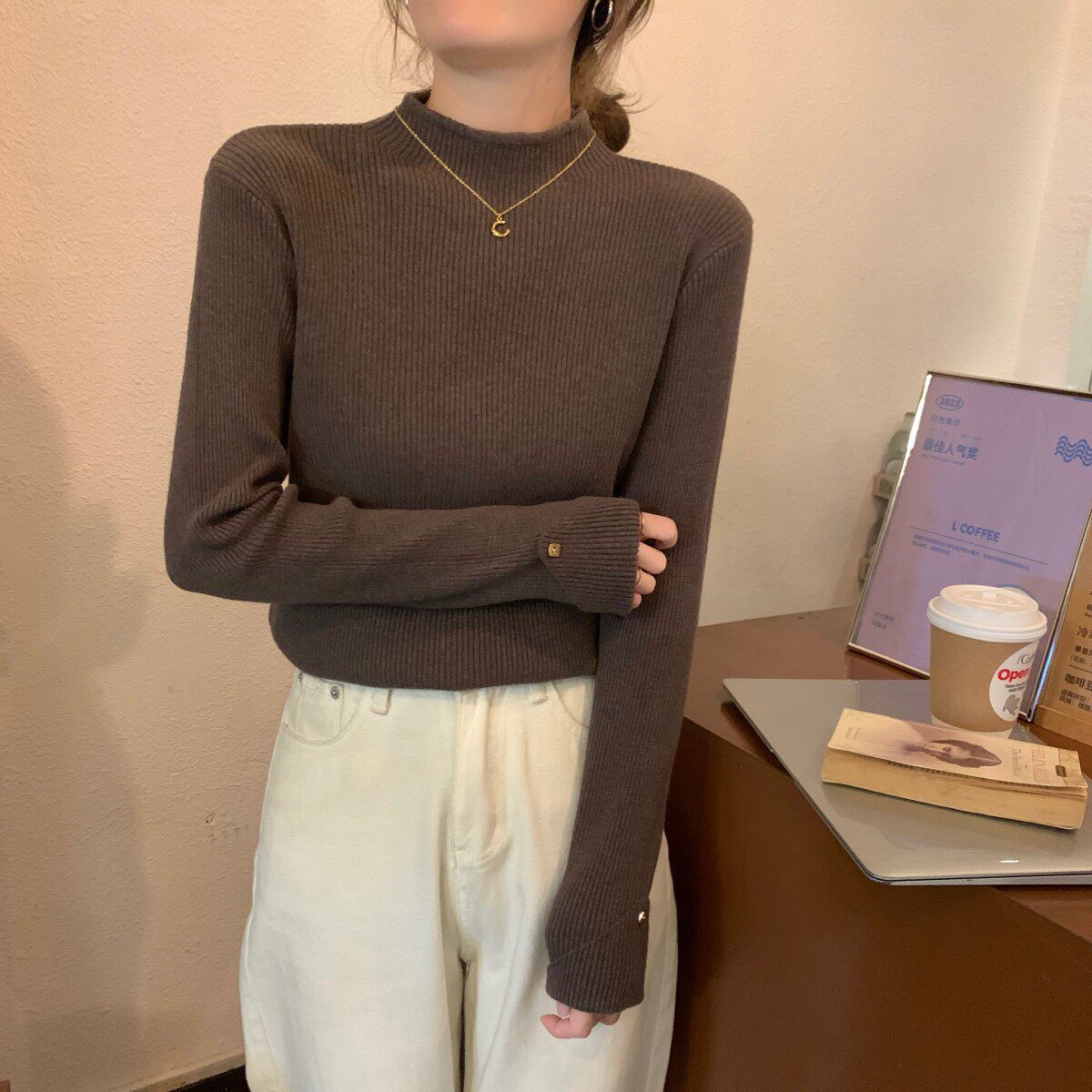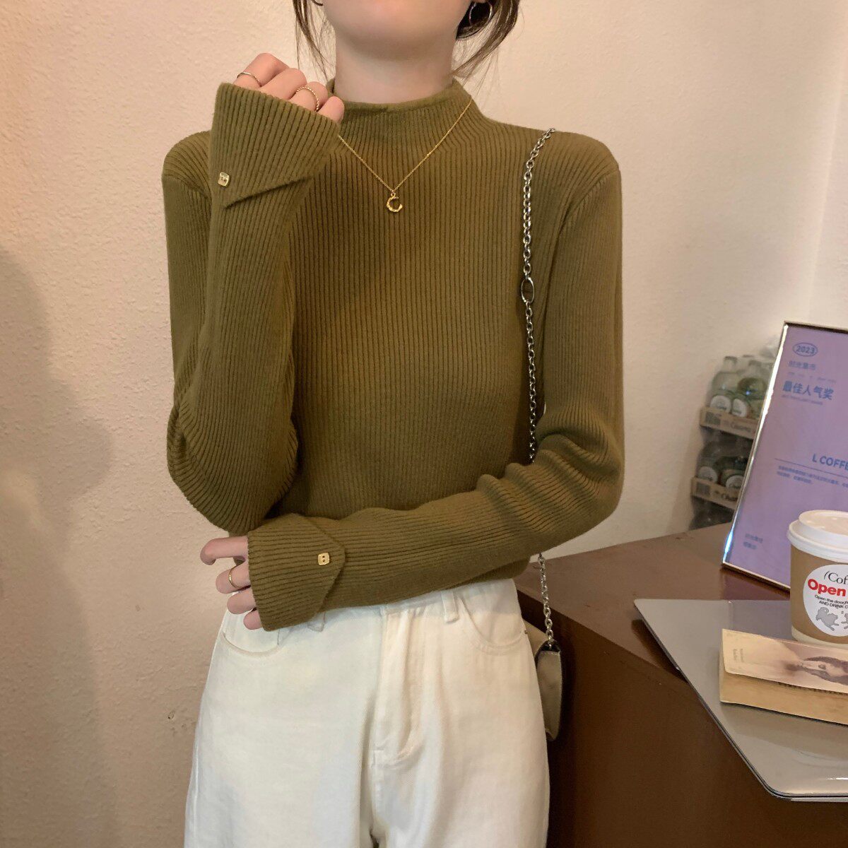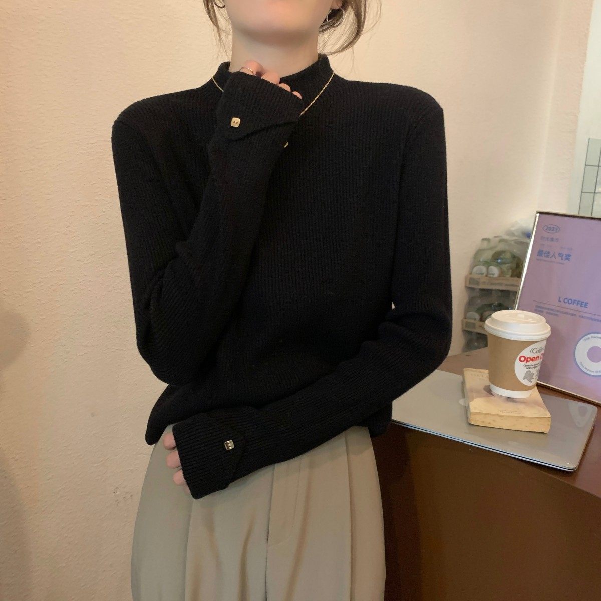 Весенний демисезонный цветной базовый приятный телу трикотажный свитер, высокий воротник, в западном стиле, облегающий крой