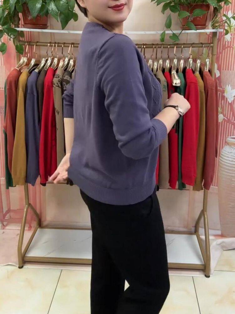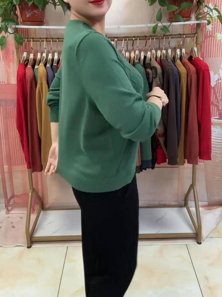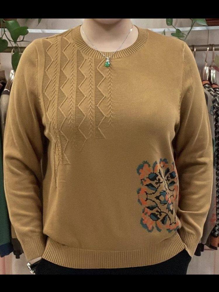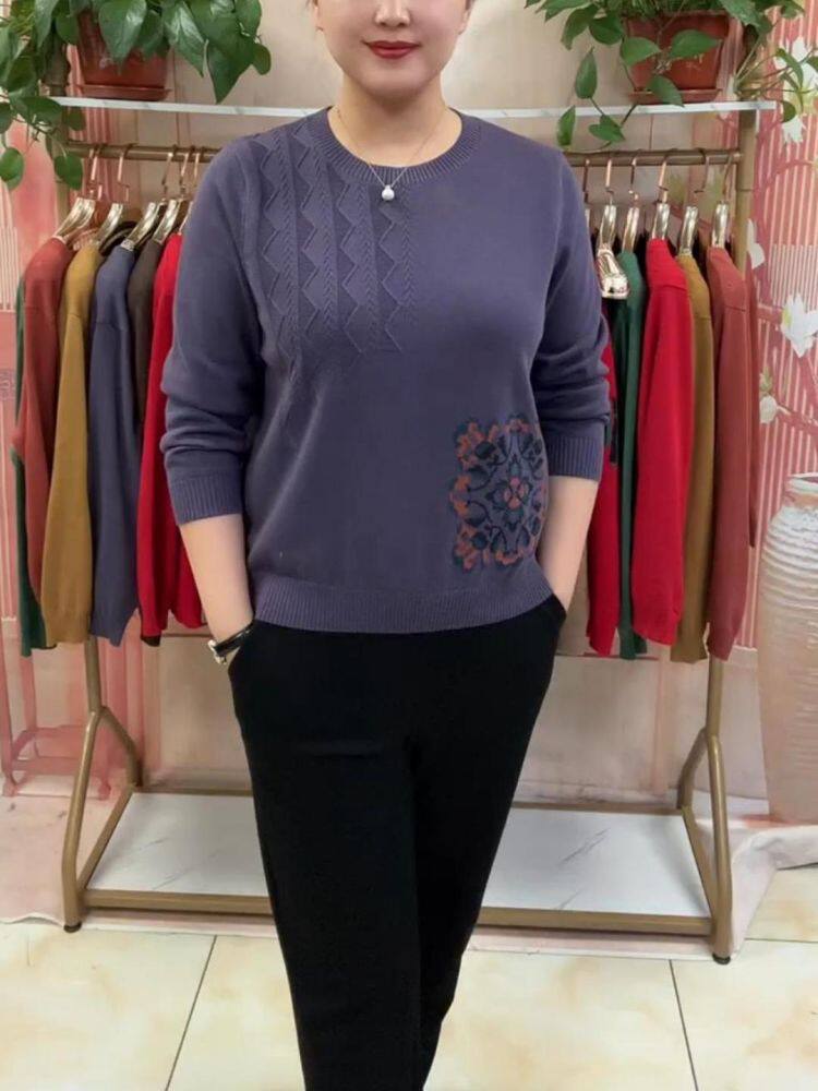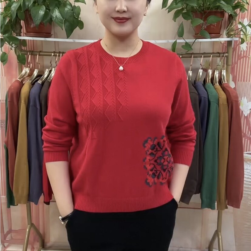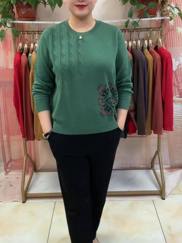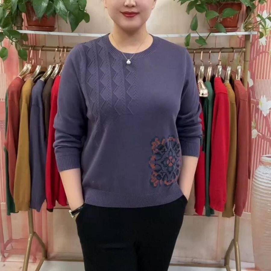 Короткий лонгслив с круглым воротником, трикотажный свитер, классическая длина, свободный крой, для среднего возраста