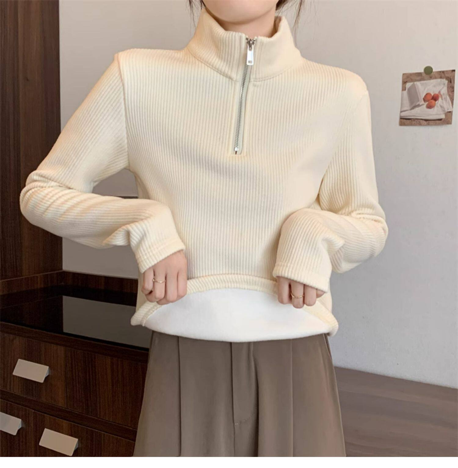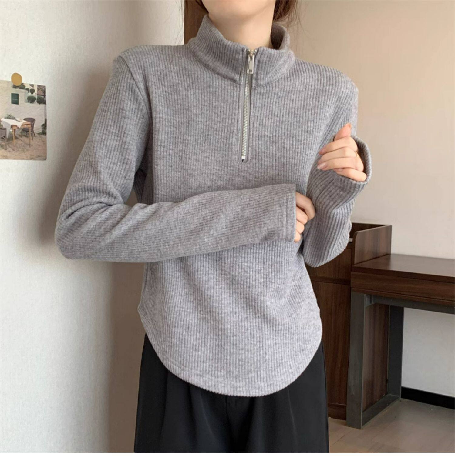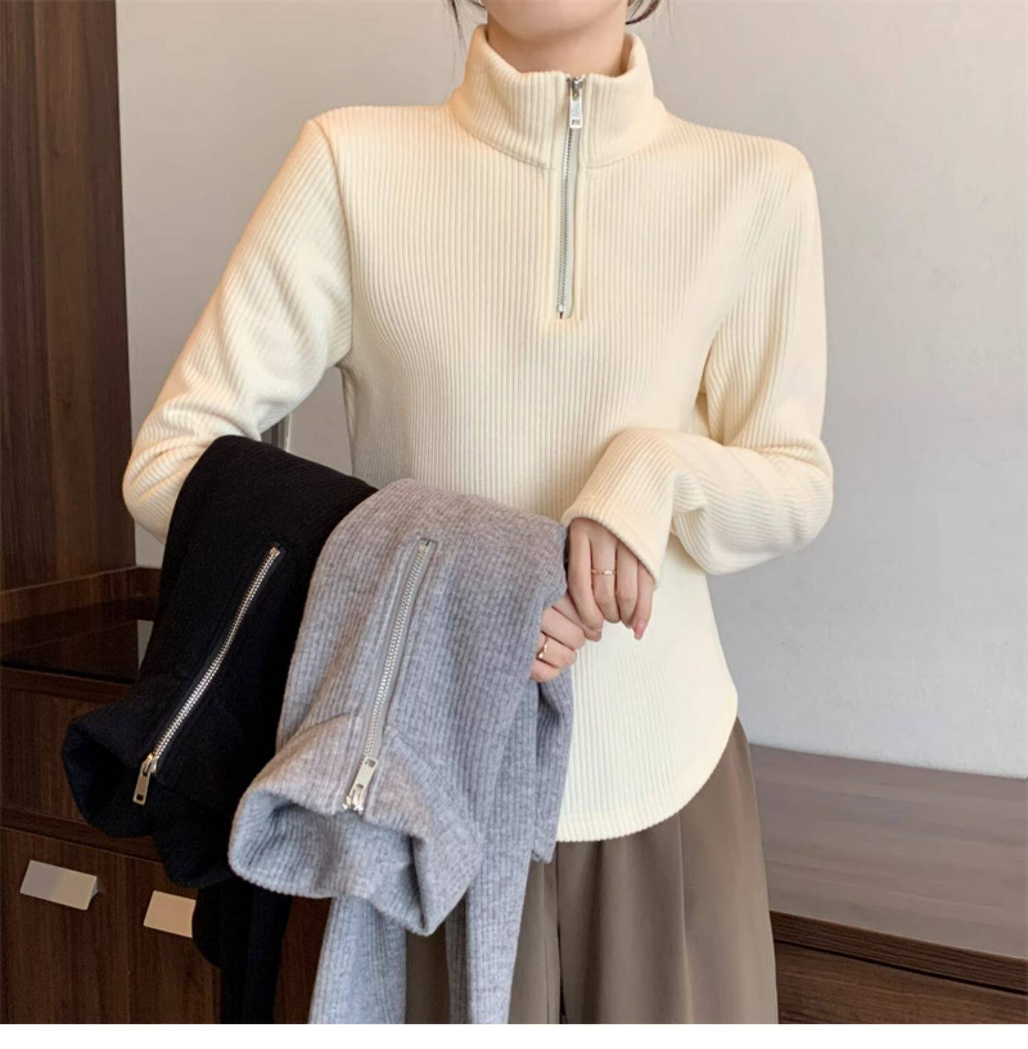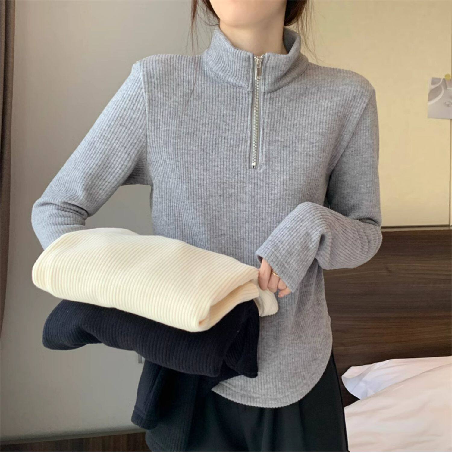 Утепленный демисезонный свитер с молнией, трикотажное приятное телу термобелье, большой размер, высокий воротник