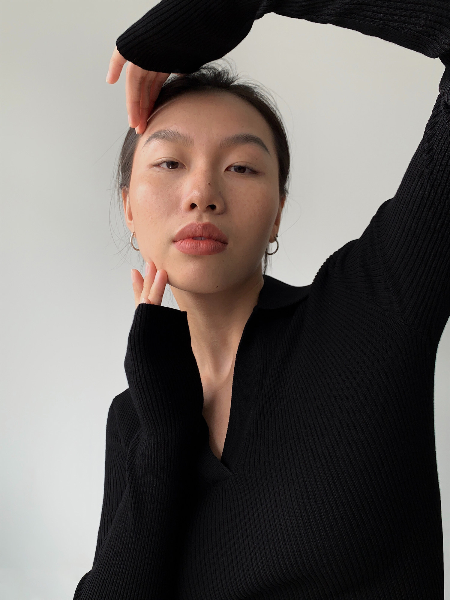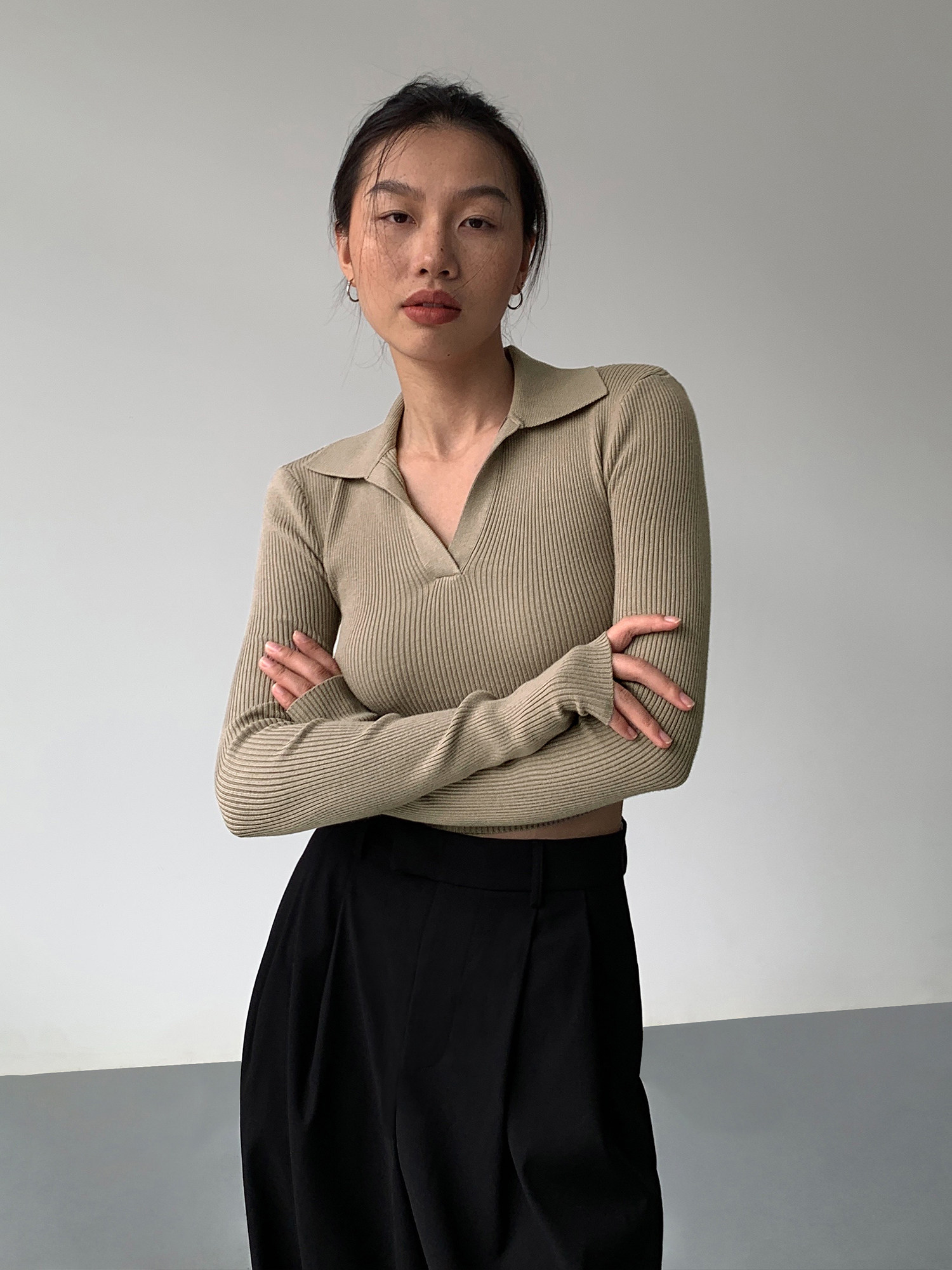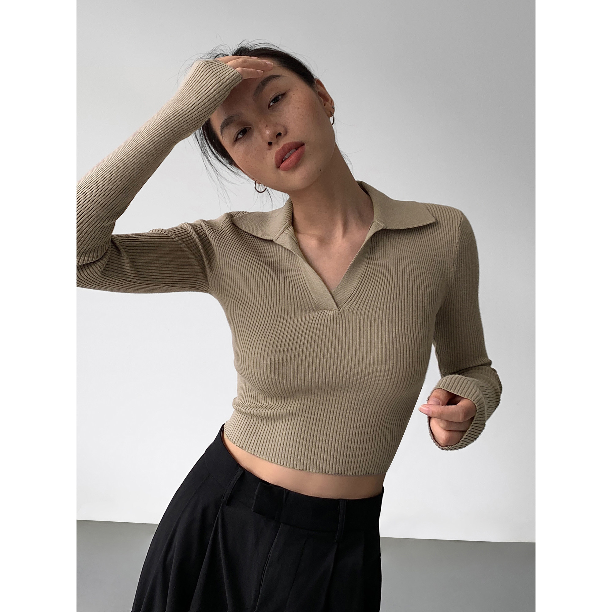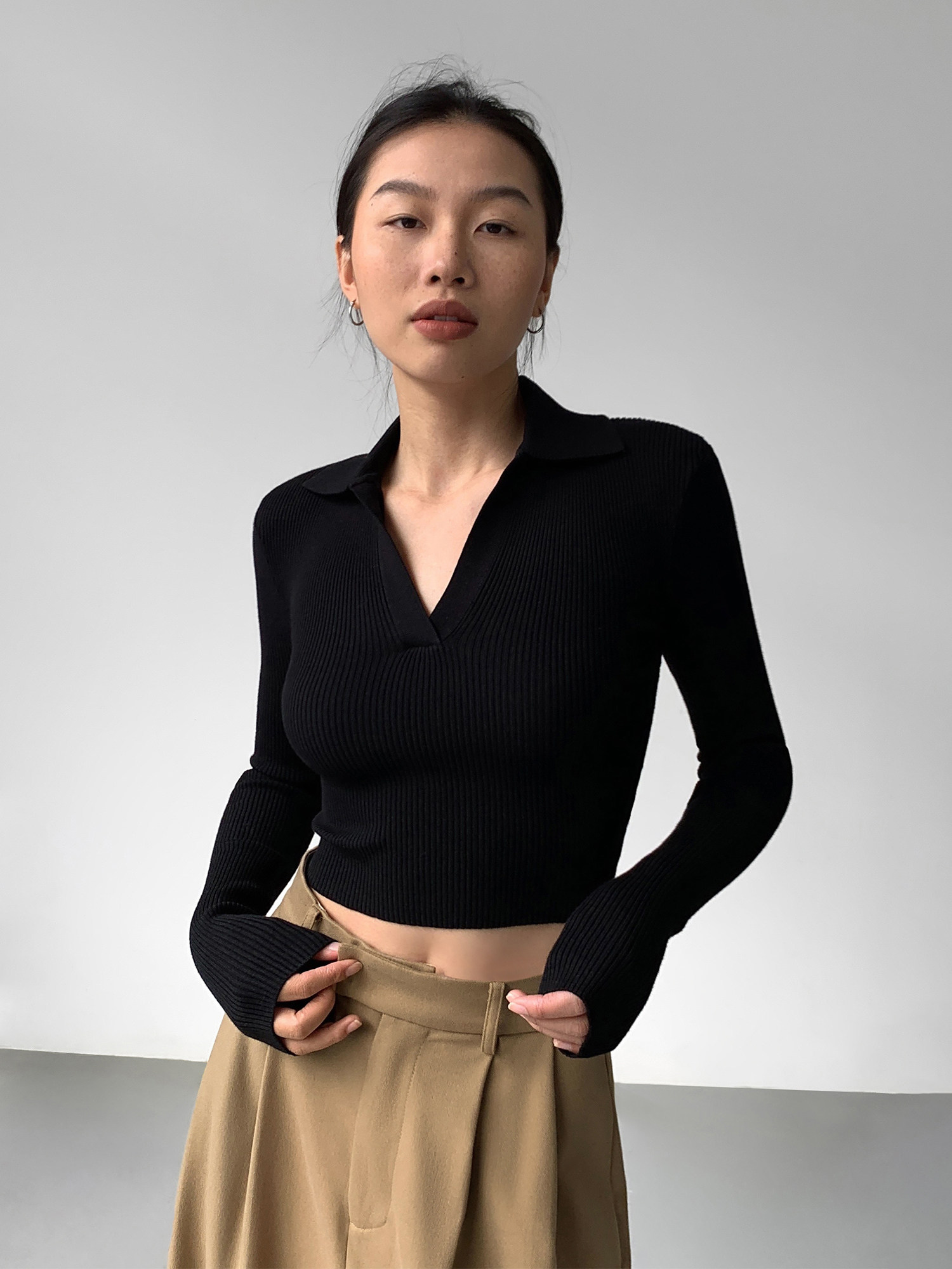 Черный лонгслив, трикотажный весенний приталенный свитер, V-образный вырез, в корейском стиле, яркий броский стиль