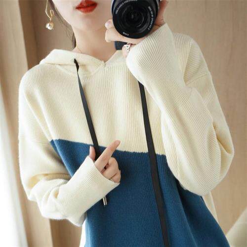 Вязаный женский шерстяной свитер с контрастной вставкой и воротником с капюшоном, топ L