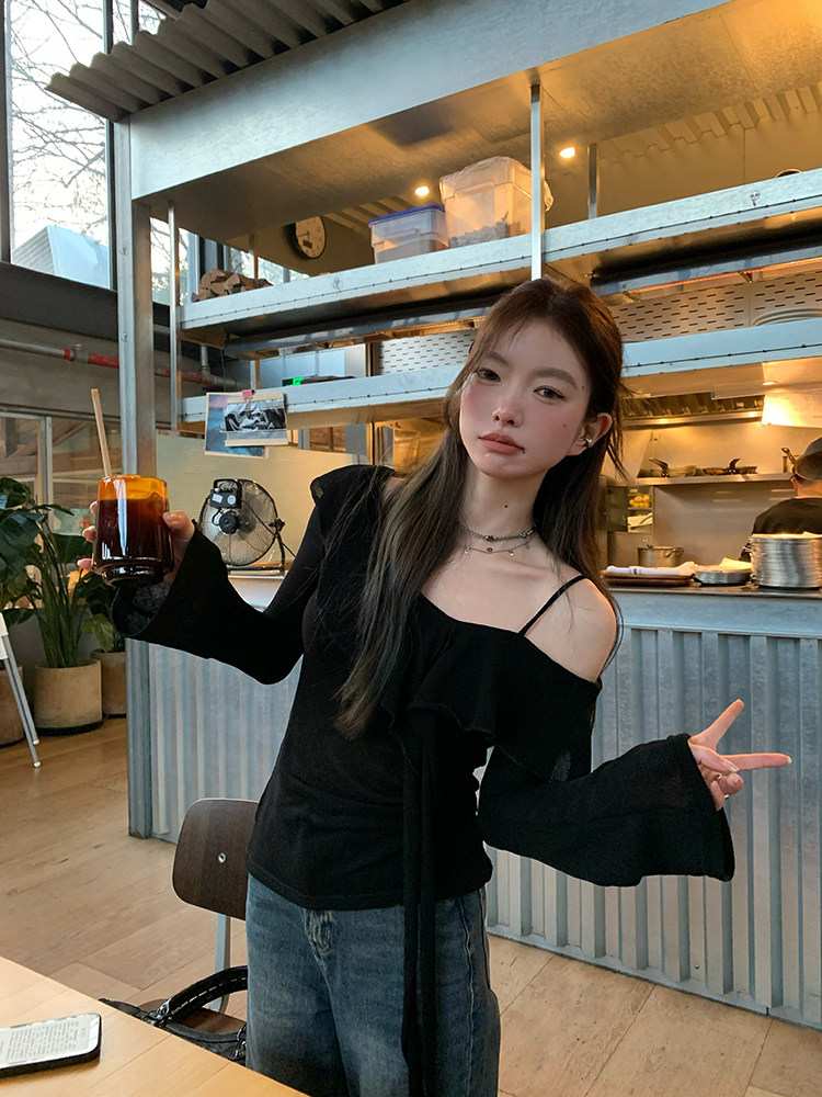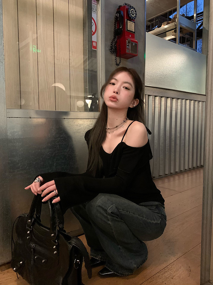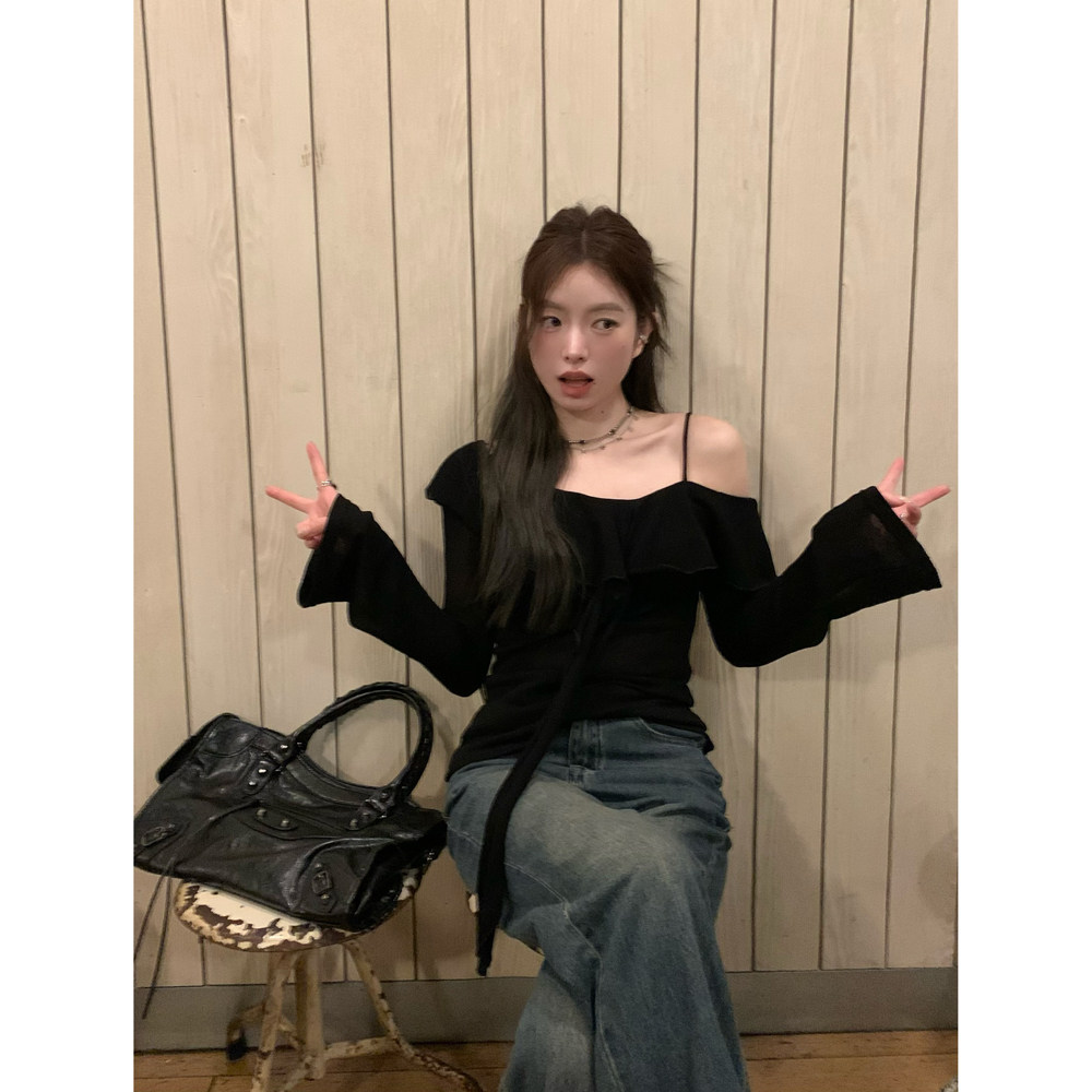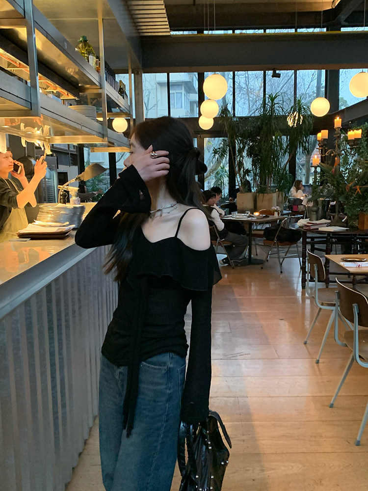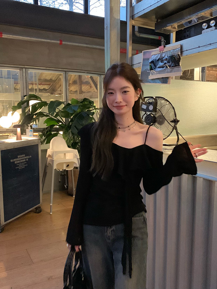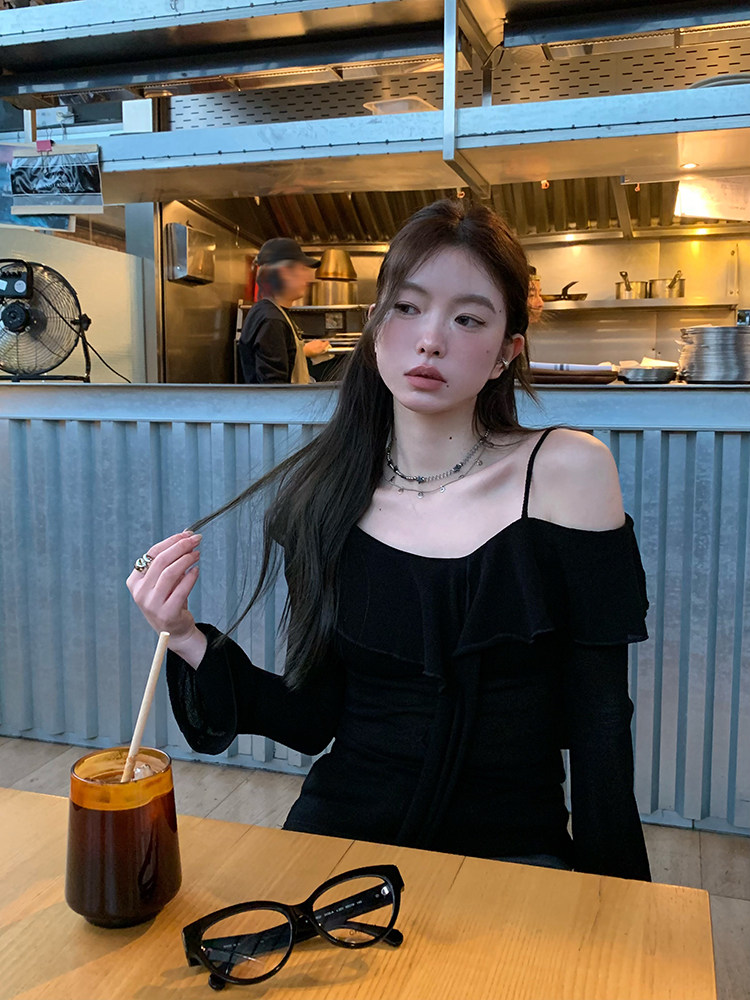 Черный трикотажный ретро свитер, базовый приятный телу лонгслив, открытые плечи