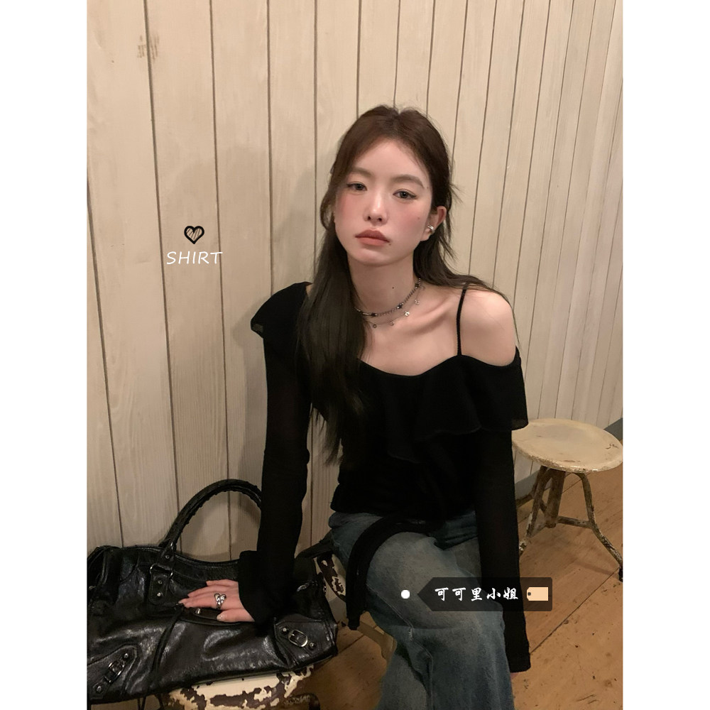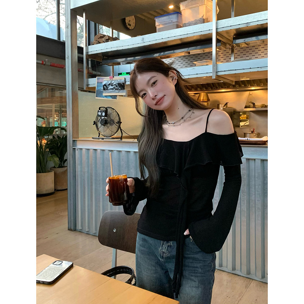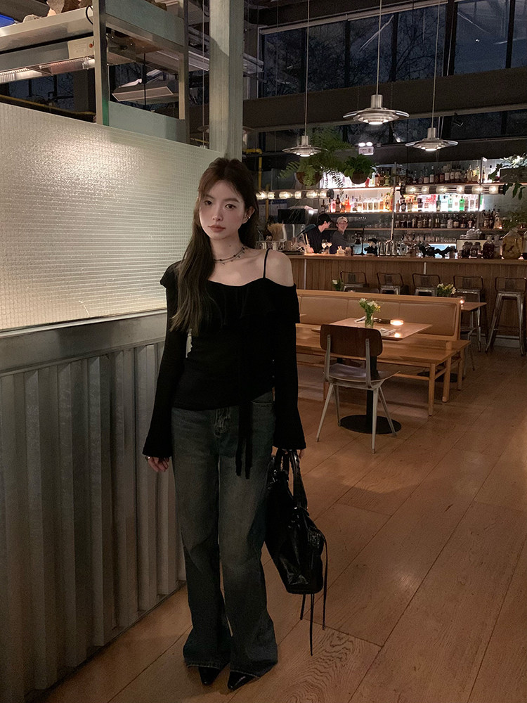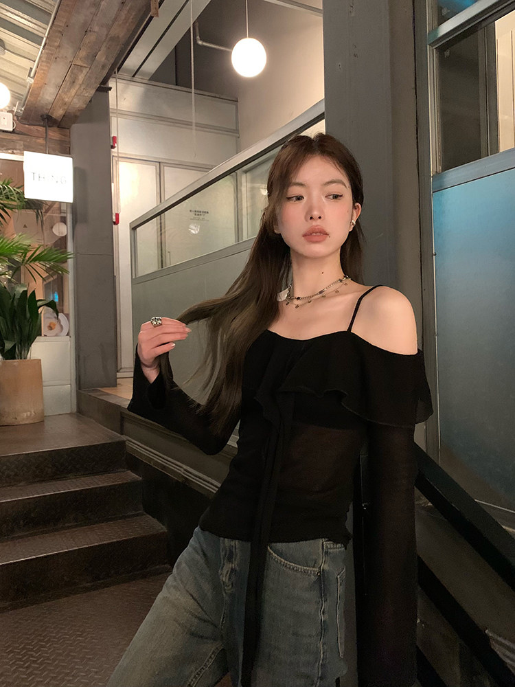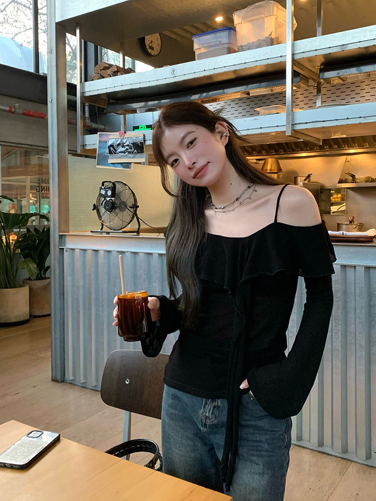 Черный трикотажный ретро свитер, базовый приятный телу лонгслив, открытые плечи