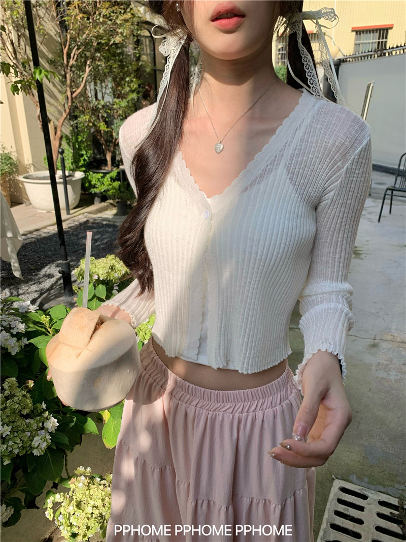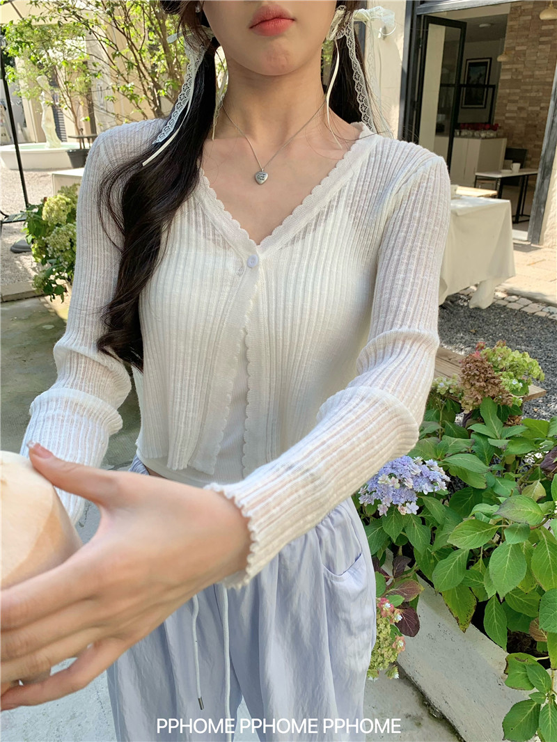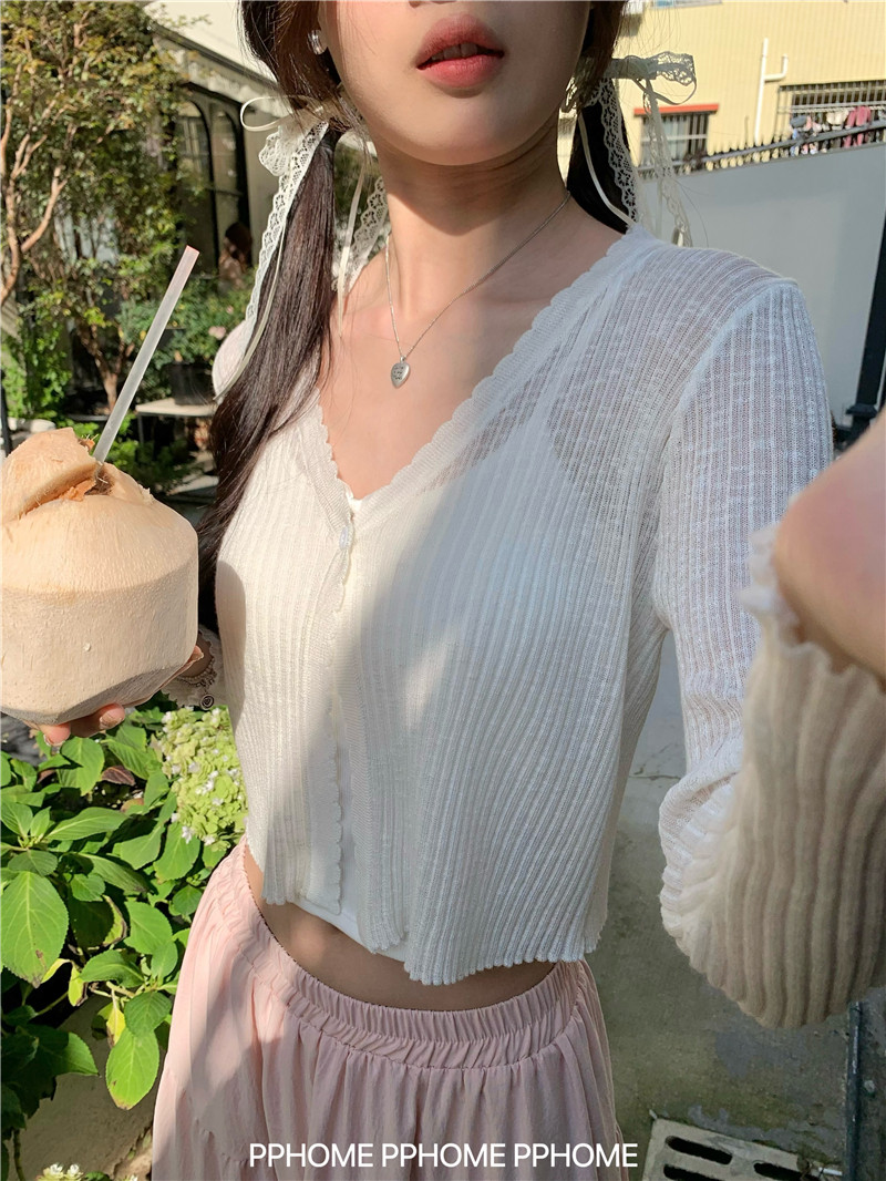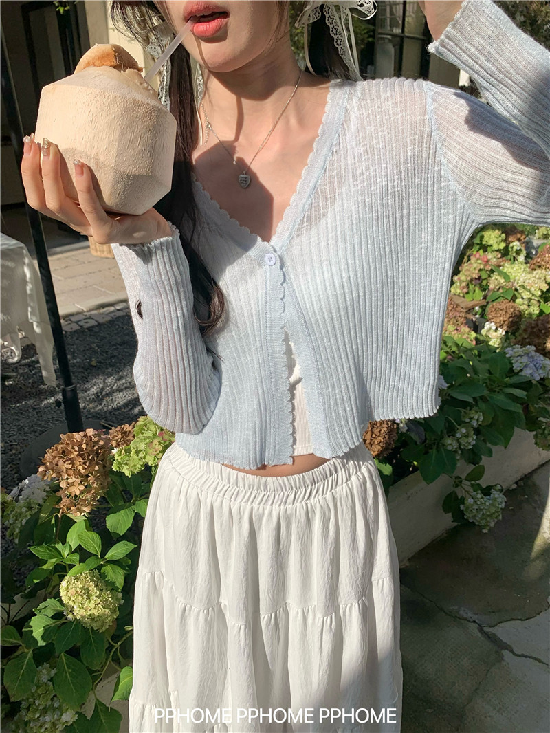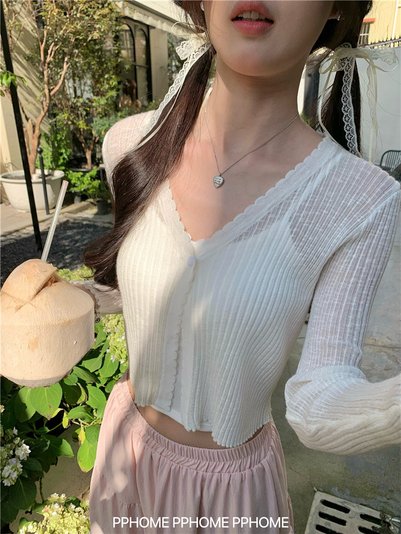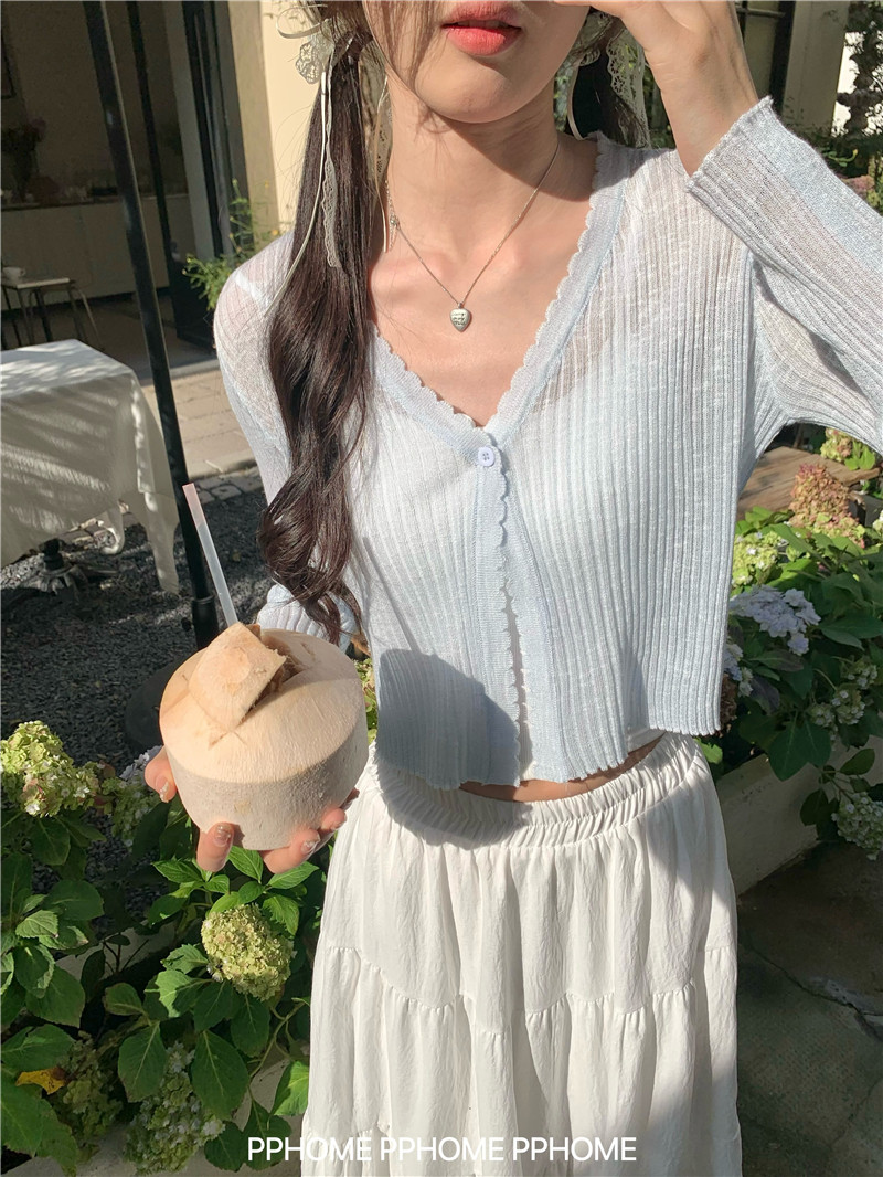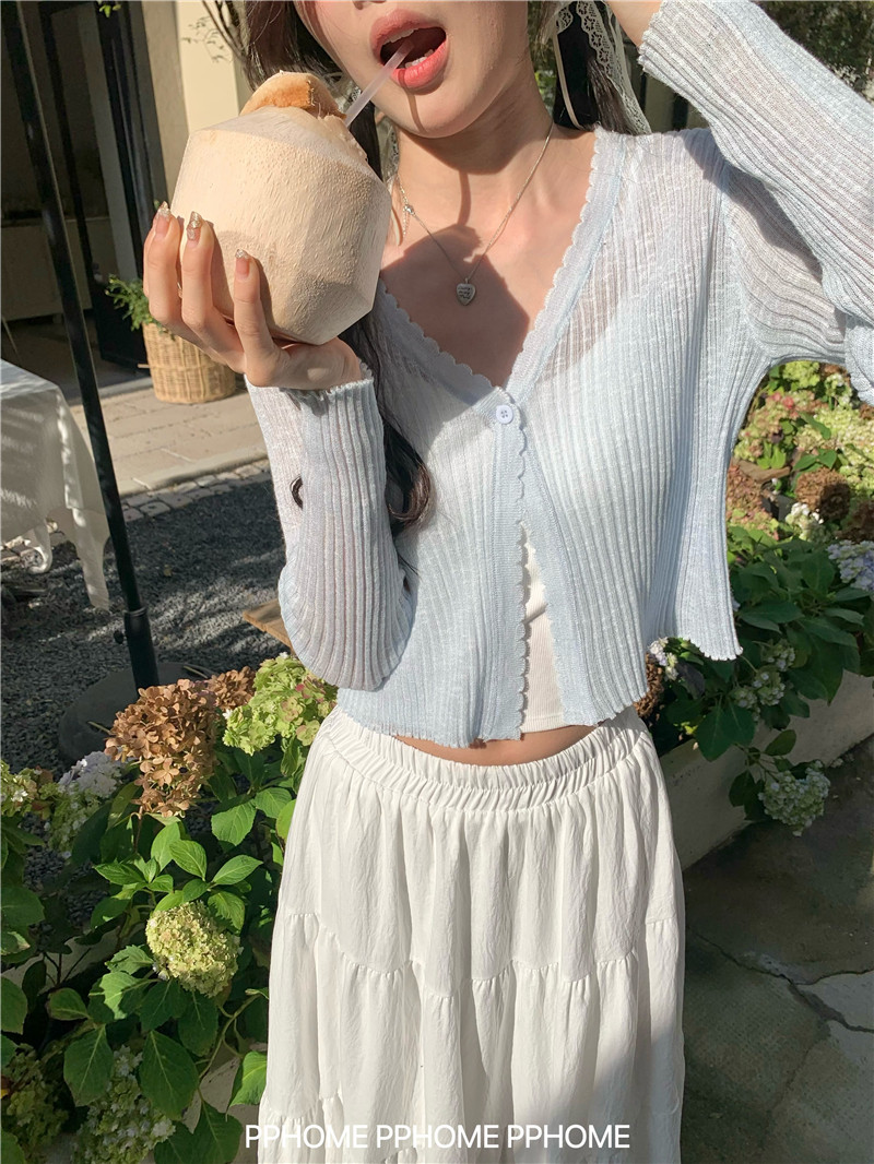PPHOME домашний ~ ледяной шелк, открытая 𫔭 рубашка летняя легкая трикотажная с длинными рукавами открытая 𫔭 рубашка белая солнцезащитная блузка короткий топ для женщин