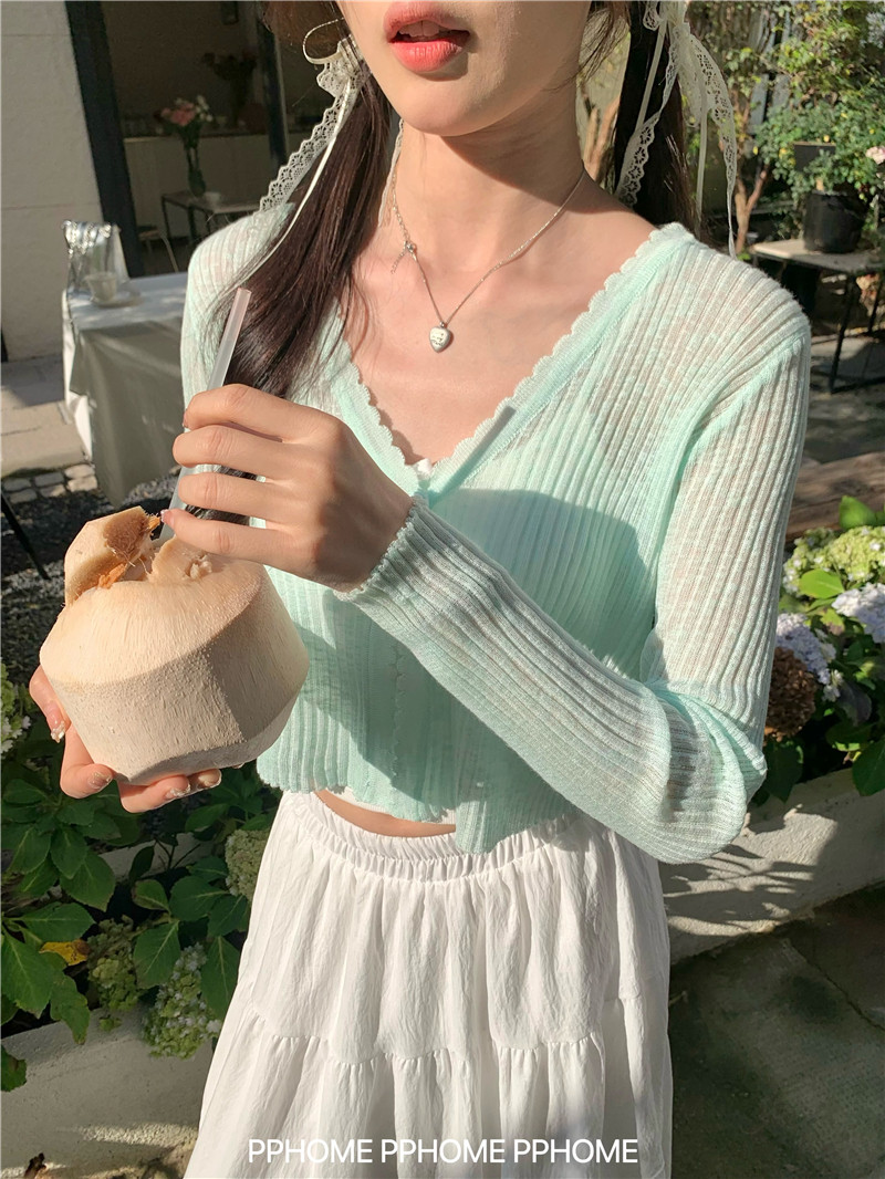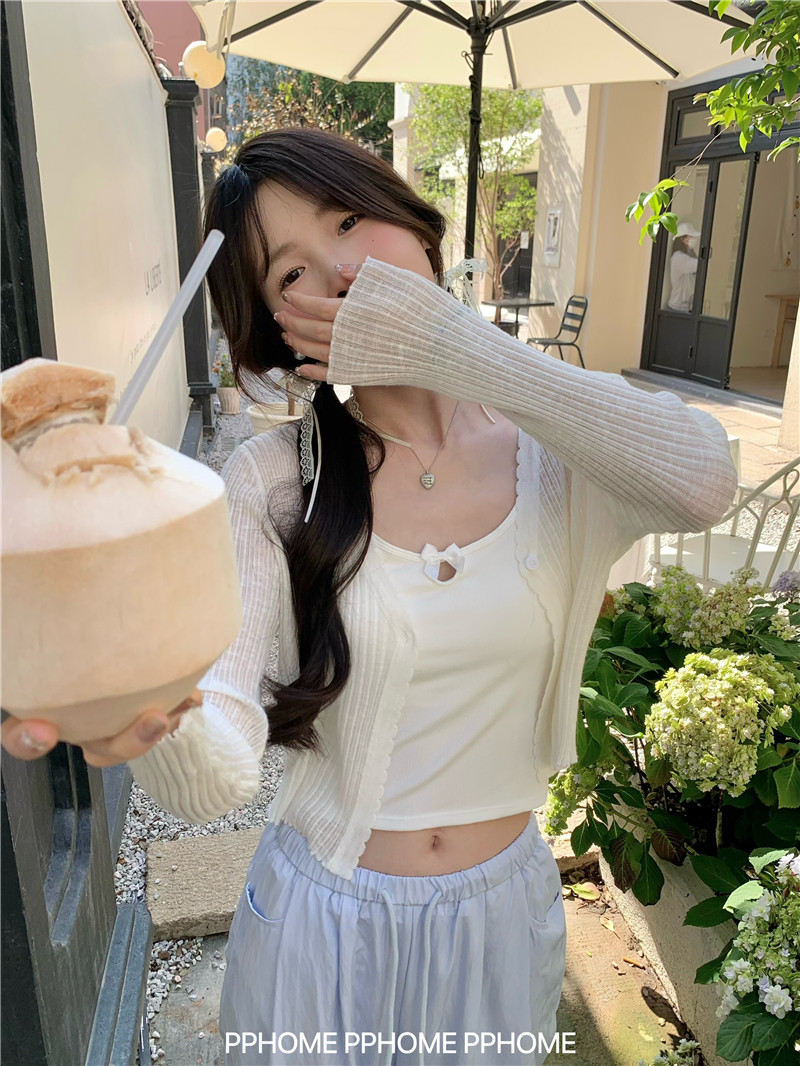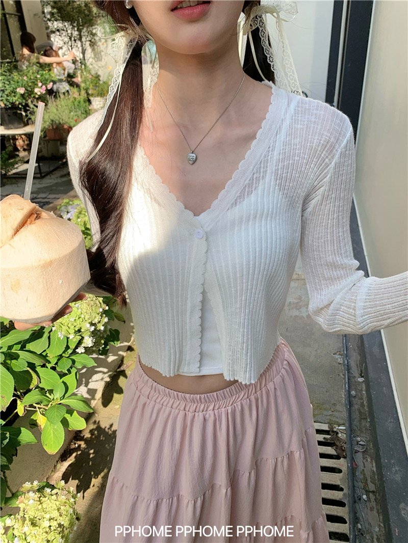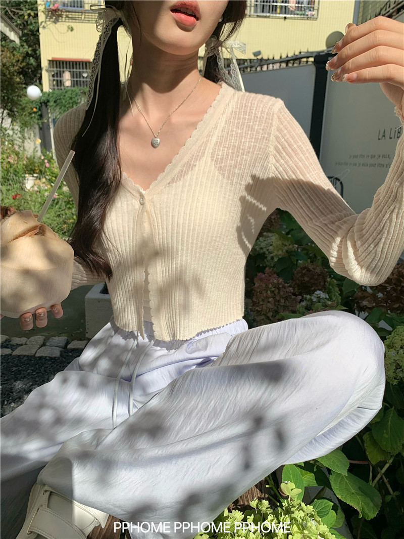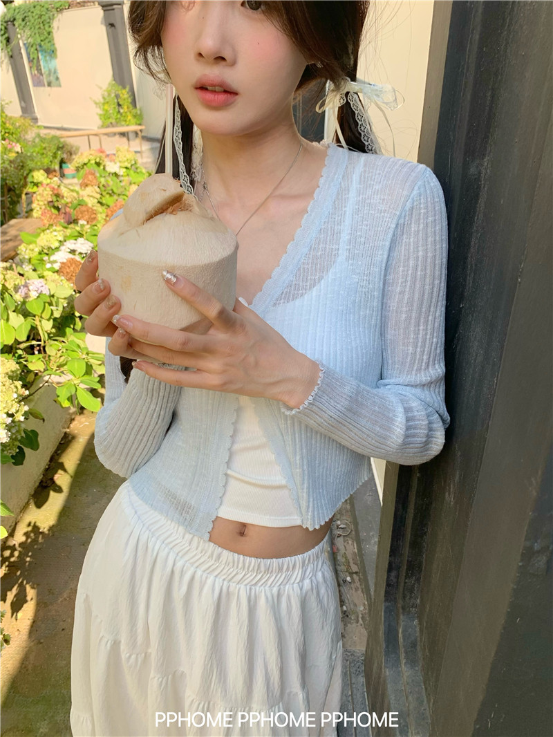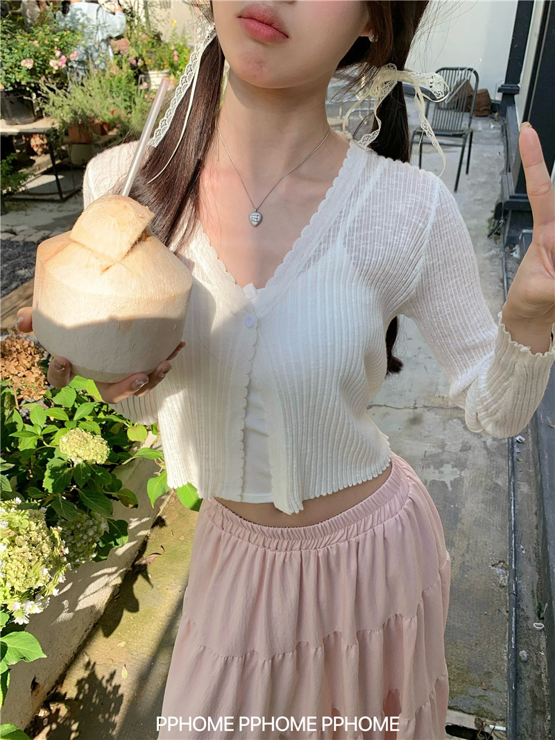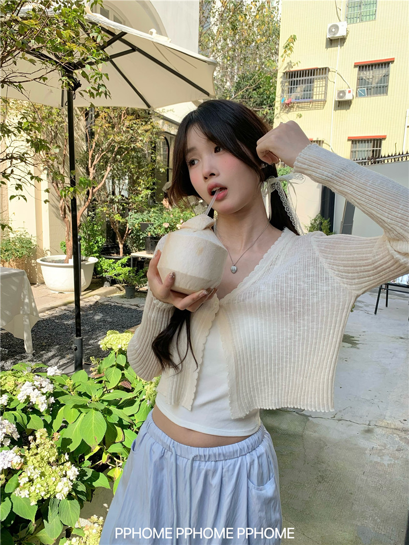 PPHOME домашний ~ ледяной шелк, открытая 𫔭 рубашка летняя легкая трикотажная с длинными рукавами открытая 𫔭 рубашка белая солнцезащитная блузка короткий топ для женщин