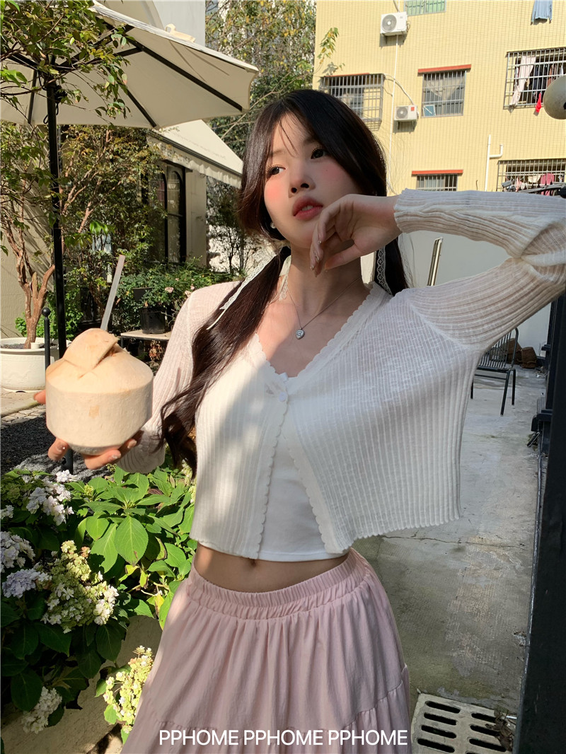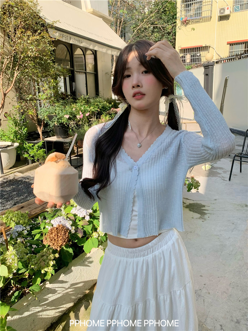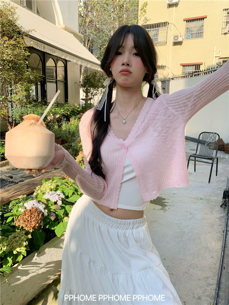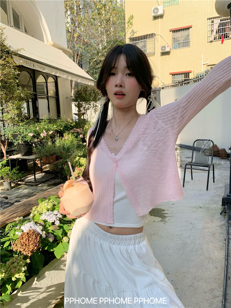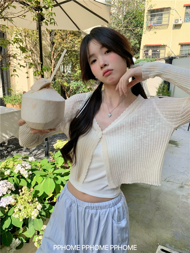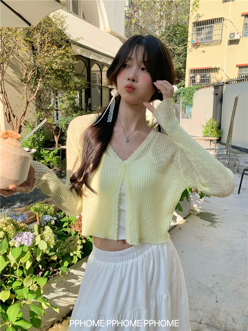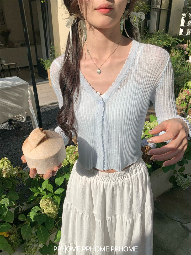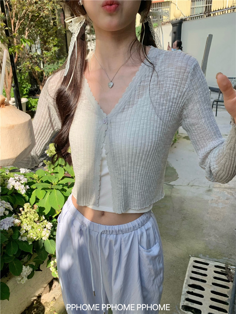 PPHOME домашний ~ ледяной шелк, открытая 𫔭 рубашка летняя легкая трикотажная с длинными рукавами открытая 𫔭 рубашка белая солнцезащитная блузка короткий топ для женщин