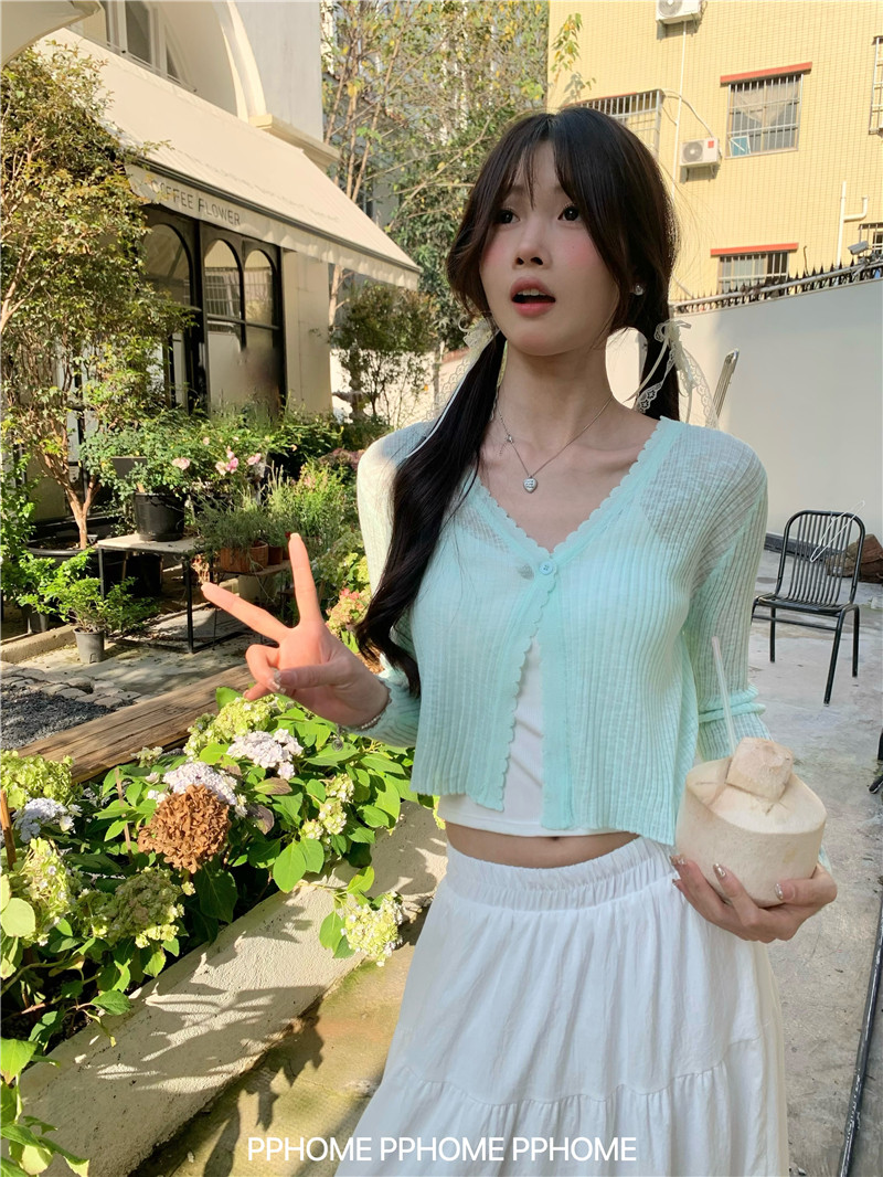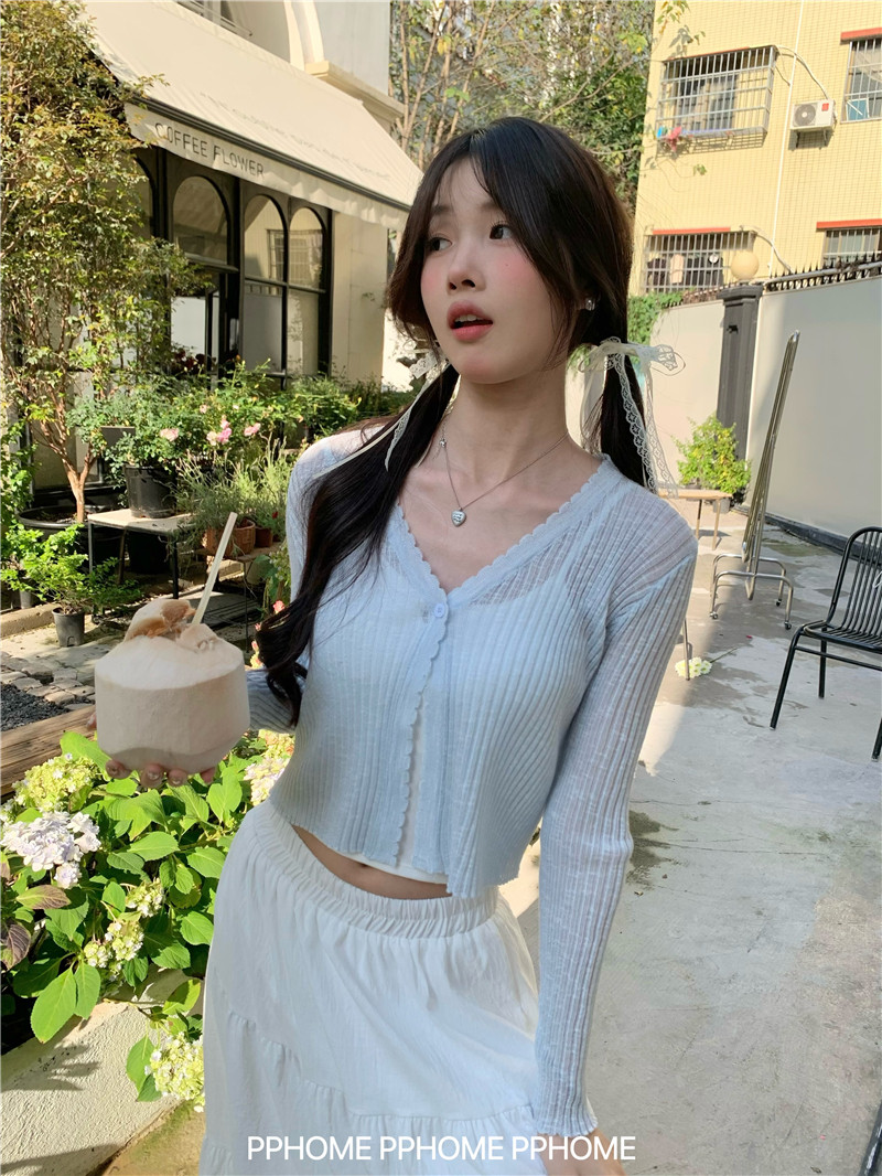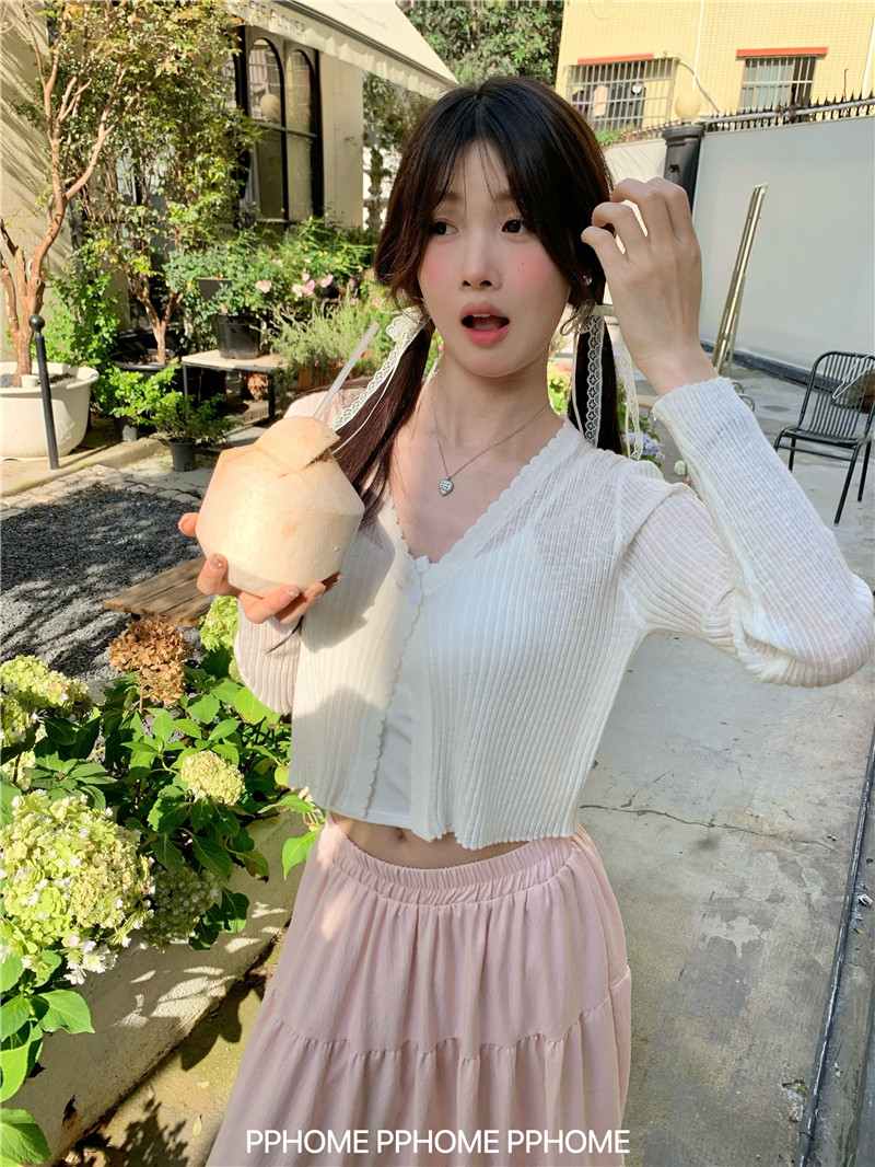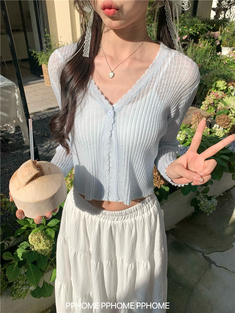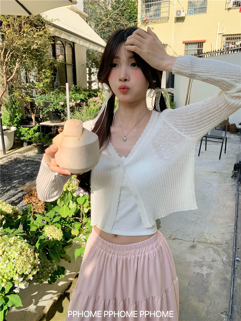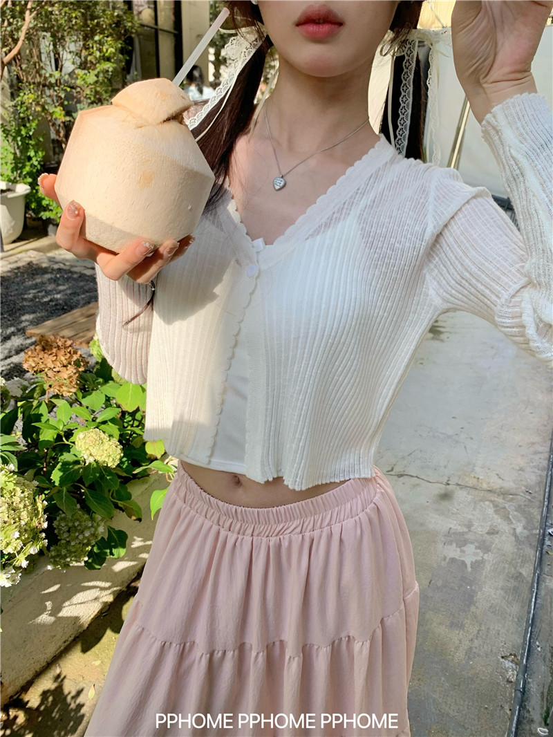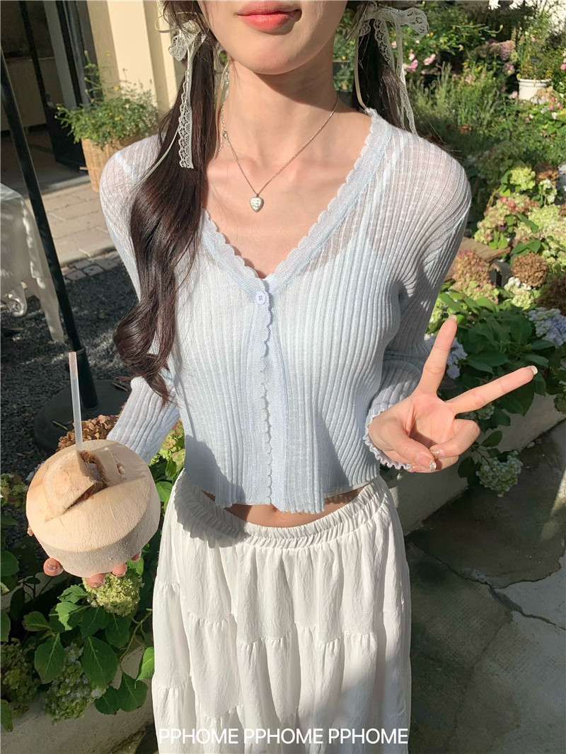 PPHOME домашний ~ ледяной шелк, открытая 𫔭 рубашка летняя легкая трикотажная с длинными рукавами открытая 𫔭 рубашка белая солнцезащитная блузка короткий топ для женщин