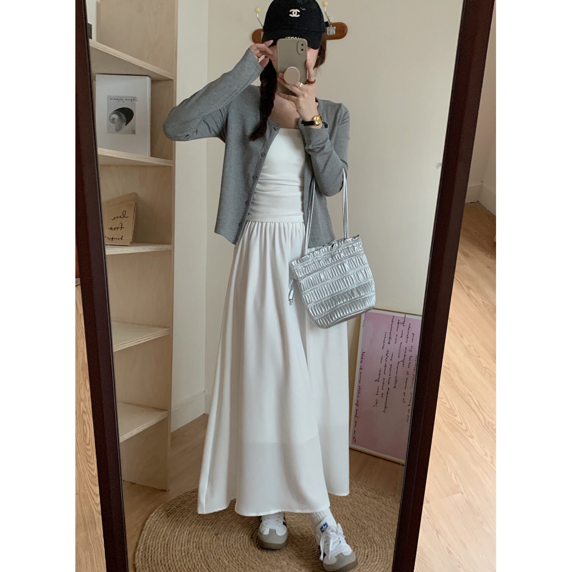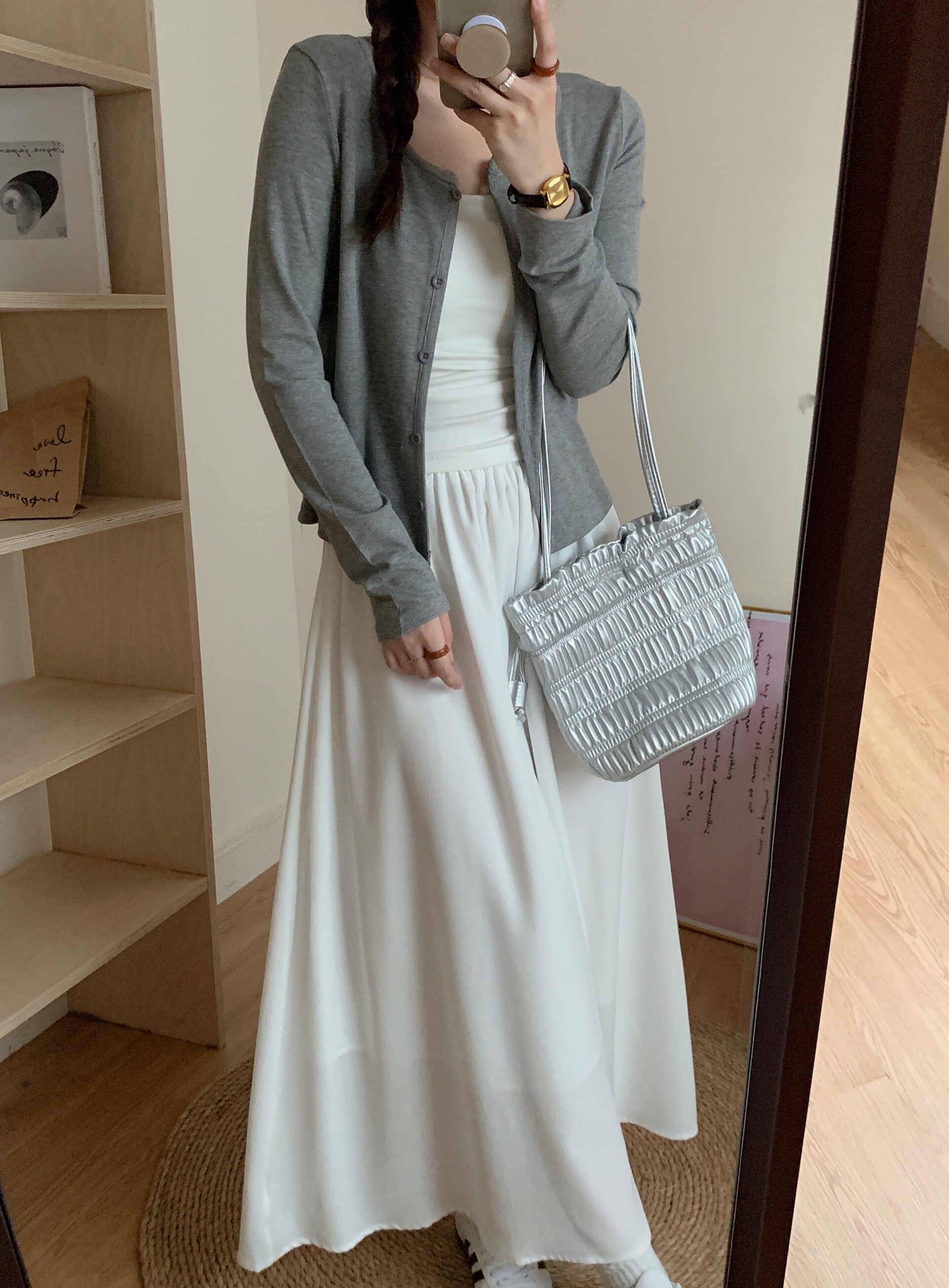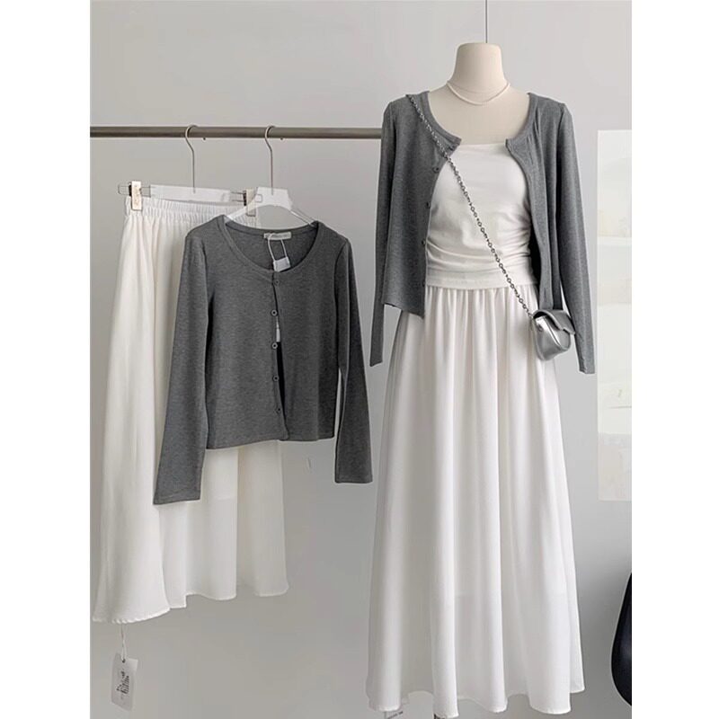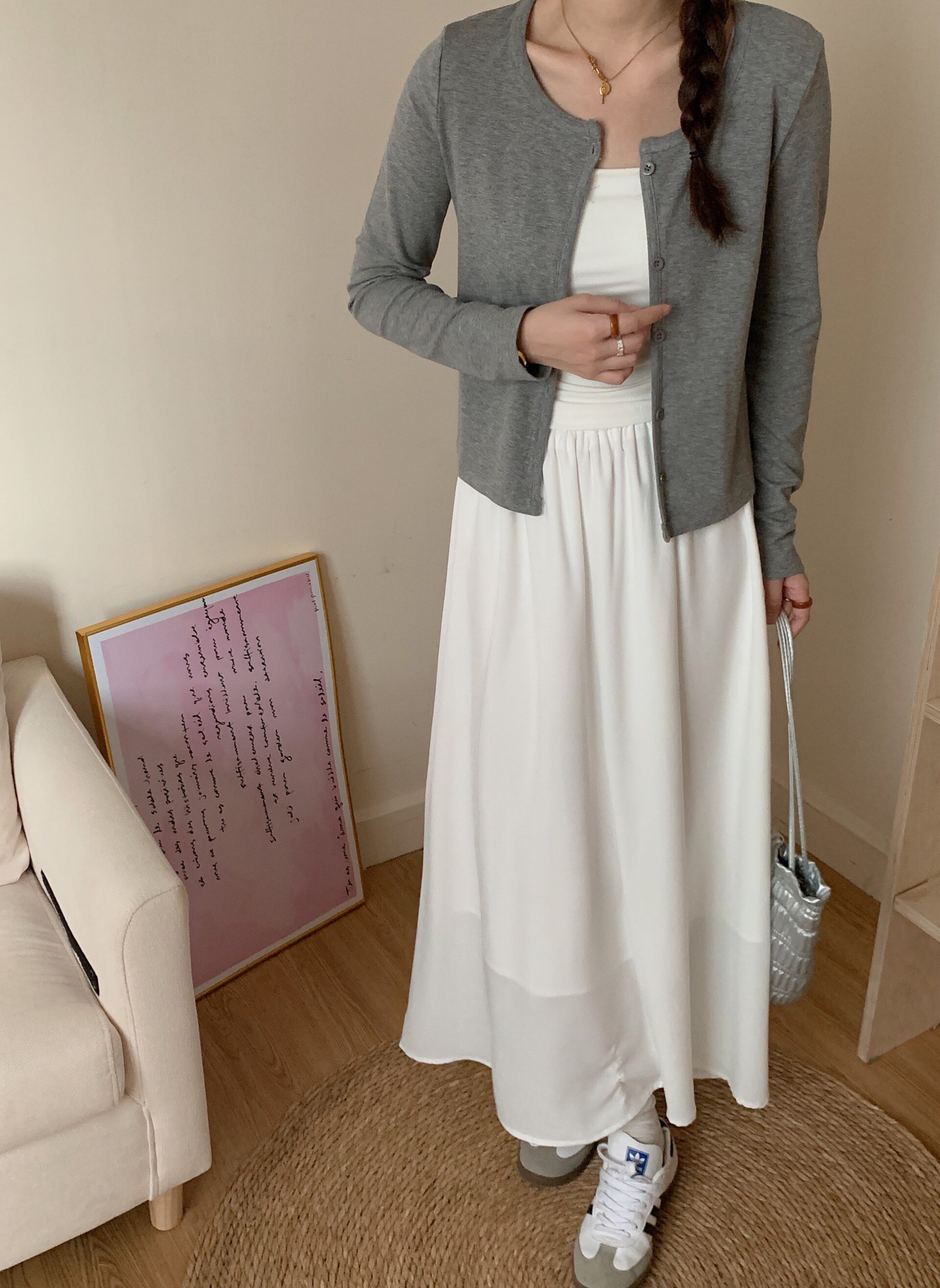 | Цвет: | Майка, Серый кардиган, Белая юбка |