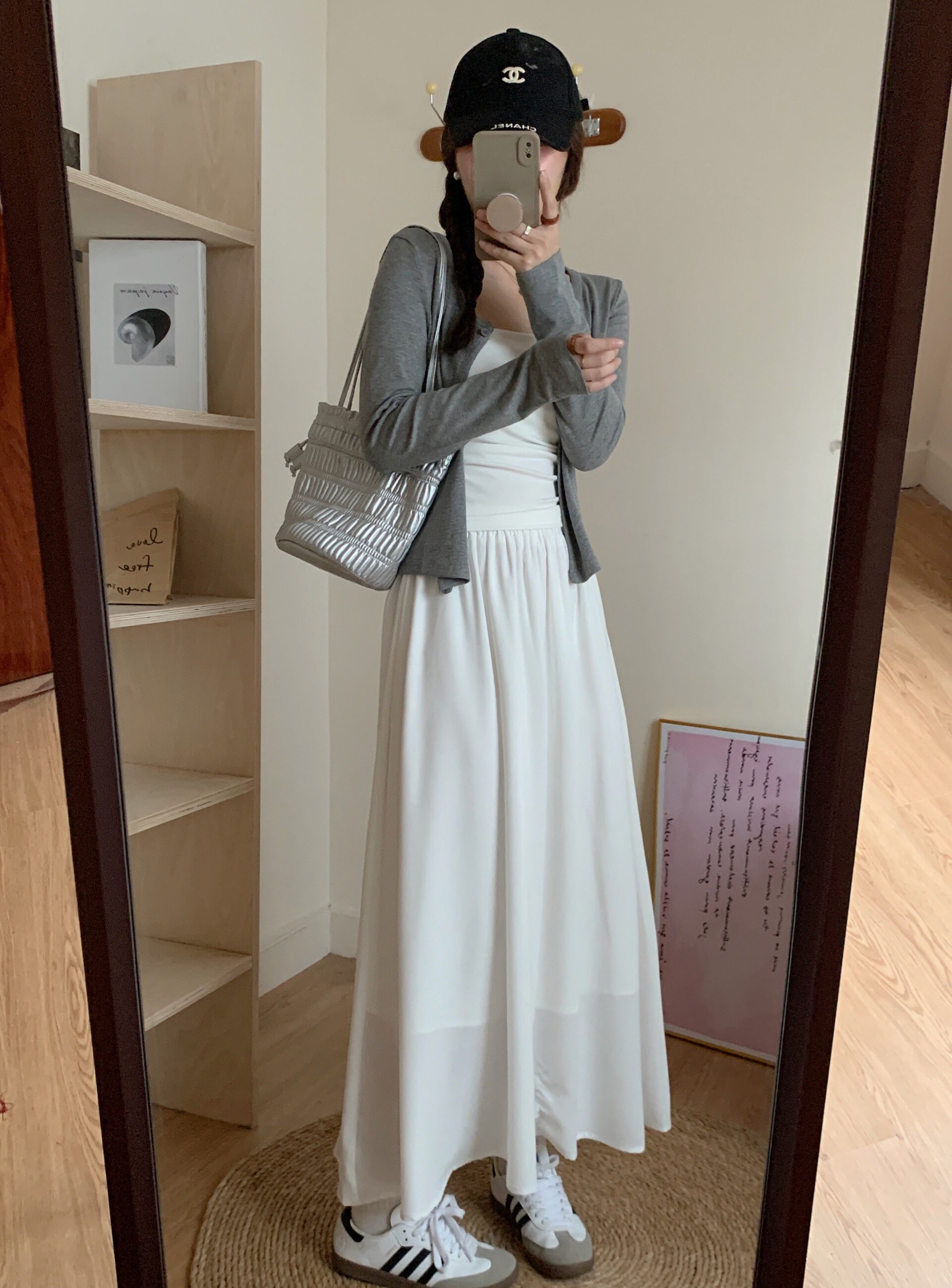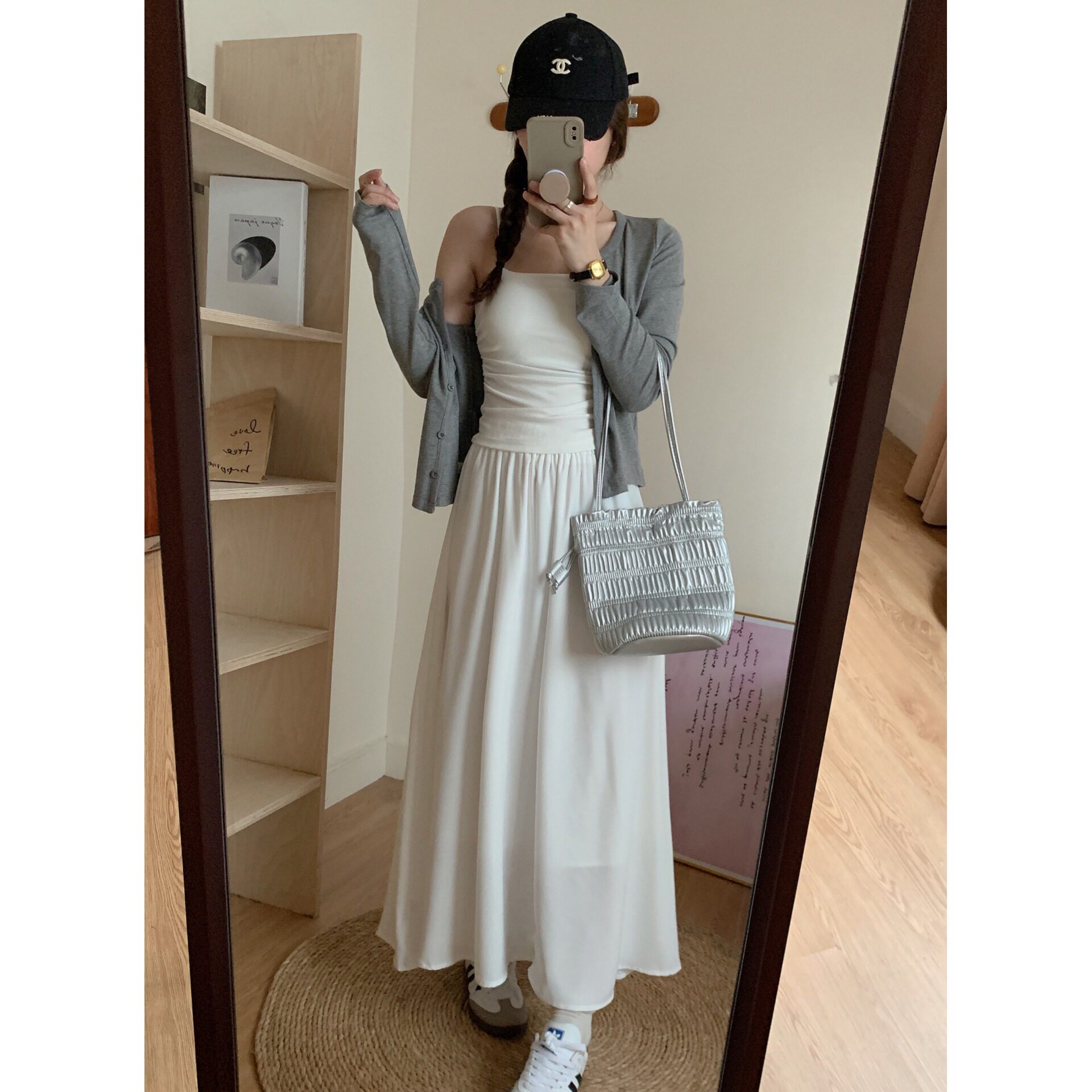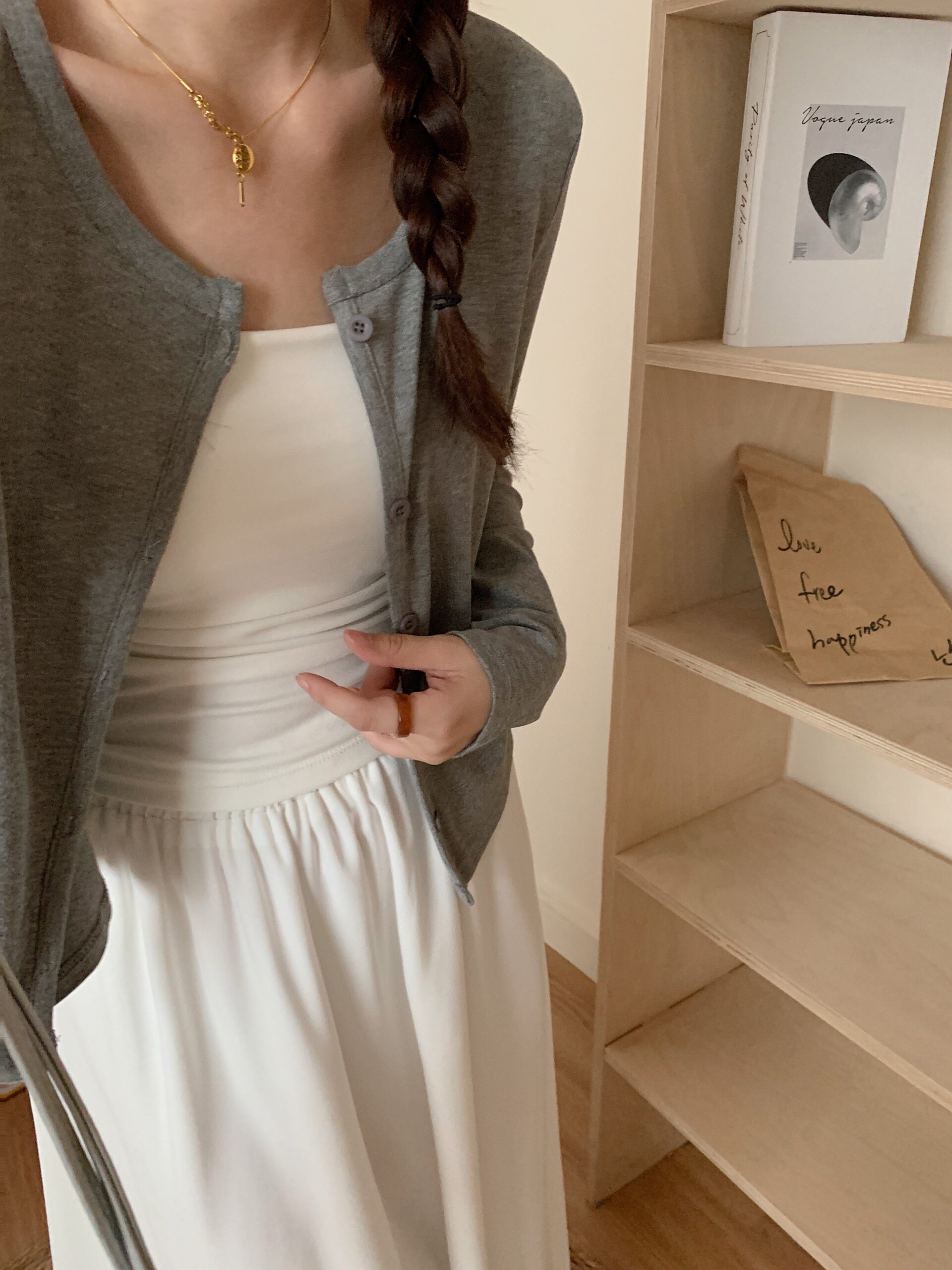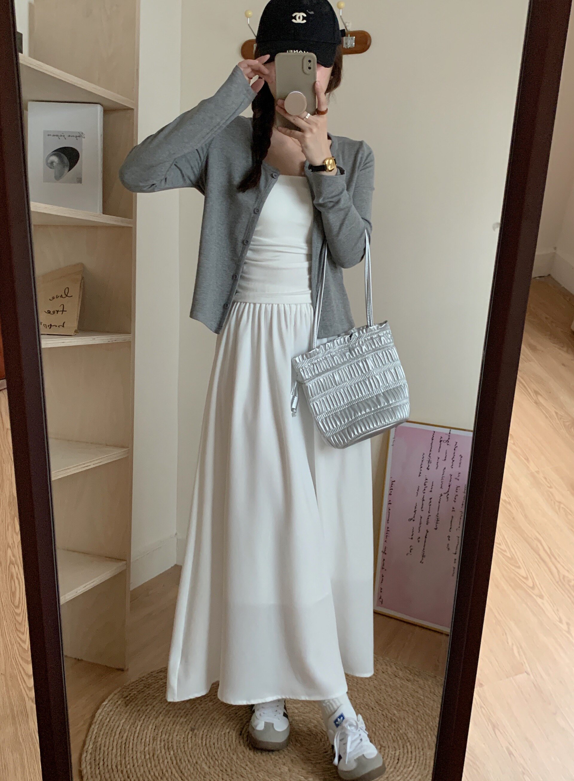 | Цвет: | Майка, Серый кардиган, Белая юбка |