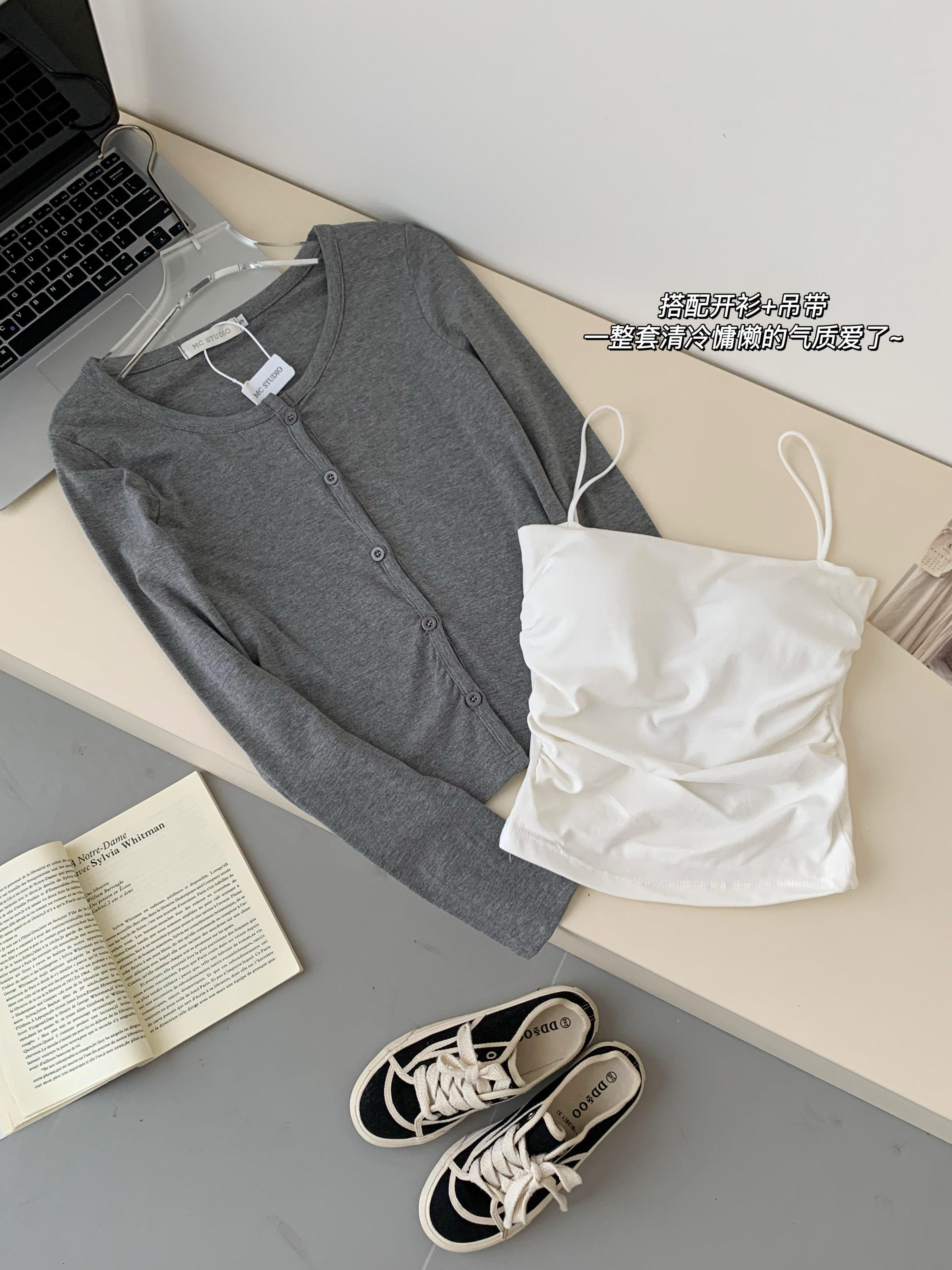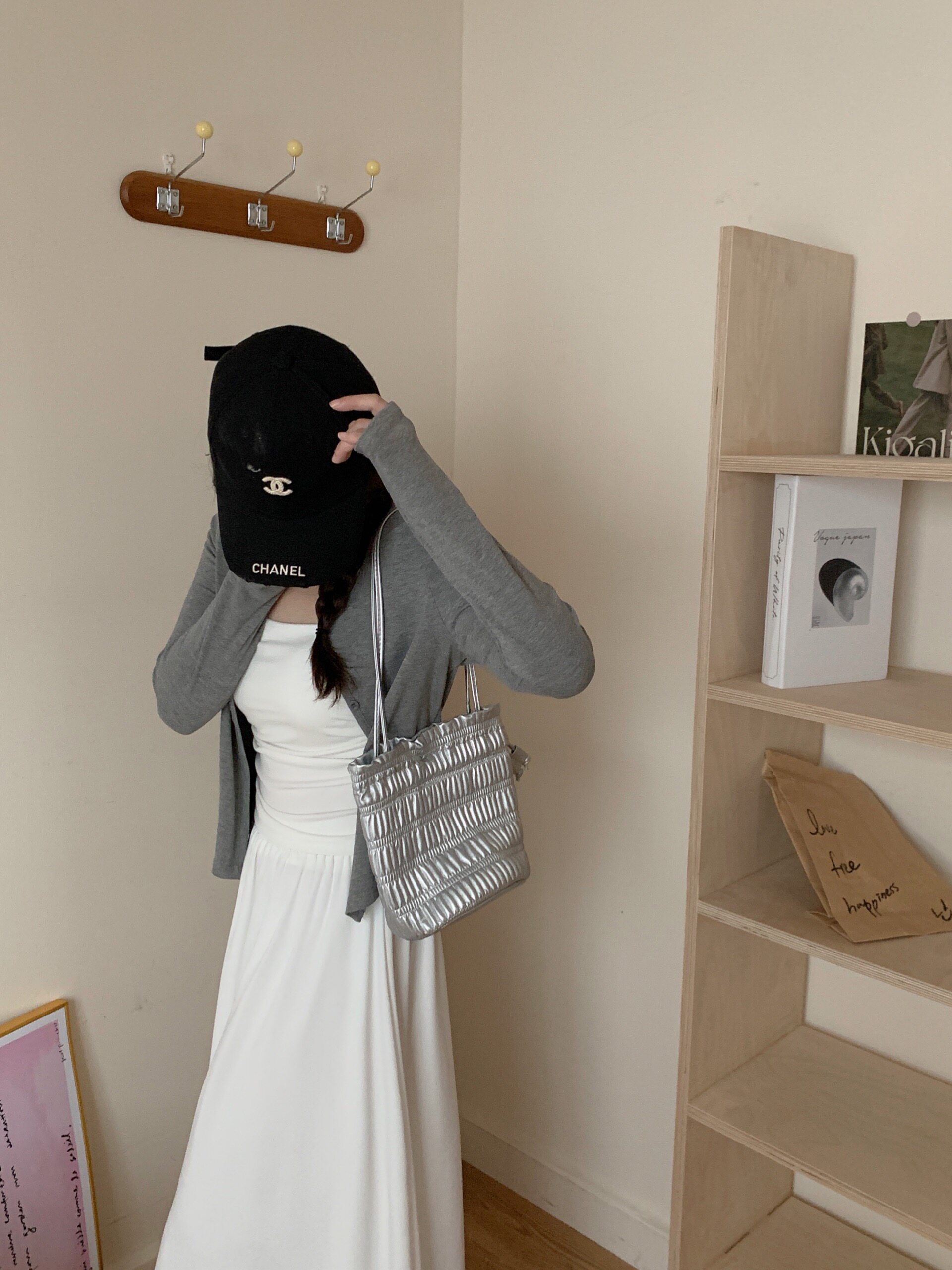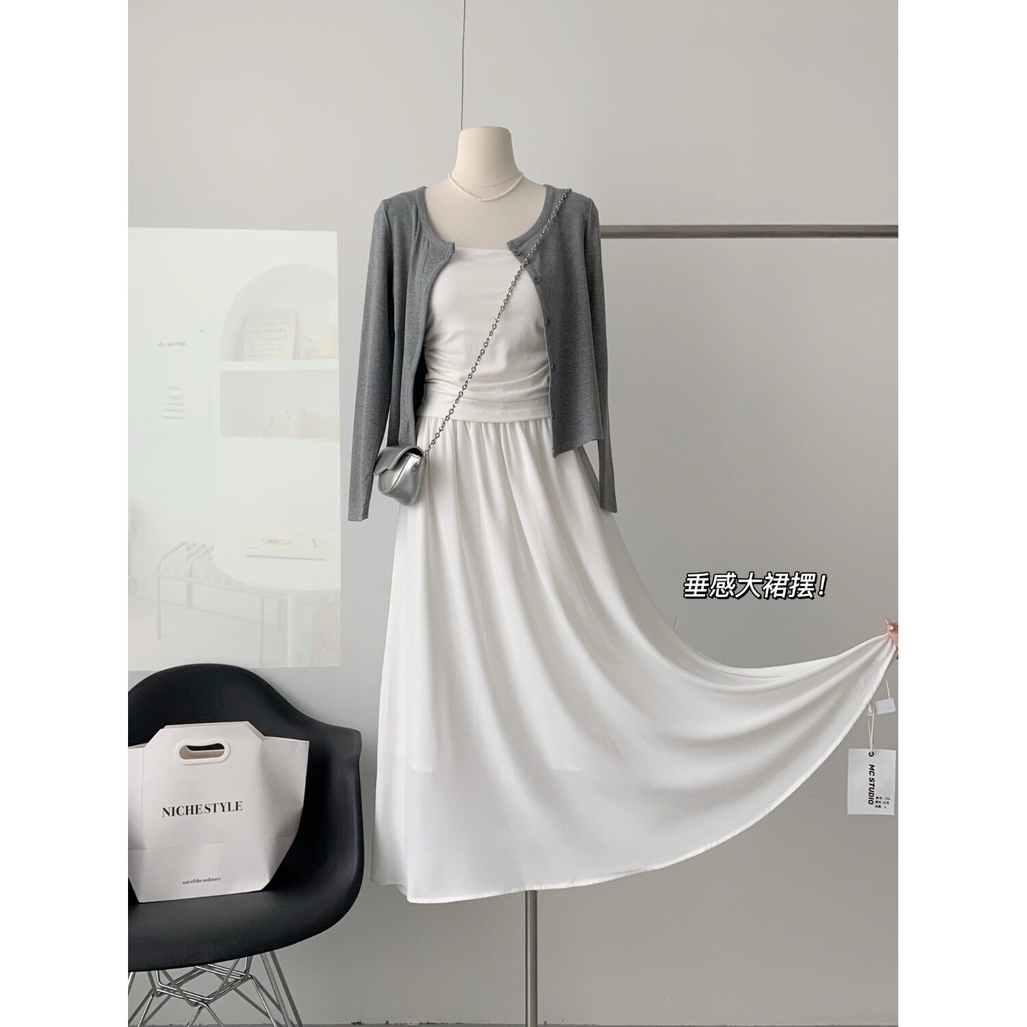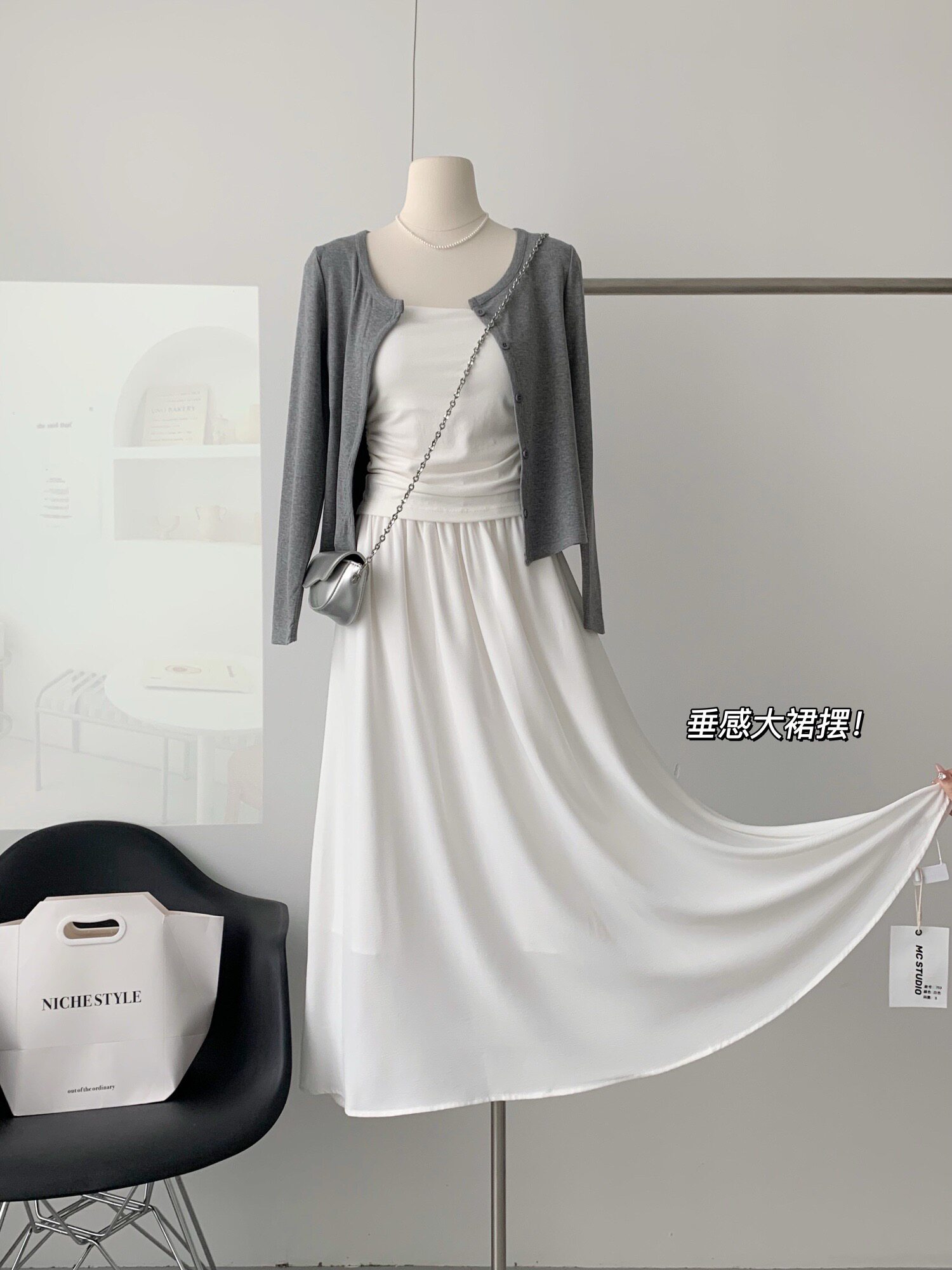 | Цвет: | Майка, Серый кардиган, Белая юбка |