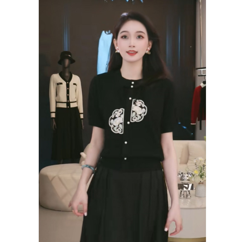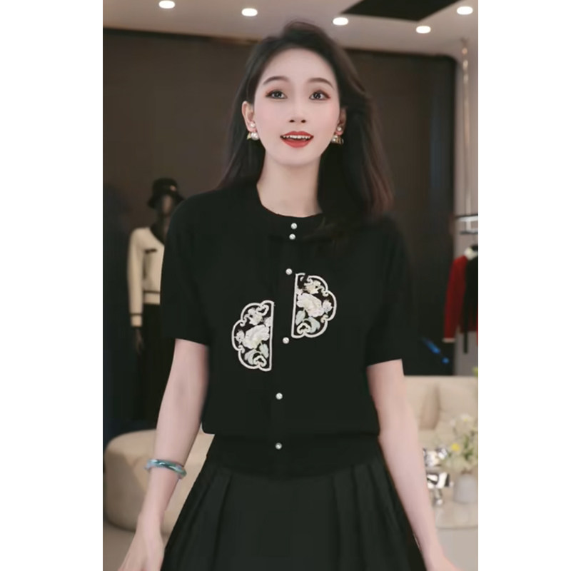 Трикотажный летний свитер, базовая приятная телу футболка, изысканный стиль, с вышивкой, яркий броский стиль, короткий рукав