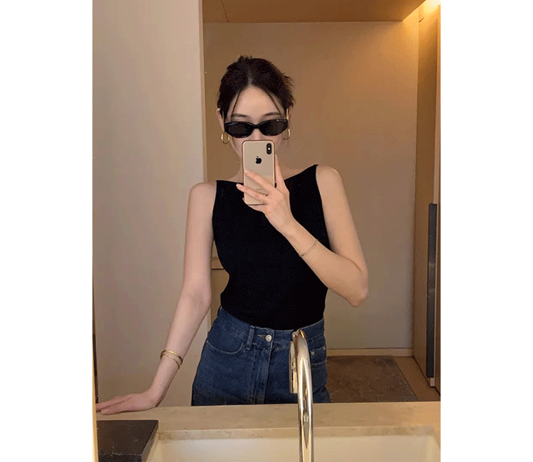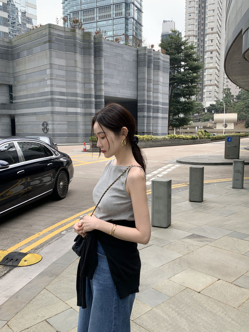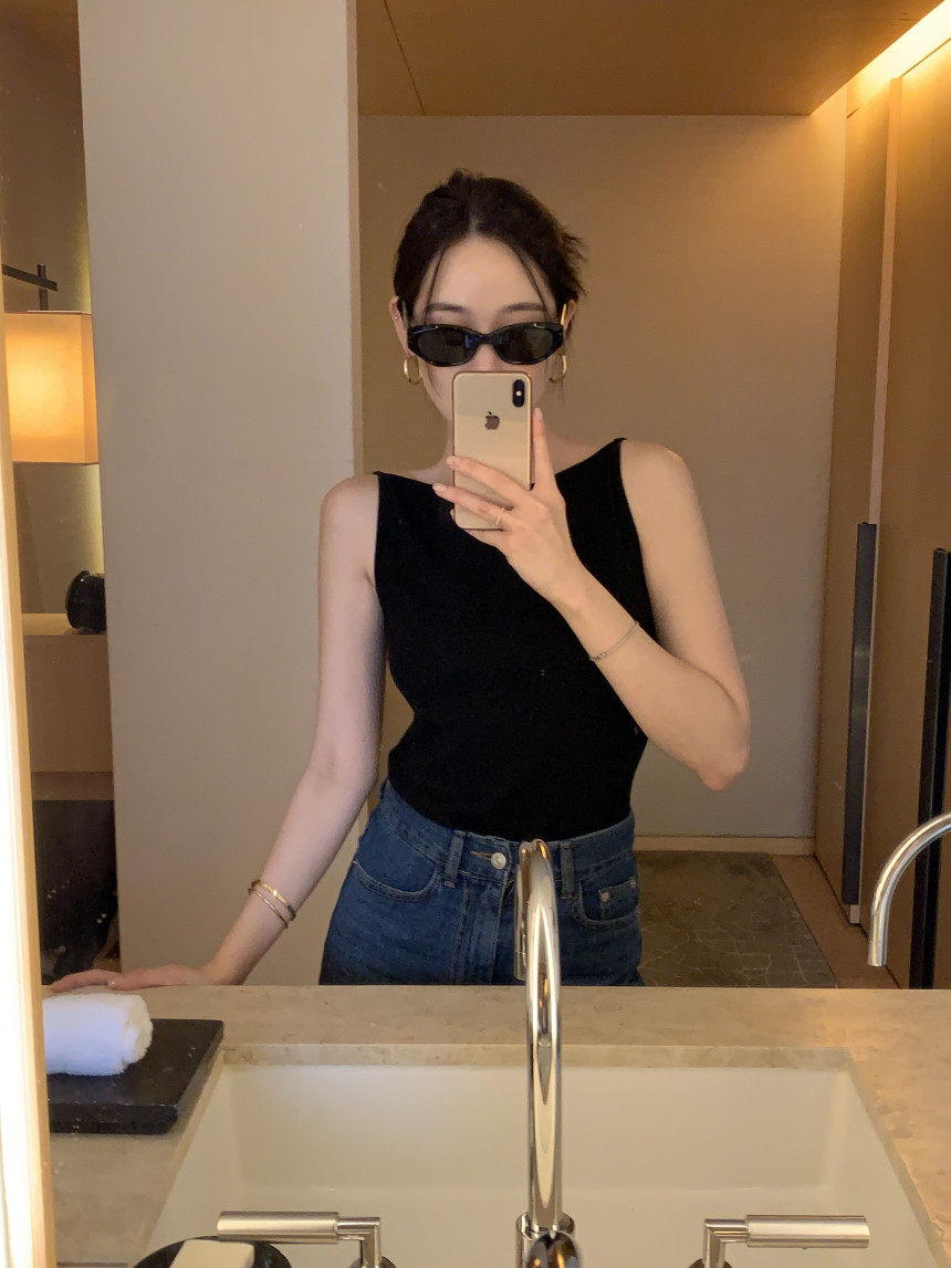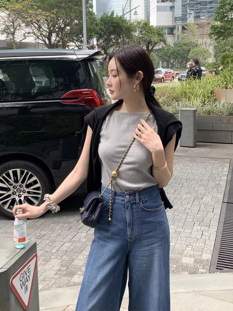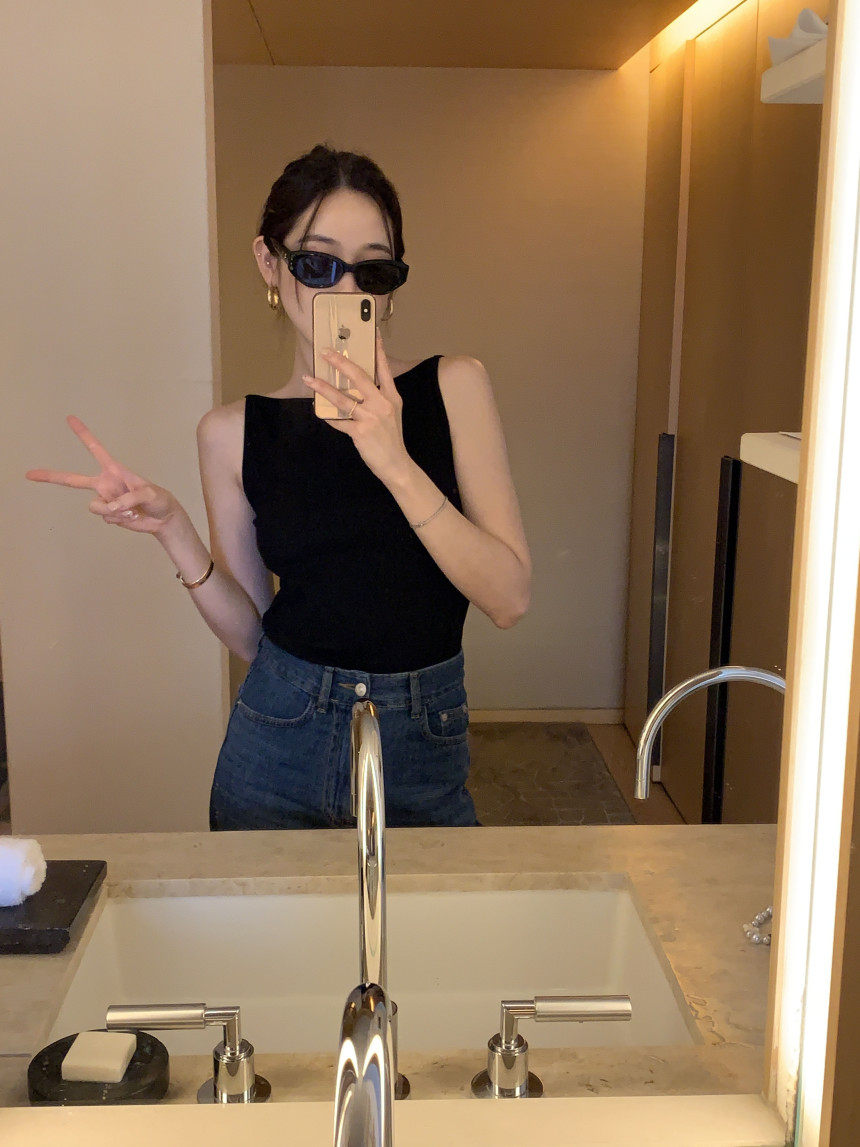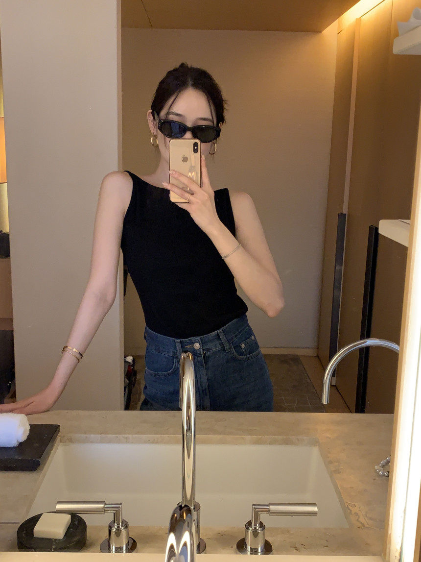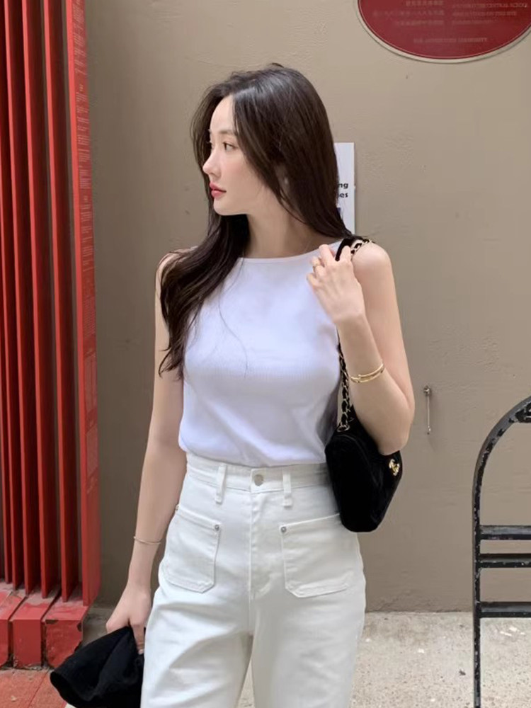 Черный трикотажный летний жилет без рукавов, приталенная майка топ, в корейском стиле, с открытой спиной