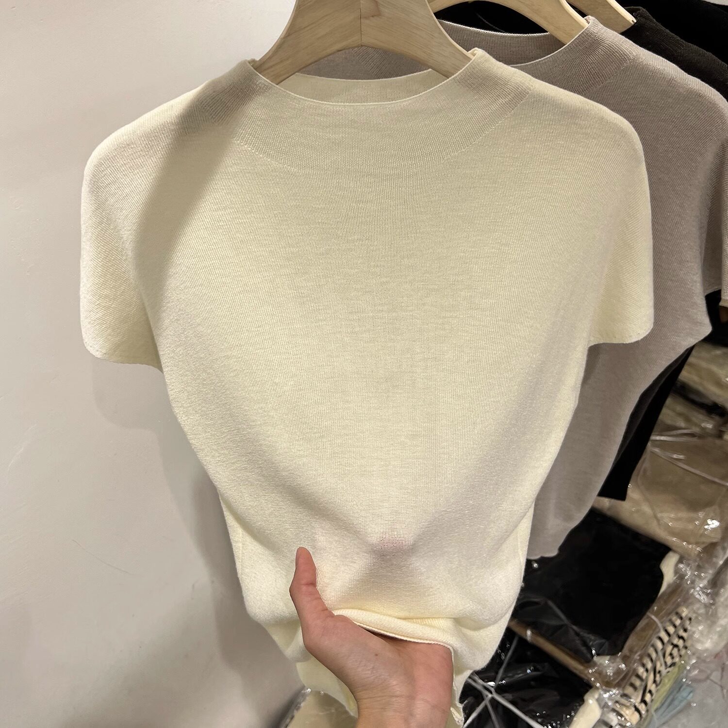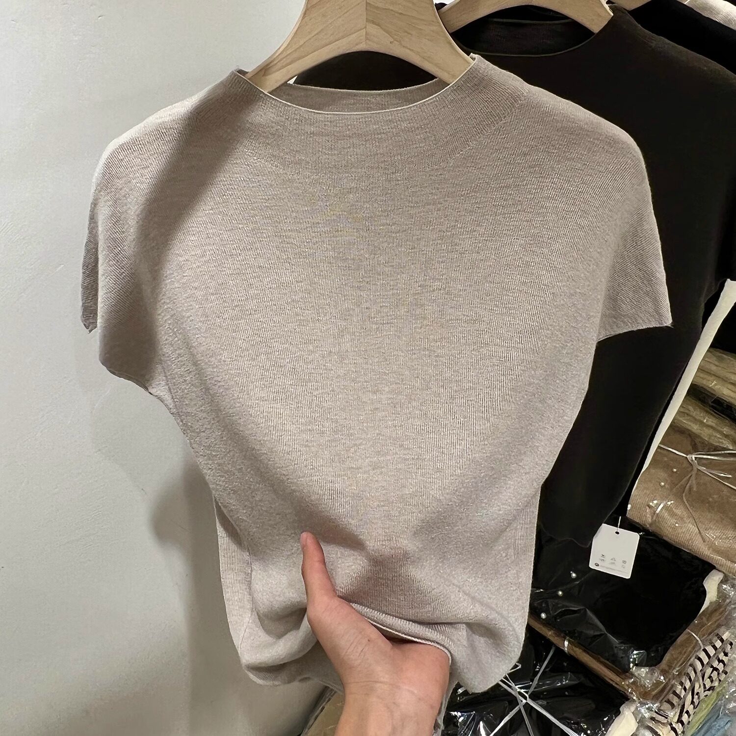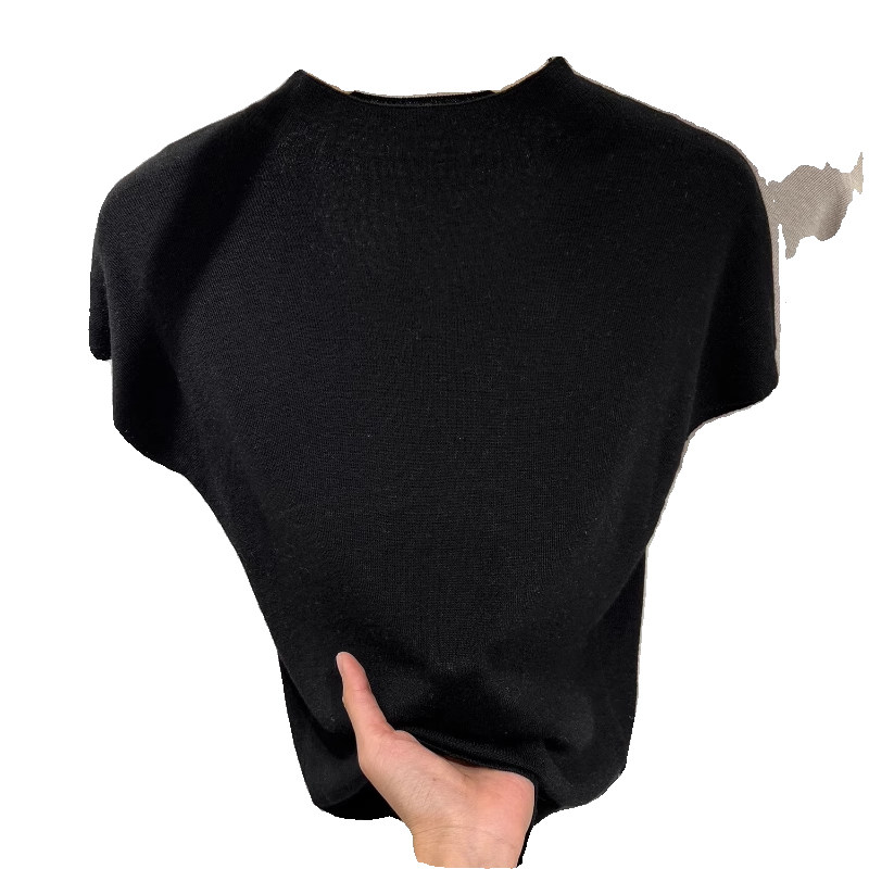 Трикотажный осенний тонкий приталенный свитер, базовая приятная телу короткая футболка, высокий воротник, короткий рукав, в западном стиле
