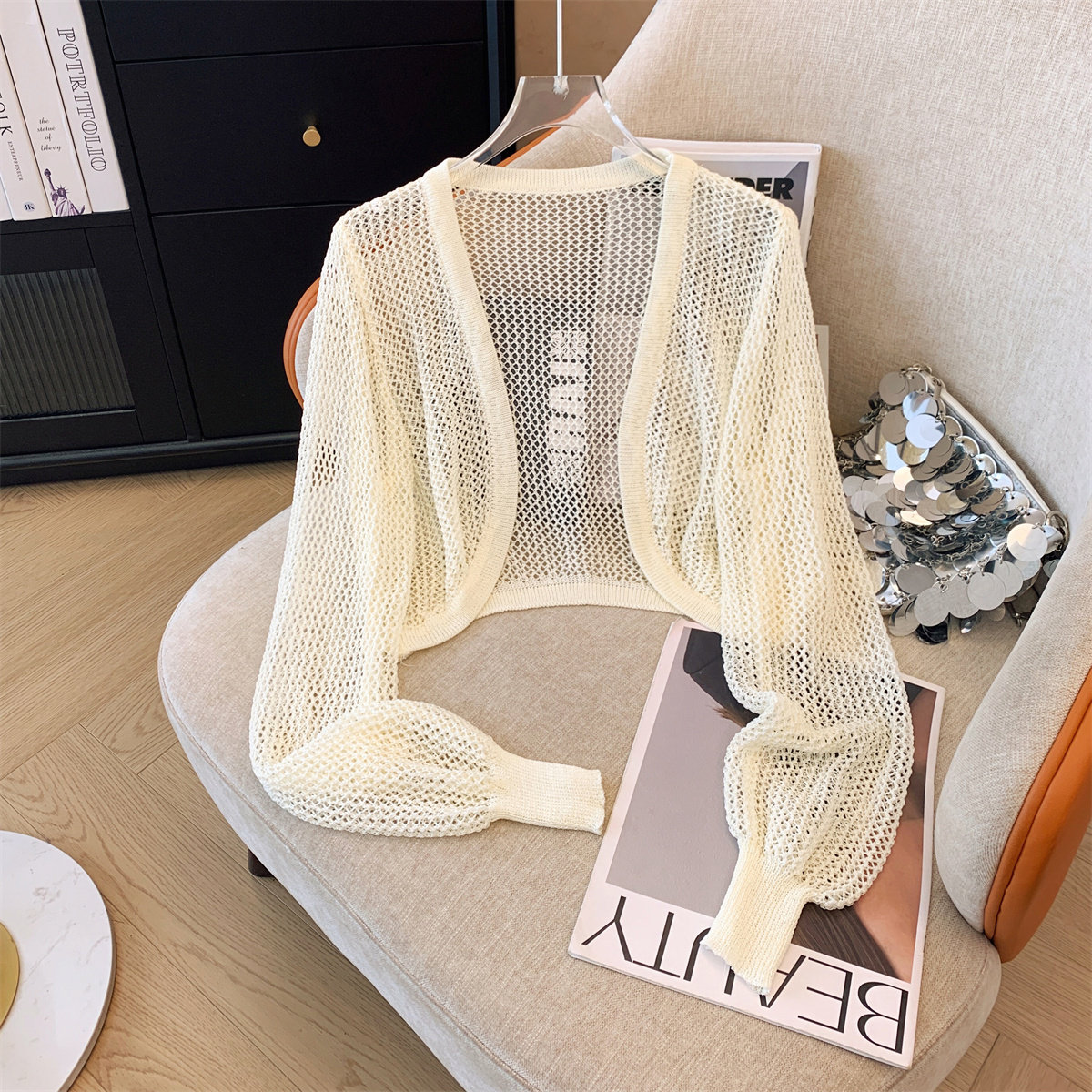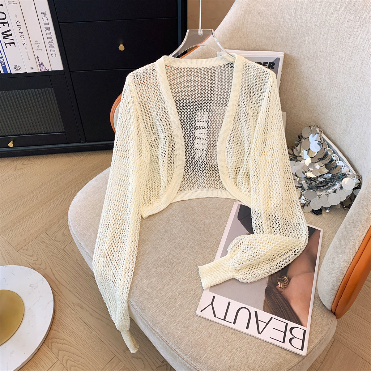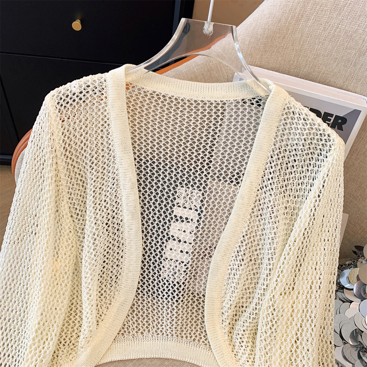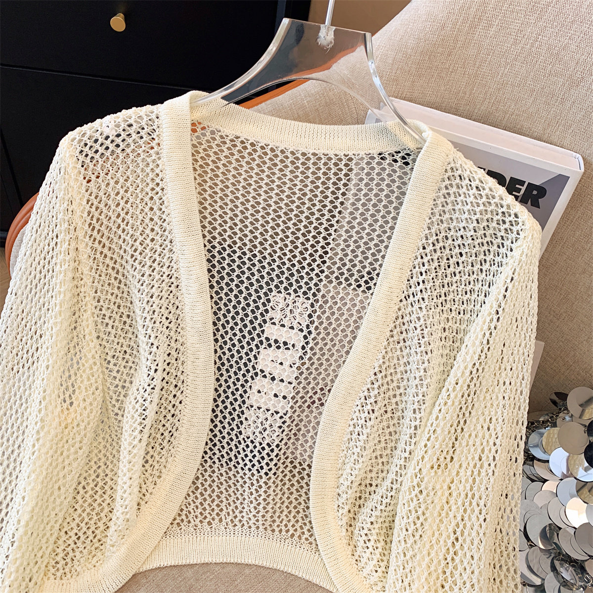 Трикотажный летний кардиган, короткая накидка, дизайнерский жилет, тренд сезона, защита от солнца