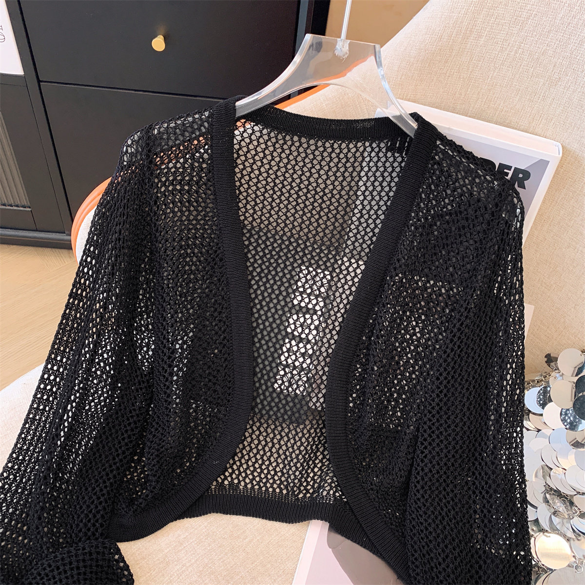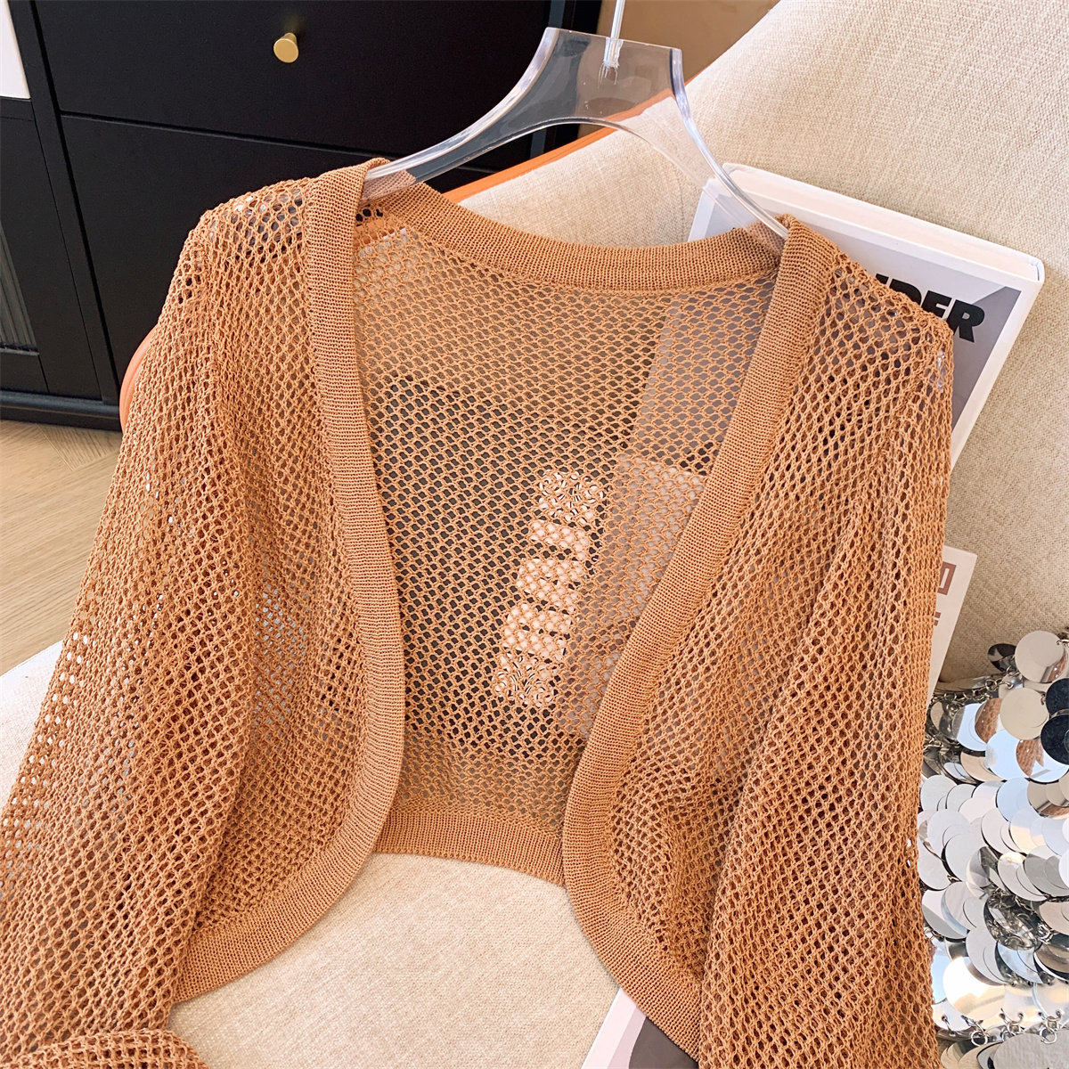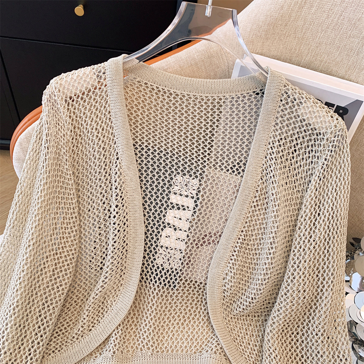 Трикотажный летний кардиган, короткая накидка, дизайнерский жилет, тренд сезона, защита от солнца