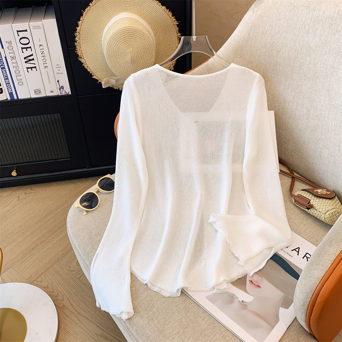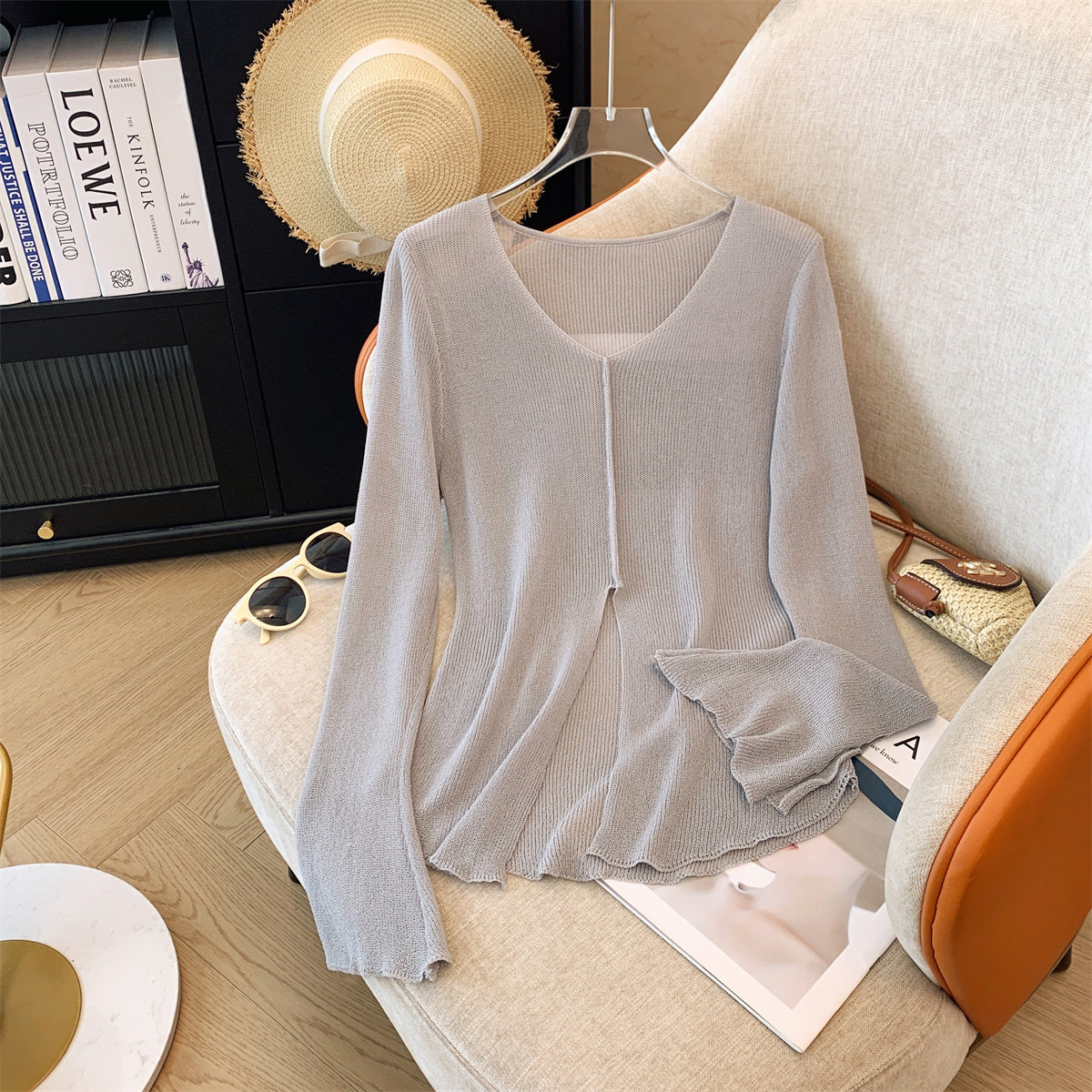 Шелковый трикотажный тонкий свитер, защита от солнца, защита от ультрафиолета, V-образный вырез, оверсайз