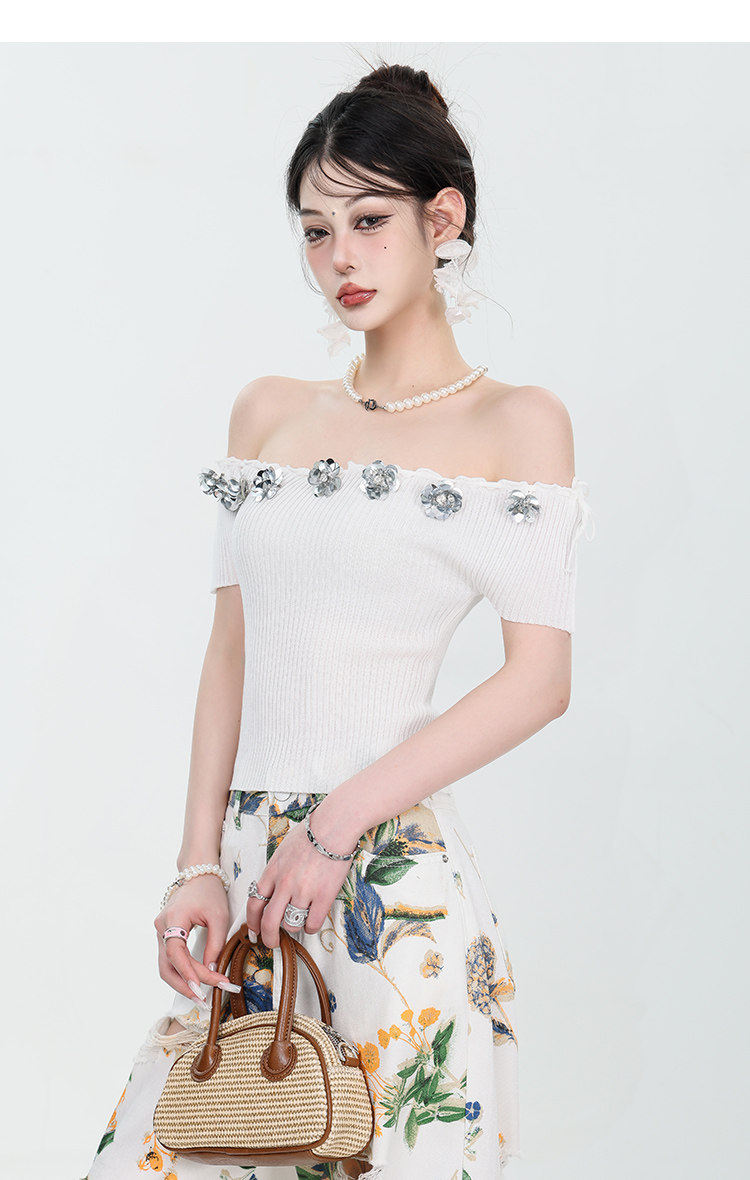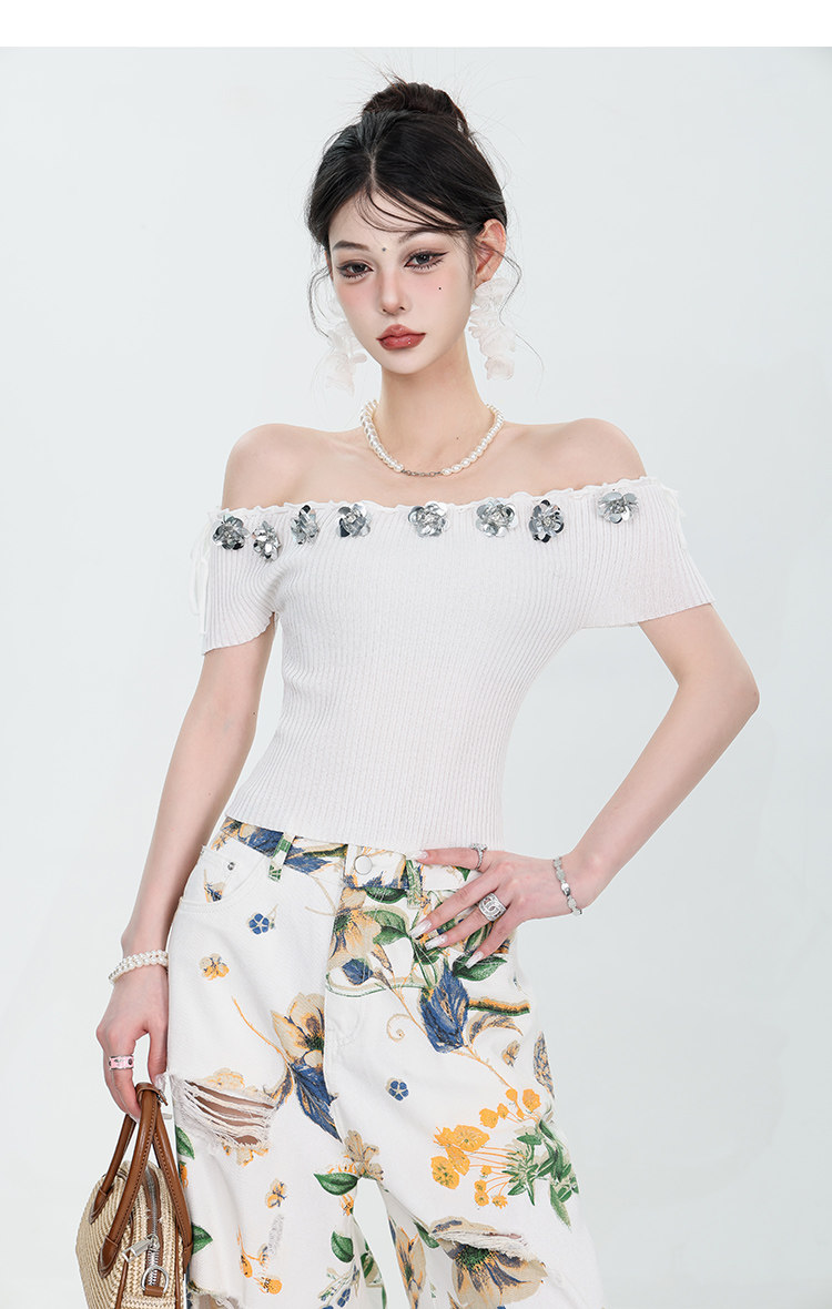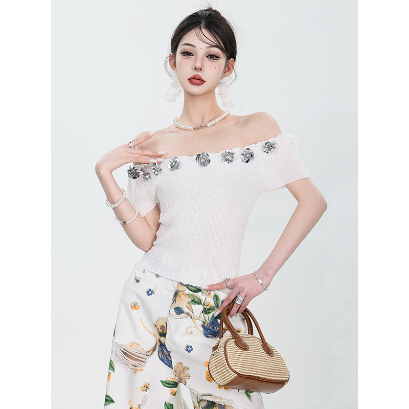 Abwear Summer New Corean Hot Girlless без спинка вязаная топ для женщин с трехмерными цветами тонкие короткие рукава