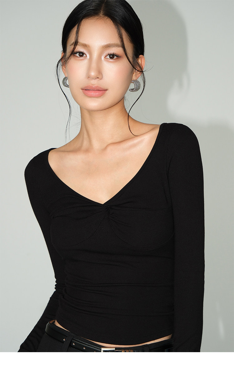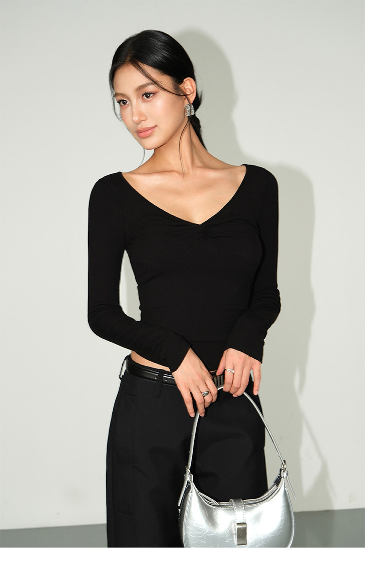 Черный лонгслив, рубашка, весенняя элегантная футболка, V-образный вырез, облегающий крой